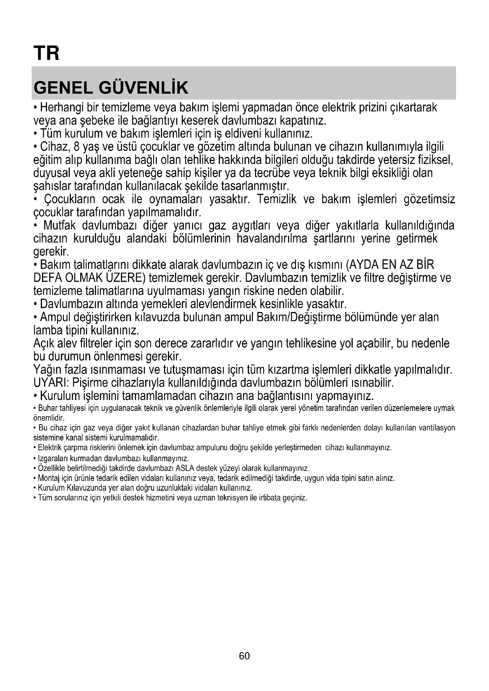 - Bir programlama cihazı, zamanlama cihazı, ayrı uzaktan kumanda veya otomatik olarak devreye giren herhangi başka bir donanımla birlikte kullanmayın. 3 yaşın altındaki çocukları cihazdan uzak tutun. Bir yetişkinin sürekli gözetimi altında olmadıkça cihazı 8 yaşındaki çocukların erişemeyecekleri yerlerde tutun. DİKKAT: Bu cihaz bir harici cihaz veya ayrı bir uzaktan kumanda sistemiyle çalıştırılmak üzere tasarlanmamıştır. Bu cihaz profesyonel kullanıma yönelik değildir. Cihazı açık alanda kullanmayın. Kişilerde yanık riskini önlemek için cihazın iki veya daha çok kişi tarafından taşınması ve kurulması gerekir. Su beslemesi (öngörülmüşse) için muhtemel rakorlar ve elektrik bağlantıları da dahil kurulum ve onarım işlemleri ehil personel tarafından yapılmalıdır. Boğulma riskini önlemek için kurulum tamamlandıktan sonra ambalajlama malzemelerini (plastik, polistirol parçalar, vb.) çocukların erişemeyecekleri yerlerde saklayın. . Ayaklarınız ıslak veya çıplakken cihazı kullanmayın. Cihazı kesinlikle buharlı temizlik amacıyla kullanmayın: elektrik çarpması riski mevcuttur. Ambalaj malzemeleri %100 oranında geri dönüştürülebilir ve üzerlerinde geri dönüşüm simgesi bulunur Kullanma kılavuzunda gösterilen şekillere nazaran davlumbazın farklı fonksiyonları olabilir, fakat kullanma tâlimatı, bakımı ve montajı aynı şekilde kalıyor. Bu el kitabında belirtilen talimatlara adım adım riayet ediniz. Üretici, bu el kitabında yar alan talimatlara riayet etmemekten kaynaklanan olası arızalara, sebep olunan hasar veya yangınlara ilişkin hiçbir sorumluluk kabul etmez. Davlumbaz yemek pişirilirken ortaya çıkan duman ve buharın çekilmesi amacıyla ve sadece evlerde kullanılmak üzere tasarlanmıştır.