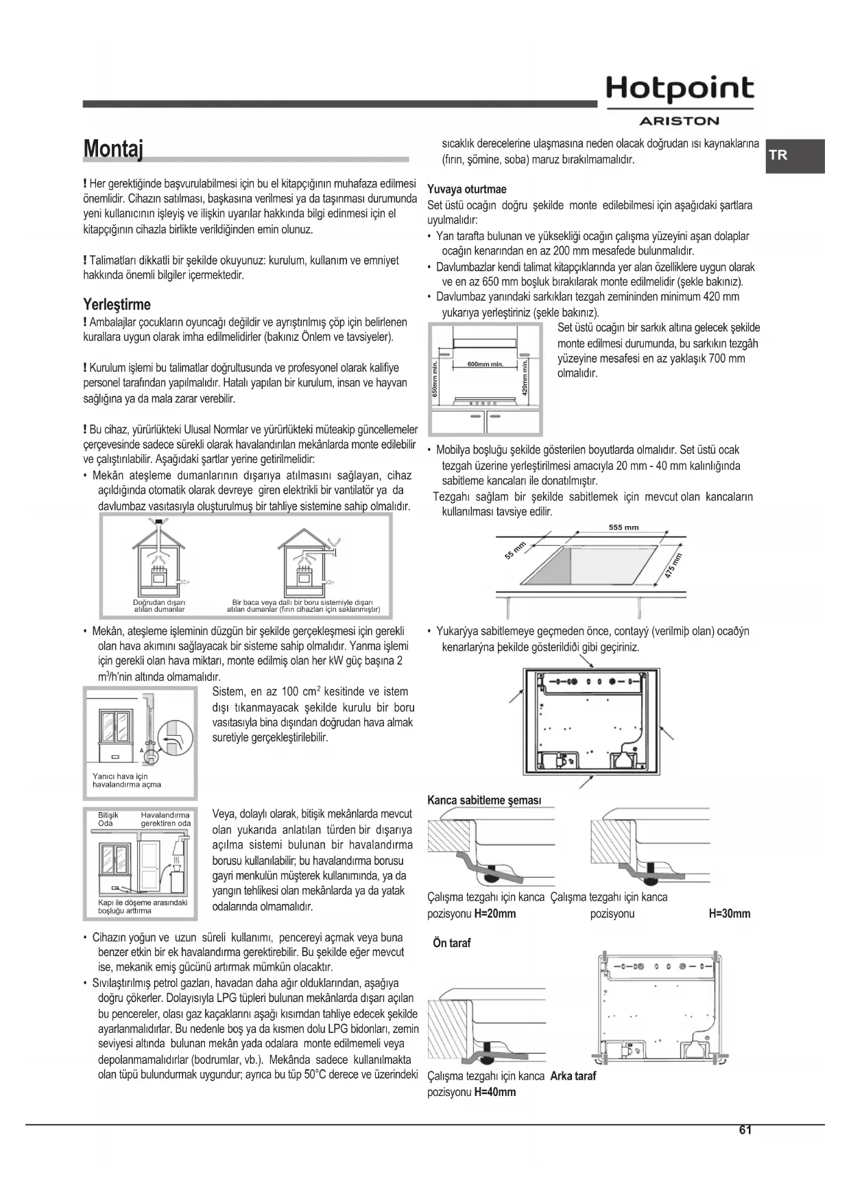 Yanıcı hava için havalandırma açmaKapı ile döşeme arasındaki boşluğu arttırmaBitişik Oda Havalandırma gerektiren oda sıcaklık derecelerine ulaşmasına neden olacak doğrudan ısı kaynaklarına (fırın, şömine, soba) maruz bırakılmamalıdır. Yuvaya oturtmae Set üstü ocağın doğru şekilde monte edilebilmesi için aşağıdaki şartlara uyulmalıdır: