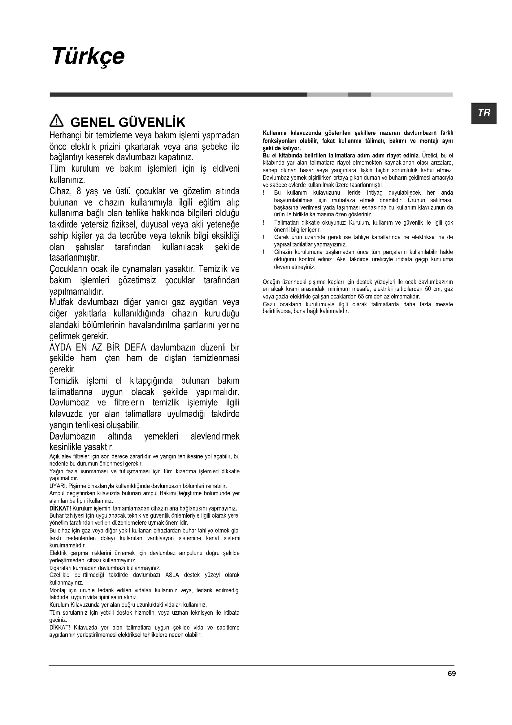 Herhangi bir temizleme veya bakım işlemi yapmadan önce elektrik prizini çıkartarak veya ana şebeke ile bağlantıyı keserek davlumbazı kapatınız. Tüm kurulum ve bakım işlemleri için iş eldiveni kullanınız. Cihaz, 8 yaş ve üstü çocuklar ve gözetim altında bulunan ve cihazın kullanımıyla ilgili eğitim alıp kullanıma bağlı olan tehlike hakkında bilgileri olduğu takdirde yetersiz fiziksel, duyusal veya akli yeteneğe sahip kişiler ya da tecrübe veya teknik bilgi eksikliği olan şahıslar tarafından kullanılacak şekilde tasarlanmıştır. Çocukların ocak ile oynamaları yasaktır. Temizlik ve bakım işlemleri gözetimsiz çocuklar tarafından yapılmamalıdır. Mutfak davlumbazı diğer yanıcı gaz aygıtları veya diğer yakıtlarla kullanıldı ğı nda cihazın kurulduğu alandaki bölümlerinin havalandırılma şartlarını yerine getirmek gerekir. AYDA EN AZ BİR DEFA davlumbazın düzenli bir şekilde hem içten hem de dı ştan temizlenmesi gerekir. Temizlik işlemi el kitapçığında bulunan bakım talimatlarına uygun olacak şekilde yapılmalıdır. Davlumbaz ve filtrelerin temizlik işlemiyle ilgili kılavuzda yer alan talimatlara uyulmadığı takdirde yangın tehlikesi oluşabilir. Davlumbazın altında yemekleri alevlendirmek kesinlikle yasaktır. Açık alev filtreler için son derece zararlıdır ve yangın tehlikesine yol açabilir, bu nedenle bu durumun önlenmesi gerekir. Yağın fazla ısınmaması ve tutuşmaması için tüm kızartma işlemleri dikkatle yapılmalıdır. UYARI: Pişirme cihazlarıyla kullanıldığında davlumbazın bölümleri ısınabilir. Ampul değiştirirken kılavuzda bulunan ampul Bakım/Değiştirme bölümünde yer alan lamba tipini kullanınız. DİKKAT! Kurulum işlemini tamamlamadan cihazın ana bağlantısını yapmayınız. Buhar tahliyesi için uygulanacak teknik ve güvenlik önlemleriyle ilgili olarak yerel yönetim tarafından verilen düzenlemelere uymak önemlidir. Bu cihaz için gaz veya diğer yakıt kullanan cihazlardan buhar tahliye etmek gibi farkl ı nedenlerden dolayı kullanılan vantilasyon sistemine kanal sistemi kurulmamalıdır. Elektrik çarpma risklerini önlemek için davlumbaz ampulunu doğru şekilde yerleştirmeden cihazı kullanmayınız. Izgaraları kurmadan davlumbazı kullanmayınız. Özellikle belirtilmediği takdirde davlumbazı ASLA destek yüzeyi olarak kullanmayınız. Montaj için ürünle tedarik edilen vidaları kullanınız veya, tedarik edilmediği takdirde, uygun vida tipini satın alınız. Kurulum Kılavuzunda yer alan doğru uzunluktaki vidaları kullanınız. Tüm sorularınız için yetkili destek hizmetini veya uzman teknisyen ile irtibata geçiniz. DİKKAT! Kılavuzda yer alan talimatlara uygun şekilde vida ve sabitleme aygıtlarının yerleştirilmemesi elektriksel tehlikelere neden olabilir. Kullanma kılavuzunda gösterilen şekillere nazaran davlumbazı n farklı fonksiyonları olabilir, fakat kullanma tâlimatı, bakımı ve montajı aynı şekilde kalıyor. Bu el kitabında belirtilen talimatlara adım adım riayet ediniz. Üretici, bu el kitabında yar alan talimatlara riayet etmemekten kaynaklanan olası arızalara, sebep olunan hasar veya yangınlara ilişkin hiçbir sorumluluk kabul etmez. Davlumbaz yemek pişirilirken ortaya çıkan duman ve buharın çekilmesi amacıyla ve sadece evlerde kullanılmak üzere tasarlanmıştır. ! Bu kullanım kulavuzunu ileride ihtiyaç duyulabilecek her anda başvurulabilmesi için muhafaza etmek önemlidir. Ürünün satılması, başkasına verilmesi yada taşınması esnasında bu kullanım klavuzunun da ürün ile birlikte kalmasına özen gösteriniz. ! Talimatları dikkatle okuyunuz: Kurulum, kullanım ve güvenlik ile ilgili çok önemli bilgiler içerir. ! Gerek ürün üzerinde gerek ise tahliye kanallarında ne elektriksel ne de yapısal tadilatlar yapmayızını