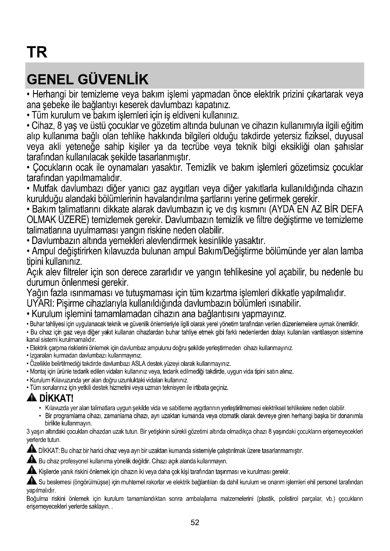 - Elektrik çarpma risklerini önlemek için davlumbaz ampulunu doğru şekilde yerleştirmeden cihazı kullanmayınız.