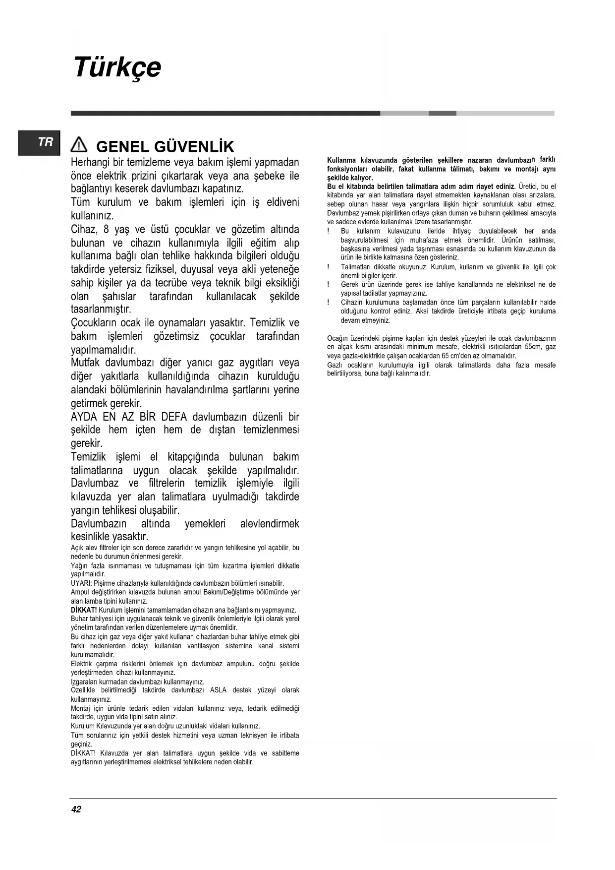 Herhangi bir temizleme veya bakım işlemi yapmadan önce elektrik prizini çıkartarak veya ana şebeke ile bağlantıyı keserek davlumbazı kapatınız. Tüm kurulum ve bakım işlemleri için iş eldiveni kullanınız. Cihaz, 8 yaş ve üstü çocuklar ve gözetim altında bulunan ve cihazın kullanımıyla ilgili eğitim alıp kullanıma bağlı olan tehlike hakkında bilgileri olduğu takdirde yetersiz fiziksel, duyusal veya akli yeteneğe sahip kişiler ya da tecrübe veya teknik bilgi eksikliği olan şahıslar tarafından kullanılacak şekilde tasarlanmıştır. Çocukların ocak ile oynamaları yasaktır. Temizlik ve bakım işlemleri gözetimsiz çocuklar tarafından yapılmamalıdır. Mutfak davlumbazı diğer yanıcı gaz aygıtları veya diğer yakıtlarla kullanıldı ğı nda cihazın kurulduğu alandaki bölümlerinin havalandırılma şartlarını yerine getirmek gerekir. AYDA EN AZ BİR DEFA davlumbazın düzenli bir şekilde hem içten hem de dı ştan temizlenmesi gerekir. Temizlik işlemi el kitapçığında bulunan bakım talimatlarına uygun olacak şekilde yapılmalıdır. Davlumbaz ve filtrelerin temizlik işlemiyle ilgili kılavuzda yer alan talimatlara uyulmadığı takdirde yangın tehlikesi oluşabilir. Davlumbazın altında yemekleri alevlendirmek kesinlikle yasaktır. Açık alev filtreler için son derece zararlıdır ve yangın tehlikesine yol açabilir, bu nedenle bu durumun önlenmesi gerekir. Yağın fazla ısınmaması ve tutuşmaması için tüm kızartma işlemleri dikkatle yapılmalıdır. UYARI: Pişirme cihazlarıyla kullanıldığında davlumbazın bölümleri ısınabilir. Ampul değiştirirken kılavuzda bulunan ampul Bakım/Değiştirme bölümünde yer alan lamba tipini kullanınız. DİKKAT! Kurulum işlemini tamamlamadan cihazın ana bağlantısını yapmayınız. Buhar tahliyesi için uygulanacak teknik ve güvenlik önlemleriyle ilgili olarak yerel yönetim tarafından verilen düzenlemelere uymak önemlidir. Bu cihaz için gaz veya diğer yakıt kullanan cihazlardan buhar tahliye etmek gibi farkl ı nedenlerden dolayı kullanılan vantilasyon sistemine kanal sistemi kurulmamalıdır. Elektrik çarpma risklerini önlemek için davlumbaz ampulunu doğru şekilde yerleştirmeden cihazı kullanmayınız. Izgaraları kurmadan davlumbazı kullanmayınız. Özellikle belirtilmediği takdirde davlumbazı ASLA destek yüzeyi olarak kullanmayınız. Montaj için ürünle tedarik edilen vidaları kullanınız veya, tedarik edilmediği takdirde, uygun vida tipini satın alınız. Kurulum Kılavuzunda yer alan doğru uzunluktaki vidaları kullanınız. Tüm sorularınız için yetkili destek hizmetini veya uzman teknisyen ile irtibata geçiniz. DİKKAT! Kılavuzda yer alan talimatlara uygun şekilde vida ve sabitleme aygıtlarının yerleştirilmemesi elektriksel tehlikelere neden olabilir. Kullanma kılavuzunda gösterilen şekillere nazaran davlumbazı n farklı fonksiyonları olabilir, fakat kullanma tâlimatı, bakımı ve montajı aynı şekilde kalıyor. Bu el kitabında belirtilen talimatlara adım adım riayet ediniz. Üretici, bu el kitabında yar alan talimatlara riayet etmemekten kaynaklanan olası arızalara, sebep olunan hasar veya yangınlara ilişkin hiçbir sorumluluk kabul etmez. Davlumbaz yemek pişirilirken ortaya çıkan duman ve buharın çekilmesi amacıyla ve sadece evlerde kullanılmak üzere tasarlanmıştır. ! Bu kullanım kulavuzunu ileride ihtiyaç duyulabilecek her anda başvurulabilmesi için muhafaza etmek önemlidir. Ürünün satılması, başkasına verilmesi yada taşınması esnasında bu kullanım klavuzunun da ürün ile birlikte kalmasına özen gösteriniz. ! Talimatları dikkatle okuyunuz: Kurulum, kullanım ve güvenlik ile ilgili çok önemli bilgiler içerir. ! Gerek ürün üzerinde gerek ise tahliye kanallarında ne elektriksel ne de yapısal tadilatlar yapmayızını