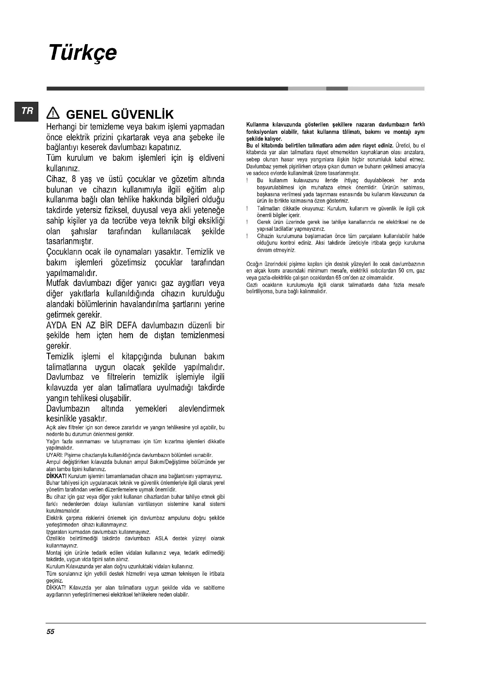 Herhangi bir temizleme veya bakım işlemi yapmadan önce elektrik prizini çıkartarak veya ana şebeke ile bağlantıyı keserek davlumbazı kapatınız. Tüm kurulum ve bakım işlemleri için iş eldiveni kullanınız. Cihaz, 8 yaş ve üstü çocuklar ve gözetim altında bulunan ve cihazın kullanımıyla ilgili eğitim alıp kullanıma bağlı olan tehlike hakkında bilgileri olduğu takdirde yetersiz fiziksel, duyusal veya akli yeteneğe sahip kişiler ya da tecrübe veya teknik bilgi eksikliği olan şahıslar tarafından kullanılacak şekilde tasarlanmıştır. Çocukların ocak ile oynamaları yasaktır. Temizlik ve bakım işlemleri gözetimsiz çocuklar tarafından yapılmamalıdır. Mutfak davlumbazı diğer yanıcı gaz aygıtları veya diğer yakıtlarla kullanıldı ğı nda cihazın kurulduğu alandaki bölümlerinin havalandırılma şartlarını yerine getirmek gerekir. AYDA EN AZ BİR DEFA davlumbazın düzenli bir şekilde hem içten hem de dı ştan temizlenmesi gerekir. Temizlik işlemi el kitapçığında bulunan bakım talimatlarına uygun olacak şekilde yapılmalıdır. Davlumbaz ve filtrelerin temizlik işlemiyle ilgili kılavuzda yer alan talimatlara uyulmadığı takdirde yangın tehlikesi oluşabilir. Davlumbazın altında yemekleri alevlendirmek kesinlikle yasaktır. Açık alev filtreler için son derece zararlıdır ve yangın tehlikesine yol açabilir, bu nedenle bu durumun önlenmesi gerekir. Yağın fazla ısınmaması ve tutuşmaması için tüm kızartma işlemleri dikkatle yapılmalıdır. UYARI: Pişirme cihazlarıyla kullanıldığında davlumbazın bölümleri ısınabilir. Ampul değiştirirken kılavuzda bulunan ampul Bakım/Değiştirme bölümünde yer alan lamba tipini kullanınız. DİKKAT! Kurulum işlemini tamamlamadan cihazın ana bağlantısını yapmayınız. Buhar tahliyesi için uygulanacak teknik ve güvenlik önlemleriyle ilgili olarak yerel yönetim tarafından verilen düzenlemelere uymak önemlidir. Bu cihaz için gaz veya diğer yakıt kullanan cihazlardan buhar tahliye etmek gibi farkl ı nedenlerden dolayı kullanılan vantilasyon sistemine kanal sistemi kurulmamalıdır. Elektrik çarpma risklerini önlemek için davlumbaz ampulunu doğru şekilde yerleştirmeden cihazı kullanmayınız. Izgaraları kurmadan davlumbazı kullanmayınız. Özellikle belirtilmediği takdirde davlumbazı ASLA destek yüzeyi olarak kullanmayınız. Montaj için ürünle tedarik edilen vidaları kullanınız veya, tedarik edilmediği takdirde, uygun vida tipini satın alınız. Kurulum Kılavuzunda yer alan doğru uzunluktaki vidaları kullanınız. Tüm sorularınız için yetkili destek hizmetini veya uzman teknisyen ile irtibata geçiniz. DİKKAT! Kılavuzda yer alan talimatlara uygun şekilde vida ve sabitleme aygıtlarının yerleştirilmemesi elektriksel tehlikelere neden olabilir. Kullanma kılavuzunda gösterilen şekillere nazaran davlumbazı n farklı fonksiyonları olabilir, fakat kullanma tâlimatı, bakımı ve montajı aynı şekilde kalıyor. Bu el kitabında belirtilen talimatlara adım adım riayet ediniz. Üretici, bu el kitabında yar alan talimatlara riayet etmemekten kaynaklanan olası arızalara, sebep olunan hasar veya yangınlara ilişkin hiçbir sorumluluk kabul etmez. Davlumbaz yemek pişirilirken ortaya çıkan duman ve buharın çekilmesi amacıyla ve sadece evlerde kullanılmak üzere tasarlanmıştır. ! Bu kullanım kulavuzunu ileride ihtiyaç duyulabilecek her anda başvurulabilmesi için muhafaza etmek önemlidir. Ürünün satılması, başkasına verilmesi yada taşınması esnasında bu kullanım klavuzunun da ürün ile birlikte kalmasına özen gösteriniz. ! Talimatları dikkatle okuyunuz: Kurulum, kullanım ve güvenlik ile ilgili çok önemli bilgiler içerir. ! Gerek ürün üzerinde gerek ise tahliye kanallarında ne elektriksel ne de yapısal tadilatlar yapmayızını