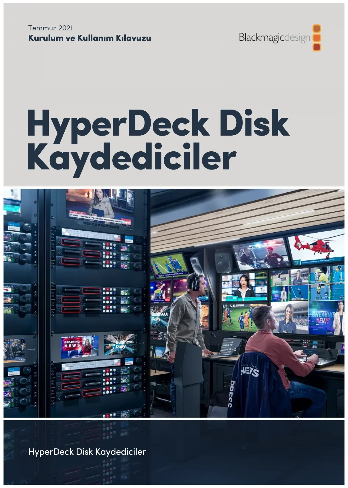 Certifique-se de que ventilação adequada seja fornecida ao redor do produto e não esteja restringida. Ao montar o produto em rack, certifique-se de que a ventilação não esteja restringida por equipamentos adjacentes. Não há componentes internos reparáveis pelo operador. Solicite o serviço de manutenção à assistência técnica local da Blackmagic Design. Utilize apenas em altitudes inferiores a 2000 m acima do nível do mar. Declaração do Estado da Califórnia Este produto pode expô-lo a produtos químicos, tais como vestígios de bifenilos polibromados dentro de peças de plástico, que é conhecido no estado da Califórnia por causar câncer e defeitos congênitos ou outros danos reprodutivos. Para mais informações, visite www.P65Warnings.ca.gov. Aviso para Pessoal de Assistência Autorizado Desconecte a alimentação de ambas as entradas de alimentação antes de efetuar operações de assistência! 710Informações de SegurançaGarantia 12 Meses de Garantia Limitada A Blackmagic Design garante que este produto estará livre de defeitos de materiais e fabricação por um período de 12 meses a partir da data de compra. Se o produto se revelar defeituoso durante este período de garantia, a Blackmagic Design, a seu critério, consertará o produto defeituoso sem cobrança pelos componentes e mão-de-obra, ou fornecerá a substituição em troca pelo produto defeituoso. Para obter o serviço sob esta garantia você, o Consumidor, deve notificar a Blackmagic Design do defeito antes da expiração do período de garantia e tomar as providências necessárias para o desempenho do serviço. O Consumidor é responsável pelo empacotamento e envio do produto defeituoso para um centro de assistência designado pela Blackmagic Design com os custos de envio pré-pagos. O Consumidor é responsável pelo pagamento de todos os custos de envio, seguro, taxas, impostos e quaisquer outros custos para os produtos que nos forem devolvidos por qualquer razão. Esta garantia não se aplica a defeitos, falhas ou danos causados por uso inadequado ou manutenção e cuidado inadequado ou impróprio. A Blackmagic Design não é obrigada a fornecer serviços sob esta garantia: a) para consertar danos causados por tentativas de instalar, consertar ou fornecer assistência técnica ao produto por pessoas que não sejam representantes da Blackmagic Design, b) para consertar danos causados por uso ou conexão imprópria a equipamentos não compatíveis, c) para consertar danos ou falhas causadas pelo uso de componentes ou materiais que não são da Blackmagic Design, d) para fornecer assistência técnica de um produto que foi modificado ou integrado a outros produtos quando o efeito de tal modificação ou integração aumenta o tempo ou a dificuldade da assistência técnica do serviço. ESTA GARANTIA É FORNECIDA PELA BLACKMAGIC DESIGN NO LUGAR DE QUAISQUER OUTRAS GARANTIAS, EXPLÍCITAS OU IMPLÍCITAS. A BLACKMAGIC DESIGN E SEUS FORNECEDORES NEGAM QUAISQUER GARANTIAS IMPLÍCITAS DE COMERCIALIZAÇÃO OU ADEQUAÇÃO A UMA FINALIDADE ESPECÍFICA. A RESPONSABILIDADE DA BLACKMAGIC DESIGN DE CONSERTAR OU SUBSTITUIR PRODUTOS DEFEITUOSOS É A ÚNICA E EXCLUSIVA MEDIDA FORNECIDA AO CONSUMIDOR PARA QUAISQUER DANOS INDIRETOS, ESPECIAIS OU ACIDENTAIS INDEPENDENTEMENTE DA BLACKMAGIC DESIGN OU DE FORNECEDORES POSSUÍREM INFORMAÇÕES PRÉVIAS SOBRE A POSSIBILIDADE DE TAIS DANOS. A BLACKMAGIC DESIGN NÃO É RESPONSÁVEL POR QUAISQUER USOS ILEGAIS DO EQUIPAMENTO PELO CONSUMIDOR. A BLACKMAGIC NÃO É RESPONSÁVEL POR QUAISQUER DANOS CAUSADOS PELO USO DESTE PRODUTO. O USUÁRIO DEVE OPERAR ESTE PRODUTO POR CONTA E RISCO PRÓPRIOS. © Direitos autorais 2021 Blackmagic Design. Todos os direitos reservados. ‘Blackmagic Design’, ‘DeckLink’, ‘HDLink’, ‘Workgroup Videohub’, ‘Multibridge Pro’, ‘Multibridge Extreme’, ‘Intensity’ e ‘Leading the creative video revolution’ são marcas comerciais registradas nos Estados Unidos e em outros países. Todos os outros nomes de empresas e produtos podem ser marcas comerciais de suas respectivas empresas com as quais elas são associadas. 711GarantiaHyperDeck Disk Kaydediciler Temmuz 2021 Kurulum ve Kullanım Kılavuzu HyperDeck Disk KaydedicilerHoş Geldiniz Blackmagic Hyperdeck disk kaydedici satın aldığınız için teşekkür ederiz! 2011’de orijinal Blackmagic Hyperdeck disk kaydedicileri tasarladığımızda, 2,5 inçlik çıkarılabilir SSD disklere profesyonel video kaydını ve oynatımını daha kolay ve maliyetini daha uygun hale getirmek istiyorduk. Şimdi; SD kartları, SSD’leri ve USB flaş diskleri kullanarak HD ve Ultra HD video kaydetmenizi sağlayan, yeni Hyperdeck disk kaydecilerimizi sunmaktan heyecan duyuyoruz. Hatta, bir Blackmagic MultiDock 10G bağlayabilir ve harici disklere kaydedebilir veya disklerdeki dosyaları oynatabilirsiniz! Hyperdeck Studio Plus ve Pro modellerinde; hızlı, yavaş ve interaktif hızlı oynatım için bir arama kadranı ile tanıdık yayın deck kontrolleri bulunur. Arama kadranının kavrama mekanizması, oynatımı hissetmenizi sağlar, böylece gözünüzü monitörden ayırmadan kliplerinizde gezinebilirsiniz. Üstelik, önde bir kulaklık bağlantısı ve hoparlör olduğundan, videodaki sesi doğrudan HyperDeck’ten hızlıca kontrol edebilirsiniz ve daha birçok özelliğe sahiptir! Hyperdeck disk kaydedicinizi yıllarca kullanacağınızı ve yapımlarınızda çok işe yarayacağını umarız! Bu kullanım kılavuzunun en güncel versiyonu ve HyperDeck yazılım güncellemeleri için lütfen, www.blackmagicdesign.com/tr adresindeki destek sayfamıza gidin. Yazılımınızı güncel tutarak, daima en son özelliklere sahip olduğunuzdan emin olabilirsiniz. Yeni yazılımlar çıktığında size duyurabilmemiz için yazılımı indirirken, lütfen sitemize güncel bilgilerinizle kaydolun. Yeni özellikler ve geliştirmeler üzerinde durmadan çalıştığımız için, yorumlarınızı al