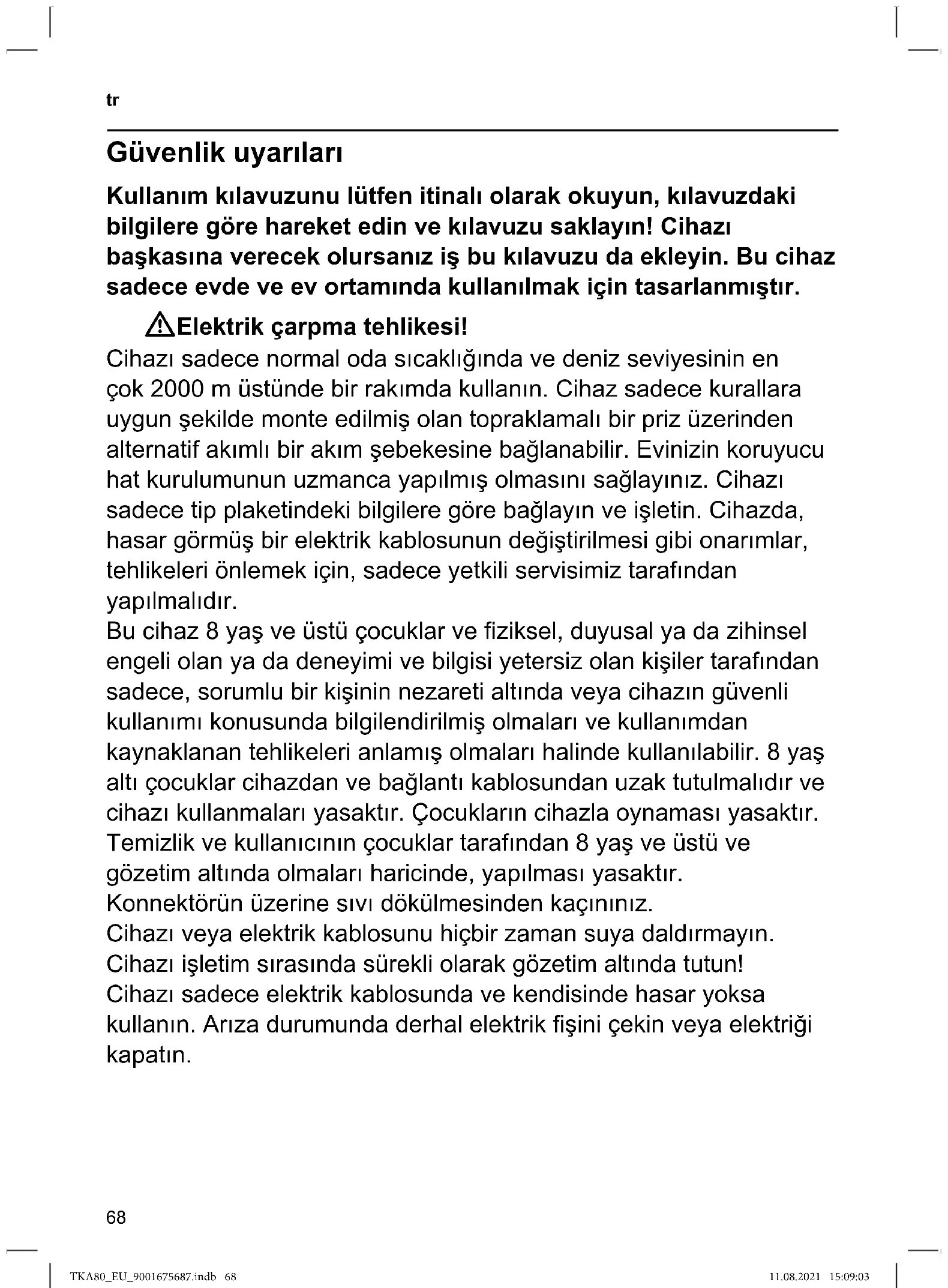 Temizlik ve kullanıncın;cocuklar tarafindan 8 yaş ve üstü ve gozetimALTHinda olmaları haricine, yapilması yasaktır.