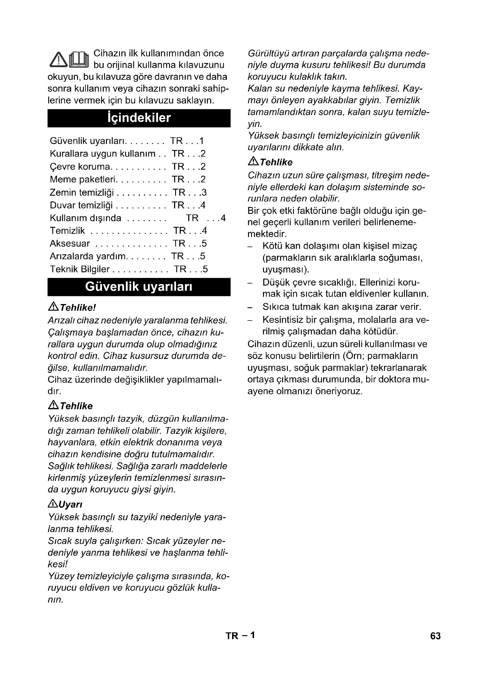 - 0,4 62 EL– 1 Cihazın ilk kullanımından önce bu orijinal kullanma kılavuzunu okuyun, bu kılavuza göre davranın ve daha sonra kullanım veya cihazın sonraki sahip- lerine vermek için bu kılavuzu saklayın. Tehlike! Arızalı cihaz nedeniyle yaralanma tehlikesi. Çalışmaya başlamadan önce, cihazın ku- rallara uygun durumda olup olmadığınız kontrol edin. Cihaz kusursuz durumda de- ğilse, kullanılmamalıdır. Cihaz üzerinde değişiklikler yapılmamalı- dır. Tehlike Yüksek basınçlı tazyik, düzgün kullanılma- dığı zaman tehlikeli olabilir. Tazyik kişilere, hayvanlara, etkin elektrik donanıma veya cihazın kendisine doğru tutulmamalıdır. Sağlık tehlikesi. Sağlığa zararlı maddelerle kirlenmiş yüzeylerin temizlenmesi sırasın- da uygun koruyucu giysi giyin. 몇 Uyarı Yüksek basınçlı su tazyiki nedeniyle yara- lanma tehlikesi. Sıcak suyla çalışırken: Sıcak yüzeyler ne- deniyle yanma tehlikesi ve haşlanma tehli- kesi! Yüzey temizleyiciyle çalışma sırasında, ko- ruyucu eldiven ve koruyucu gözlük kulla- nın. Gürültüyü artıran parçalarda çalışma nede- niyle duyma kusuru tehlikesi! Bu durumda koruyucu kulaklık takın. Kalan su nedeniyle kayma tehlikesi. Kay- mayı önleyen ayakkabılar giyin. Temizlik tamamlandıktan sonra, kalan suyu temizle- yin. Yüksek basınçlı temizleyicinizin güvenlik uyarılarını dikkate alın. Tehlike Cihazın uzun süre çalışması, titreşim nede- niyle ellerdeki kan dolaşım sisteminde so- runlara neden olabilir. Bir çok etki faktörüne bağlı olduğu için ge- nel geçerli kullanım verileri belirleneme- mektedir. – Kötü kan dolaşımı olan kişisel mizaç (parmakların sık aralıklarla soğuması, uyuşması). – Düşük çevre sıcaklığı. Ellerinizi koru- mak için sıcak tutan eldivenler kullanın. – Sıkıca tutmak kan akışına zarar verir. – Kesintisiz bir çalışma, molalarla ara ve- rilmiş çalışmadan daha kötüdür. Cihazın düzenli, uzun süreli kullanılması ve söz konusu belirtilerin (Örn; parmakların uyuşması, soğuk parmaklar) tekrarlanarak ortaya çıkması durumunda, bir doktora mu- ayene olmanızı öneriyoruz. İçindekiler Güvenlik uyarıları