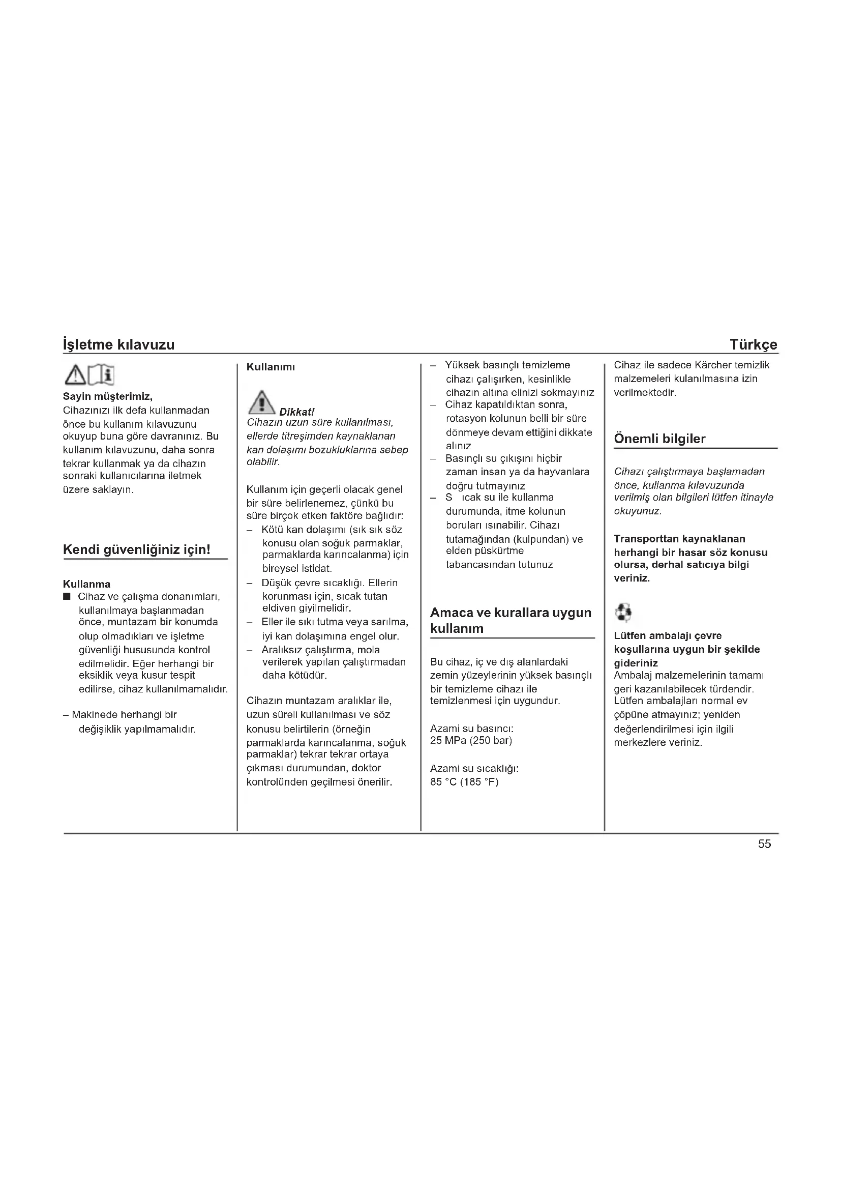 Sayin müúterimiz, CihazÕnÕzÕ ilk defa kullanmadan önce bu kullanÕm kÕlavuzunu okuyup buna göre davranÕnÕz. Bu kullanÕm kÕlavuzunu, daha sonra tekrar kullanmak ya da cihazÕn sonraki kullanÕcÕlarÕna iletmek üzere saklayÕn. Kendi güvenli÷iniz için! Kullanma ■ Cihaz ve çalÕúma donanÕmlarÕ, kullanÕlmaya baúlanmadan önce, muntazam bir konumda olup olmadÕklarÕ ve iúletme güvenli÷i hususunda kontrol edilmelidir. E÷er herhangi bir eksiklik veya kusur tespit edilirse, cihaz kullanÕlmamalÕdÕr. – Makinede herhangi bir de÷iúiklik yapÕlmamalÕdÕr. KullanÕmÕ Dikkat! CihazÕn uzun süre kullanÕlmasÕ, ellerde titreúimden kaynaklanan kan dolaúÕmÕ bozukluklarÕna sebep olabilir. KullanÕm için geçerli olacak genel bir süre belirlenemez, çünkü bu süre birçok etken faktöre ba÷lÕdÕr: – Kötü kan dolaúÕmÕ (sÕk sÕk söz konusu olan so÷uk parmaklar, parmaklarda karÕncalanma) için bireysel istidat. –Düúük çevre sÕcaklÕ÷Õ. Ellerin korunmasÕ için, sÕcak tutan eldiven giyilmelidir. – Eller ile sÕkÕ tutma veya sarÕlma, iyi kan dolaúÕmÕna engel olur. –AralÕksÕz çalÕútÕrma, mola verilerek yapÕlan çalÕútÕrmadan daha kötüdür. CihazÕn muntazam aralÕklar ile, uzun süreli kullanÕlmasÕ ve söz konusu belirtilerin (örne÷in parmaklarda karÕncalanma, so÷uk parmaklar) tekrar tekrar ortaya çÕkmasÕ durumundan, doktor kontrolünden geçilmesi önerilir. – Yüksek basÕnçlÕ temizleme cihazÕ çalÕúÕrken, kesinlikle cihazÕn altÕna elinizi sokmayÕnÕz – Cihaz kapatÕldÕktan sonra, rotasyon kolunun belli bir süre dönmeye devam etti÷ini dikkate alÕnÕz –BasÕnçlÕ su çÕkÕúÕnÕ hiçbir zaman insan ya da hayvanlara do÷ru tutmayÕnÕz –SÕcak su ile kullanma durumunda, itme kolunun borularÕ ÕsÕnabilir. CihazÕ tutama÷Õndan (kulpundan) ve elden püskürtme tabancasÕndan tutunuz Amaca ve kurallara uygun kullanÕm Bu cihaz, iç ve dÕú alanlardaki zemin yüzeylerinin yüksek basÕnçlÕ bir temizleme cihazÕ ile temizlenmesi için uygundur. Azami su basÕncÕ: 25 MPa (250 bar) Azami su sÕcaklÕ÷Õ: 85 °C (185 °F) Cihaz ile sadece Kärcher temizlik malzemeleri kulanÕlmasÕna izin verilmektedir. Önemli bilgiler CihazÕ çalÕútÕrmaya baúlamadan önce, kullanma kÕlavuzunda verilmiú olan bilgileri lütfen itinayla okuyunuz. Transporttan kaynaklanan herhangi bir hasar söz konusu olursa, derhal satÕcÕya bilgi veriniz. Lütfen ambalajÕ çevre koúullarÕna uygun bir úekilde gideriniz Ambalaj malzemelerinin tamamÕ geri kazanÕlabilecek türdendir. Lütfen ambalajlarÕ normal ev çöpüne atmayÕnÕz; yeniden de÷erlendirilmesi için ilgili merkezlere veriniz.øúletme kÕlavuzu Türkçe