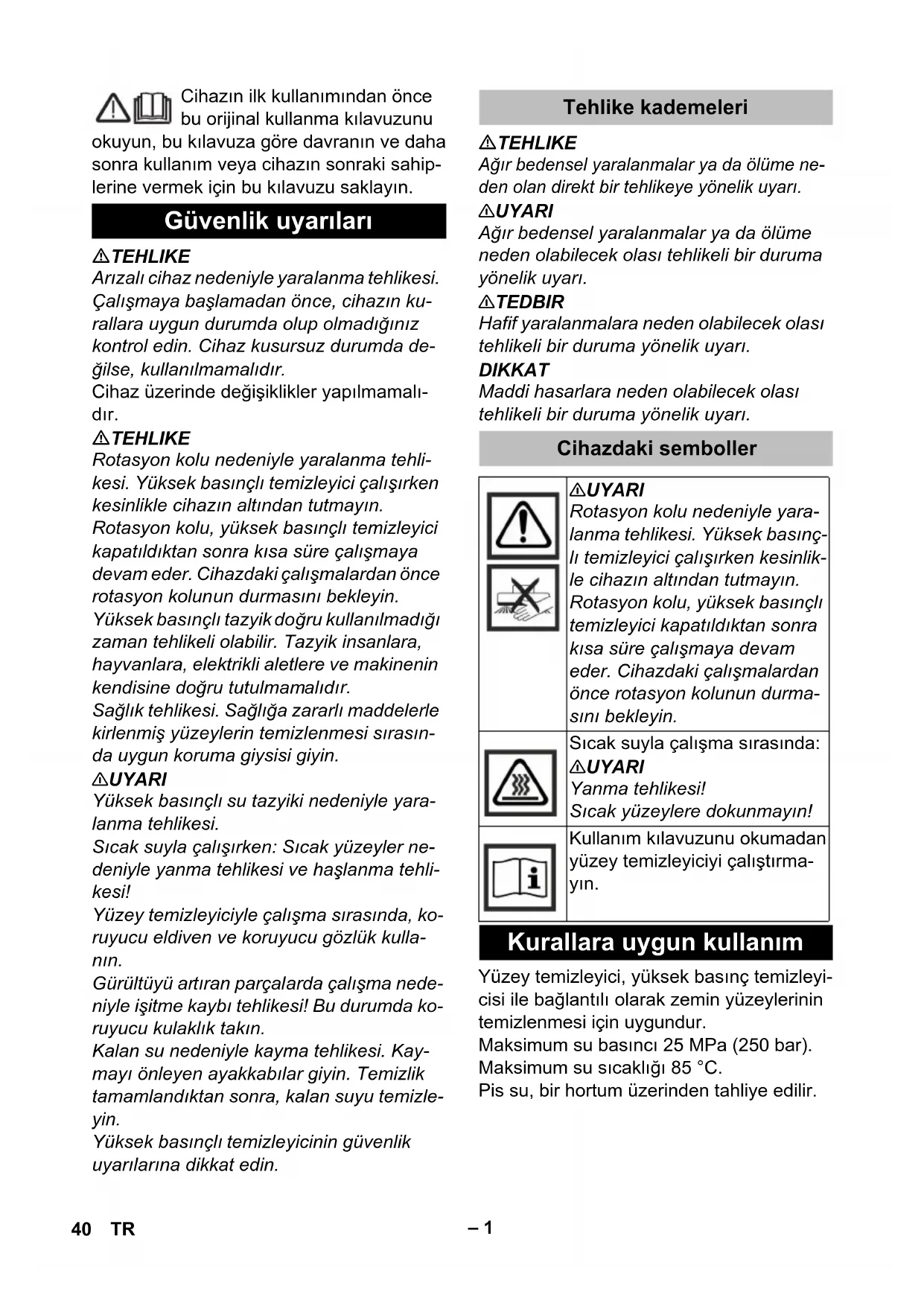 4.441-040.0 Αντιμετώπιση βλαβών 39EL– 1 Cihazın ilk kullanımından önce bu orijinal kullanma kılavuzunu okuyun, bu kılavuza göre davranın ve daha sonra kullanım veya cihazın sonraki sahip- lerine vermek için bu kılavuzu saklayın. TEHLIKE Arızalı cihaz nedeniyle yaralanma tehlikesi. Çalışmaya başlamadan önce, cihazın ku- rallara uygun durumda olup olmadığınız kontrol edin. Cihaz kusursuz durumda de- ğilse, kullanılmamalıdır. Cihaz üzerinde değişiklikler yapılmamalı- dır. TEHLIKE Rotasyon kolu nedeniyle yaralanma tehli- kesi. Yüksek basınçlı temizleyici çalışırken kesinlikle cihazın altından tutmayın. Rotasyon kolu, yüksek basınçlı temizleyici kapatıldıktan sonra kısa süre çalışmaya devam eder. Cihazdaki çalışmalardan önce rotasyon kolunun durmasını bekleyin. Yüksek basınçlı tazyik doğru kullanılmadığı zaman tehlikeli olabilir. Tazyik insanlara, hayvanlara, elektrikli aletlere ve makinenin kendisine doğru tutulmamalıdı
