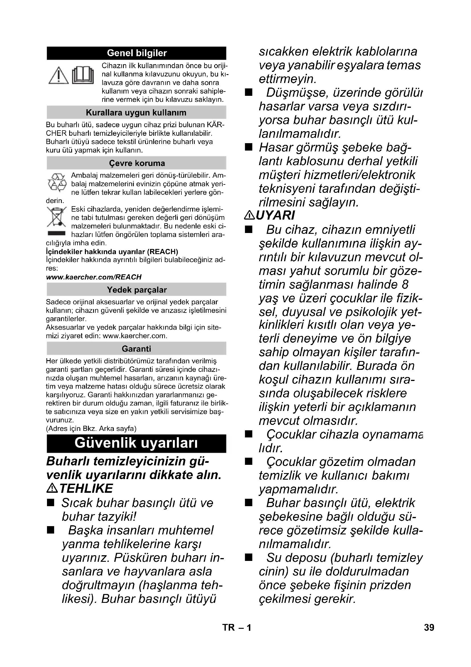 Θερμαντική ισχύς 700 W 38 EL– 1 Cihazın ilk kullanımından önce bu oriji- nal kullanma kılavuzunu okuyun, bu kı- lavuza göre davranın ve daha sonra kullanım veya cihazın sonraki sahiple- rine vermek için bu kılavuzu saklayın. Bu buharlı ütü, sadece uygun cihaz prizi bulunan KÄR- CHER buharlı temizleyicileriyle birlikte kullanılabilir. Buharlı ütüyü sadece tekstil ürünlerine buharlı veya kuru ütü yapmak için kullanın. Ambalaj malzemeleri geri dönüş-türülebilir. Am- balaj malzemelerini evinizin çöpüne atmak yeri- ne lütfen tekrar kullan labilecekleri yerlere gön- derin. Eski cihazlarda, yeniden değerlendirme işlemi- ne tabi tutulması gereken değerli geri dönüşüm malzemeleri bulunmaktadır. Bu nedenle eski ci- hazları lütfen öngörülen toplama sistemleri ara- cılığıyla imha edin. İçindekiler hakkında uyarılar (REACH) İçindekiler hakkında ayrıntılı bilgileri bulabileceğiniz ad- res: www.kaercher.com/REACH Sadece orijinal aksesuarlar ve orijinal yedek parçalar kullanın; cihazın güvenli şekilde ve arızasız işletilmesini garantilerler. Aksesuarlar ve yedek parçalar hakkında bilgi için site- mizi ziyaret edin: www.kaercher.com. Her ülkede yetkili distribütörümüz tarafından verilmiş garanti şartları geçerlidir. Garanti süresi içinde cihazı- nızda oluşan muhtemel hasarları, arızanın kaynağı üre- tim veya malzeme hatası olduğu sürece ücretsiz olarak karşılıyoruz. Garanti hakkınızdan yararlanmanızı ge- rektiren bir durum olduğu zaman, ilgili faturanız ile birlik- te satıcınıza veya size en yakın yetkili servisimize baş- vurunuz. (Adres için Bkz. Arka sayfa) Buharlı temizleyicinizin gü- venlik uyarılarını dikkate alın. TEHLIKE Sıcak buhar basınçlı ütü ve buhar tazyiki! Başka insanları muhtemel yanma tehlikelerine karşı uyarınız. Püsküren buharı in- sanlara ve hayvanlara asla doğrultmayın (haşlanma teh- likesi). Buhar basınçlı ütüyü sıcakken elektrik kablolarına veya yanabilir eşyalara temas ettirmeyin. Düşmüşse, üzerinde görülür hasarlar varsa veya sızdırı- yorsa buhar basınçlı ütü kul- lanılmamalıdır. Hasar görmüş şebeke bağ- lantı kablosunu derhal yetkili müşteri hizmetleri/elektronik teknisyeni taraf ından değişti- rilmesini sağlayın. 몇 UYARI Bu cihaz, cihazın emniyetli şekilde kullanımına ilişkin ay- rıntılı bir kılavuzun mevcut ol- ması yahut sorumlu bir göze- timin sağlanması halinde 8 yaş ve üzeri çocuklar ile fizik- sel, duyusal ve psikolojik yet- kinlikleri kısıtlı olan veya ye- terli deneyime ve ön bilgiye sahip olmayan kişiler tarafın- dan kullanılabilir. Burada ön koşul cihazın kullanımı sıra- sında oluşabilecek risklere ilişkin yeterli bir açıklamanın mevcut olmasıdır. Çocuklar cihazla oynamama- lıdır. Çocuklar gözetim olmadan temizlik ve kullanıcı bakımı yapmamalıdır. Buhar basınçlı ütü, elektrik şebekesine bağlı olduğu sü- rece gözetimsiz şekilde kulla- nılmamalıdır. Su deposu (buharlı temizleyi- cinin) su ile doldurulmadan önce şebeke fişinin prizden çekilmesi gerekir. Genel bilgiler Kurallara uygun kullanım Çevre koruma Yedek parçalar Garanti Güvenlik uyarıları 39TR– 2 Buhar basınçlı ütü sağlam bir yüzey üzerinde kullanılmalı ve sağlam bir yüzeye konma- lıdır. Buhar basınçlı ütü standına yerleştirilecekse yerleştirilen alanın sabit olduğundan emin olun. Cihazdaki onarım çalışmaları sadece yetkili müşteri hizmeti tarafından gerçekleştirilebilir. TEHLIKE Ağır bedensel yaralanmalar ya da ölüme neden olan direkt bir tehlikeye yönelik uyarı. 몇 UYARI Ağır bedensel yaralanmalar ya da ölüme neden olabilecek olası tehlikeli bir duruma yönelik uya- rı. 몇 TEDBIR Hafif yaralanmalara neden ola- bilecek olası tehlikeli bir duruma yönelik uyarı. DIKKAT Maddi hasarlara neden olabile- cek olası tehlikeli bir duruma yö- nelik uyarı. Aksesuarların eksik olması durumunda ya da nakliye hasarlarında yetkili satıcınızı bilgilendirin. Şekil Bkz. Sayfa 2 1 Kontrol lambası (turuncu) - ısıtıcı 2 Buhar düğmesi (alt) 3 Buhar hortumu 4 Buhar soketi Not Aktif buhar çekişli KÄRCHER ütüsünü kullanmanızı öneriyoruz. Bu ütü, satın alınan cihaz için uygun tasar- lanmıştır. Ütüleme işlemini kolaylaştırır ve hızlandırır. Kullanılan ütü masası, mutlaka buhar geçiren ve ızgara şeklinde bir ütü tabanına sahip olmalıdır. Not Buhar emişi olmayan bir ütü masasında yoğuşma suyu- nun birikmesi halinde ütü masası örtüsünün ıslanabile- ceği dikkate alınmalıdır. DIKKAT Yoğuşma suyu/nem nedeniyle maddi hasar Ütü yaparken yoğuşma suyu zemine damlayabilir ve hassas zemin döşemesine zarar verebilir. Mümkünse ütü işlemini yoğuşma suyuna karşı hassas olmayan bir zemin döşemesinde (örn. fayans/taş) ger- çekleştirin. Hassas zemin döşemelerinde yoğuşma suyunun dam- layabileceği alanın yeterince korunmasını sağlayın (örn. su geçirmeyen paspas). Not Buharın tabanda yoğuşmaması ve ütülenecek çamaşır- lara damlamaması için ütü tabanı sıcak olmalıdır.