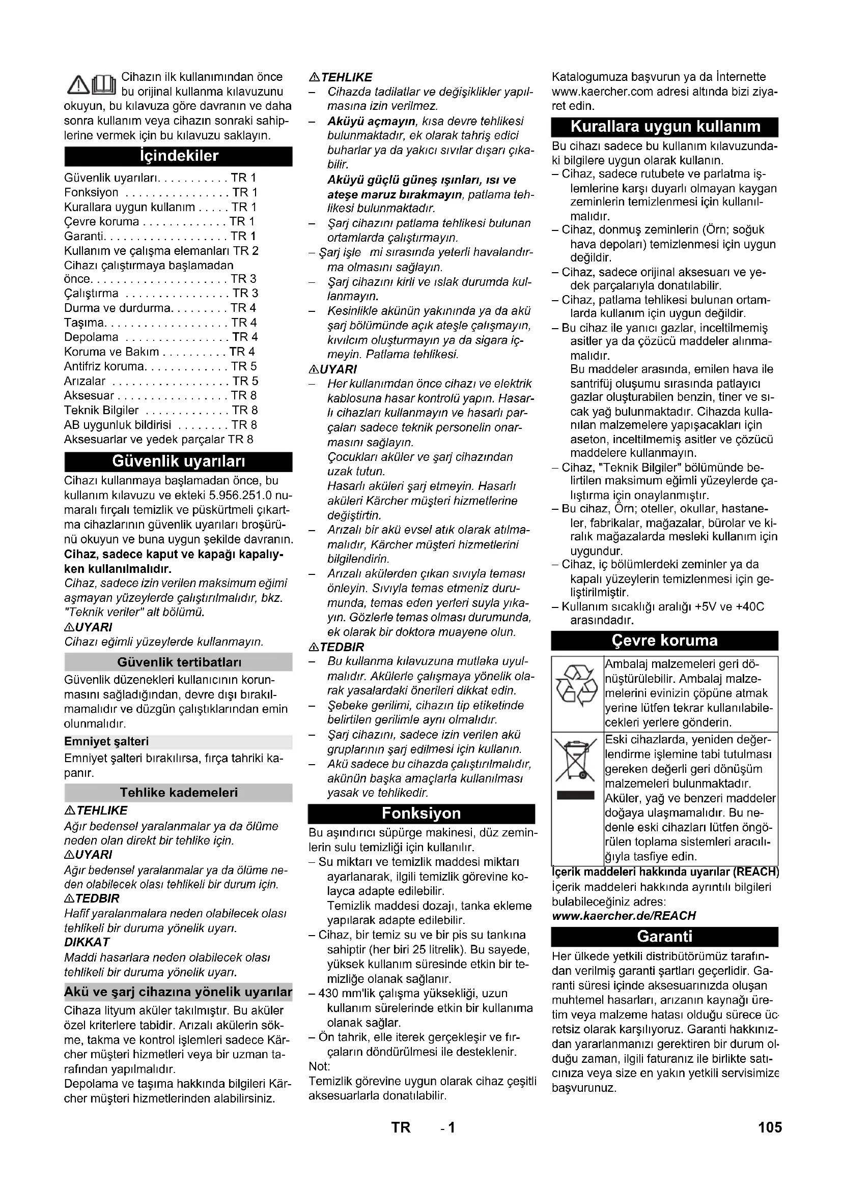 Chairman of the Board of Management Director Regulatory Affairs & Certification Εξαρτήματα και ανταλλακτικά 104 EL- 1 Cihazın ilk kullanımından önce bu orijinal kullanma kılavuzunu okuyun, bu kılavuza göre davranın ve daha sonra kullanım veya cihazın sonraki sahip- lerine vermek için bu kılavuzu saklayın. Cihazı kullanmaya başlamadan önce, bu kullanım kılavuzu ve ekteki 5.956.251.0 nu- maralı fırçalı temizlik ve püskürtmeli çıkart- ma cihazlarının güvenlik uyarıları broşürü- nü okuyun ve buna uygun şekilde davranın. Cihaz, sadece kaput ve kapağı kapalıy- ken kullanılmalıdır. Cihaz, sadece izin verilen maksimum eğimi aşmayan yüzeylerde çalıştırılmalıdır, bkz. "Teknik veriler" alt bölümü. 몇 UYARI Cihazı eğimli yüzeylerde kullanmayın. Güvenlik düzenekleri kullanıcının korun- masını sağladığından, devre dışı bırakıl- mamalıdır ve düzgün çalıştıklarından emin olunmalıdır. Emniyet şalteri bırakılırsa, fırça tahriki ka- panır. TEHLIKE Ağır bedensel yaralanmalar ya da ölüme neden olan direkt bir tehlike için. 몇 UYARI Ağır bedensel yaralanmalar ya da ölüme ne- den olabilecek olası tehlikeli bir durum için. 몇 TEDBIR Hafif yaralanmalara neden olabilecek olası tehlikeli bir duruma yönelik uyarı. DIKKAT Maddi hasarlara neden olabilecek olası tehlikeli bir duruma yönelik uyarı. Cihaza lityum aküler takılmıştır. Bu aküler özel kriterlere tabidir. Arızalı akülerin sök- me, takma ve kontrol işlemleri sadece Kär- cher müşteri hizmetleri veya bir uzman ta- rafından yapılmalıdır. Depolama ve taşıma hakkında bilgileri Kär- cher müşteri hizmetlerinden alabilirsiniz. TEHLIKE – Cihazda tadilatlar ve değişiklikler yapıl- masına izin verilmez. – Aküyü açmayın, kısa devre tehlikesi bulunmaktadır, ek olarak tahriş edici buharlar ya da yakıcı sıvılar dışarı çıka- bilir. Aküyü güçlü güneş ışınları, ısı ve ateşe maruz bırakmayın, patlama teh- likesi bulunmaktadır. – Şarj cihazını patlama tehlikesi bulunan ortamlarda çalıştırmayın. – Şarj işle mi sırasında yeterli havalandır- ma olmasını sağlayın. – Şarj cihazını kirli ve ıslak durumda kul- lanmayın. – Kesinlikle akünün yakınında ya da akü şarj bölümünde açık ateşle çalışmayın, kıvılcım oluşturmayın ya da sigara iç- meyin. Patlama tehlikesi. 몇 UYARI – Her kullanımdan önce cihazı ve elektrik kablosuna hasar kontrolü yapın. Hasar- lı cihazları kullanmayın ve hasarlı par- çaları sadece teknik personelin onar- masını sağlayın. Çocukları aküler ve şarj cihazından uzak tutun. Hasa rlı aküleri şarj etmeyin. Hasarlı aküleri Kärcher müşteri hizmetlerine değiştirtin. – Arızalı bir akü evsel atık olarak atılma- malıdır, Kärcher müşteri hizmetlerini bilgilendirin. – Arızalı akülerden çıkan sıvıyla teması önleyin. Sıvıyla temas etmeniz duru- munda, temas eden yerleri suyla yıka- yın. Gözlerle temas olması durumunda, ek olarak bir doktora muayene olun. 몇 TEDBIR – Bu kullanma kılavuzuna mutlaka uyul- malıdır. Akülerle çalışmaya yönelik ola- rak yasalardaki önerileri dikkat edin. – Şebeke gerilimi, cihazın tip etiketinde belirtilen gerilimle aynı olmalıdır. – Şarj cihazını, sadece izin verilen akü gruplarının şarj edil mesi için kullanın. – Akü sadece bu cihazda çalıştırılmalıdır, akünün başka amaçlarla kullanılması yasak ve tehlikedir. Bu aşındırıcı süpürge makinesi, düz zemin- lerin sulu temizliği için kullanılır. – Su miktarı ve temizlik maddesi miktarı ayarlanarak, ilgili temizlik görevine ko- layca adapte edilebilir. Temizlik maddesi dozajı, tanka ekleme yapılarak adapte edilebilir. – Cihaz, bir temiz su ve bir pis su tankına sahiptir (her biri 25 litrelik). Bu sayede, yüksek kullanım süresinde etkin bir te- mizliğe olanak sağlanır. – 430 mm'lik çalışma yüksekliği, uzun kullanım sürelerinde etkin bir kullanıma olanak sağlar. – Ön tahrik, elle iterek gerçekleşir ve fır- çaların döndürülmesi ile desteklenir. Not: Temizlik görevine uygun olarak cihaz çeşitli aksesuarlarla donatılabilir. Katalogumuza başvurun ya da İnternette www.kaercher.com adresi altında bizi ziya- ret edin. Bu cihazı sadece bu kullanım kılavuzunda- ki bilgilere uygun olarak kullanın. – Cihaz, sadece rutubete ve parlatma iş- lemlerine karşı duyarlı olmayan kaygan zeminlerin temizlenmesi için kullanıl- malıdır. – Cihaz, donmuş zeminlerin (Örn; soğuk hava depoları) temizlenmesi için uygun değildir. – Cihaz, sadece orijinal aksesuarı ve ye- dek parçalarıyla donatılabilir. – Cihaz, patlama tehlikesi bulunan ortam- larda kullanım için uygun değildir. – Bu cihaz ile yanıcı gazlar, inceltilmemiş asitler ya da çözücü maddeler alınma- malıdır. Bu maddeler arasında, emilen hava ile santrifüj oluşumu sırasında patlayıcı gazlar oluşturabilen benzin, tiner ve sı- cak yağ bulunmaktadır. Cihazda kulla- nılan malzemelere yapışacakları için aseton, inceltilmemiş asitler ve çözücü maddelere kullanmayın. – Cihaz, "Teknik Bilgiler" bölümünde be- lirtilen maksimum eğimli yüzeylerde ça- lıştırma için onaylanmıştır. – Bu cihaz, Örn; oteller, okullar, hastane- ler, fabrikalar, mağazalar, bürolar ve ki- ralık mağazalarda mesleki kullanım için uygundur. – Cihaz, iç bölümlerdeki zeminler ya da kapalı yüzeylerin temizlenmesi için ge- liştirilmiştir. – Kullanım sıcaklığı aralığı +5V ve +40C arasındadır. İçerik maddeleri hakkında uyarılar (REACH) İçerik maddeleri hakkında ayrıntılı bilgileri bulabileceğiniz adres: www.kaercher.de/REACH Her ülkede yetkili distribütörümüz tarafın- dan verilmiş garanti şartları geçerlidir. Ga- ranti süresi içinde aksesuarınızda oluşan muhtemel hasarları, ar
