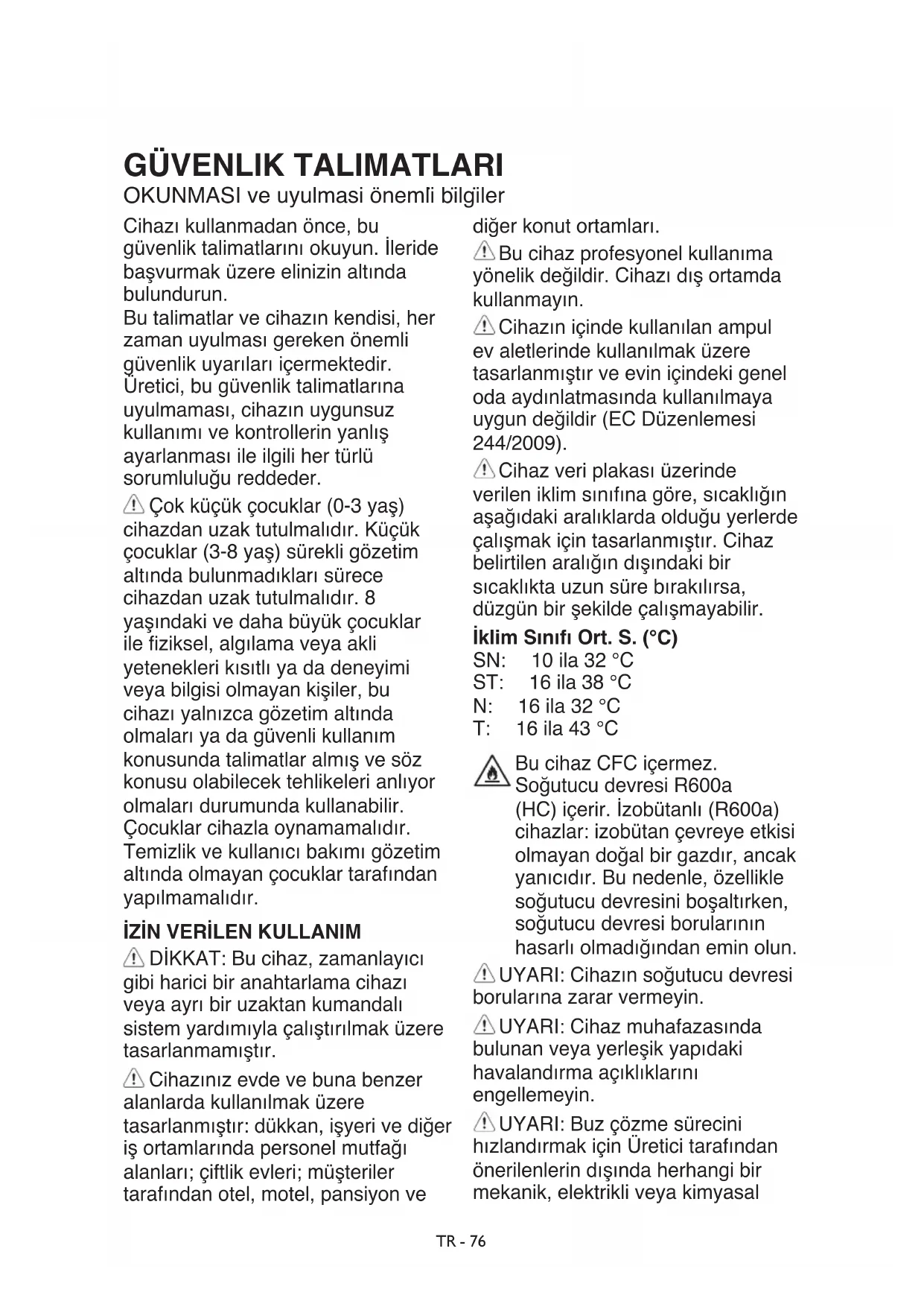 DİKKAT:Bucihaz,zamanlayıcı gibiharicibiranahtarlamacihazı veyaayrıbiruzaktankumandalı sistemyardımıylaçalıştırılmaküzere tasarlanmamıştır. Cihazınızevdevebunabenzer alanlardakullanılmaküzere tasarlanmıştır:dükkan,işyerivediğer işortamlarındapersonelmutfağı alanları;çiftlikevleri;müşteriler tarafındanotel,motel,pansiyonve diğerkonutortamları. Bucihazprofesyonelkullanıma yönelikdeğildir.Cihazıdışortamda kullanmayın. Cihazıniçindekullanılanampul evaletlerindekullanılmaküzere tasarlanmıştırveeviniçindekigenel odaaydınlatmasındakullanılmaya uygundeğildir(ECDüzenlemesi 244/2009). Cihazveriplakasıüzerinde verileniklimsınıfınagöre,sıcaklığın aşağıdakiaralıklardaolduğuyerlerde çalışmakiçintasarlanmıştır.Cihaz belirtilenaralığındışındakibir sıcaklıktauzunsürebırakılırsa, düzgünbirşekildeçalışmayabilir. İklim Sınıfı Ort. S. (°C) SN: 10ila32°C ST: 16ila38°C N: 16ila32°C T: 16ila43°C BucihazCFCiçermez. SoğutucudevresiR600a (HC)içerir.İzobütanlı(R600a) cihazlar:izobütançevreyeetkisi olmayandoğalbirgazdır,ancak yanıcıdır.Bunedenle,özellikle soğutucudevresiniboşaltırken, soğutucudevresiborularının hasarlıolmadığındaneminolun. UYARI:Cihazınsoğutucudevresi borularınazararvermeyin. UYARI:Cihazmuhafazasında bulunanveyayerleşikyapıdaki havalandırmaaçıklıklarını engellemeyin. UYARI:Buzçözmesürecini hızlandırmakiçinÜreticitarafından önerilenlerindışındaherhangibir mekanik,elektrikliveyakimyasalTR - 77 yöntemkullanmayın. UYARI:Üreticitarafındanaçıkça onayizinverilentiptedeğillerse, cihazbölmelerininiçindeelektrikli cihazlarkullanmayınveyacihaziçine yerleştirmeyin. UYARI:direkolaraksutesisatına bağlıolmayanbuzve/veyasu üreteçleri,sadeceiçilebilirsuile doldurulmalıdır. UYARI:Otomatikbuzyapıcılar ve/veyasudağıtıcılar,sadece şebekesubasıncı0,17ve0,81MPa (1,7ve8,1bar)arasındaolanve içmesuyuverenbirsuşebekesine bağlanmalıdır. Bucihazıniçinde,yanıcımaddeler barındıranaerosolspreykutularıgibi patlayıcımaddelersaklamayın. Buzpaketlerinin(bazımodellerle verilir)içindekimaddeleri(toksik olmayan)yutmayın.Soğuk yanıklarınanedenolabileceğinden, buzküpleriniveyabuzluşekerleri dondurucudançıkardıktanhemen sonrayemeyin. Erişilebilirbirfankapağıiçerisinde havaltresikullanılacakşekilde tasarlanmışürünleriçin;buzdolabı çalışırkenltredaimayerinde olmalıdır. Kırılabileceğiiçin,içisıvıdolu camkaplarıdondurucubölmesinin içindesaklamayın.Fanı(dahil edilmişse)gıdalarlakapatmayın. Gıdalarıyerleştirdiktensonra,bölme kapaklarının,özellikledondurucu kapağınındoğruşekildekapandığını kontroledin. Hasarlıcontalarmümkünolanen kısazamandadeğiştirilmelidir. Buzdolabıbölmesinisadecetaze gıdalarısaklamakvedondurucu, bölmesinisadecedonmuşgıdaları saklamak,tazegıdalarıdondurmak vebuzküpleriyapmakiçinkullanın. Paketlenmemişgıdalarıdoğrudan buzdolabıveyadondurucu bölmelerininiçyüzeyleriiletemas edecekşekildesaklamaktankaçının. Cihazlardaözelbölmelerolabilir (TazeGıdaBölmesi,SıfırDerece Kutusu,vs.).İlgiliürünkitapçığında aksibelirtilmemişise,bunlar çıkarılabilirveeşdeğerperformans korunabilir. Yalıtımköpüğünde,üeme maddesiolarakC-Pentan kullanılmıştır;bu,yanıcıbir gazdır. MONTAJ Cihaz,ikiveyadahafazlakişi ilekaldırılmalıvemonteedilmelidir -yaralanmariski.Paketiaçmak vekurulumugerçekleştirmekiçin koruyucueldivenlerkullanın- kesilmeriski. Subeslemesi(varsa)veelektrik bağlantılarıdahilmontajveonarım işlemleriniteliklibirteknisyen tarafındangerçekleştirilmelidir. Kullanıcıkılavuzundaözellikle belirtilmediğisürece,bucihazın hiçbirparçasınıonarmayınveya değiştirmeyin.Çocuklarıkurulumun yapıldığıalandanuzaktutun.Cihazın ambalajınıaçtıktansonra,cihazın nakliyesırasındaTRhasargörmemiş olduğundaneminolun.Eğerbir sorunvarsa,cihazısatınaldığınız yeriveyaenyakınservisiarayın. Kurulumtamamlandığında,ambalaj atıkları(plastik,yapayköpükparçalar vs.)çocuklarınulaşamayacağı yerlerdedepolanmalıdır-boğulma riski.Herhangibirmontajişleminden önce,cihazınşielektrikprizinden çekilmelidir-elektrikçarpmasıTR - 78 riski.Montajişlemiesnasında, cihazınelektrikkablosunahasar vermemesinedikkatedin-yangın veyaelektrikçarpmasıriski.Cihazı, ancakmontajtamamlandıktansonra etkinleştirin. Cihazıtaşırkenzeminezarar vermemeyedikkatedin(örn. parkeler).Cihazı,zeminüzerine kurunveyaebatvekullanım amacınauygunbiryerdeveağırlığını taşıyacaksağlamlıktadestekleyin. Cihazınbirısıkaynağınınyakınında olmadığındanvedörtayağının dasabitveyerletemasettiğinden eminolun,bunlarıgerektiğişekilde ayarlayınvebirsuterazisikullanarak cihazınmükemmelbirşekildedüz olduğunukontroledin.Cihazın soğutucudevresinintamolaraketkin halegelmesinisağlamakiçin,cihazı çalıştırmadanönceenazikisaat bekleyin. UYARI:Dengesizlikyüzünden oluşacakbirtehlikedenkaçınmak için;cihazınyerleştirilmesiveya sabitlenmesi,üreticitalimatlarına göregerçekleştirilmelidir. Buzdolabının,gazlıocağınmetal hortumu,metalgazveyasuboruları yadaelektrikkablolarıbuzdolabının arkaduvarı(kondansatörbobini)ile temasedecekşekildeyerleştirilmesi yasaktır.Cihazınmontajıiçin gerekentümboyutlarvearalıklar, Montajtalimatlarıkitapçığında belirtilmiştir.