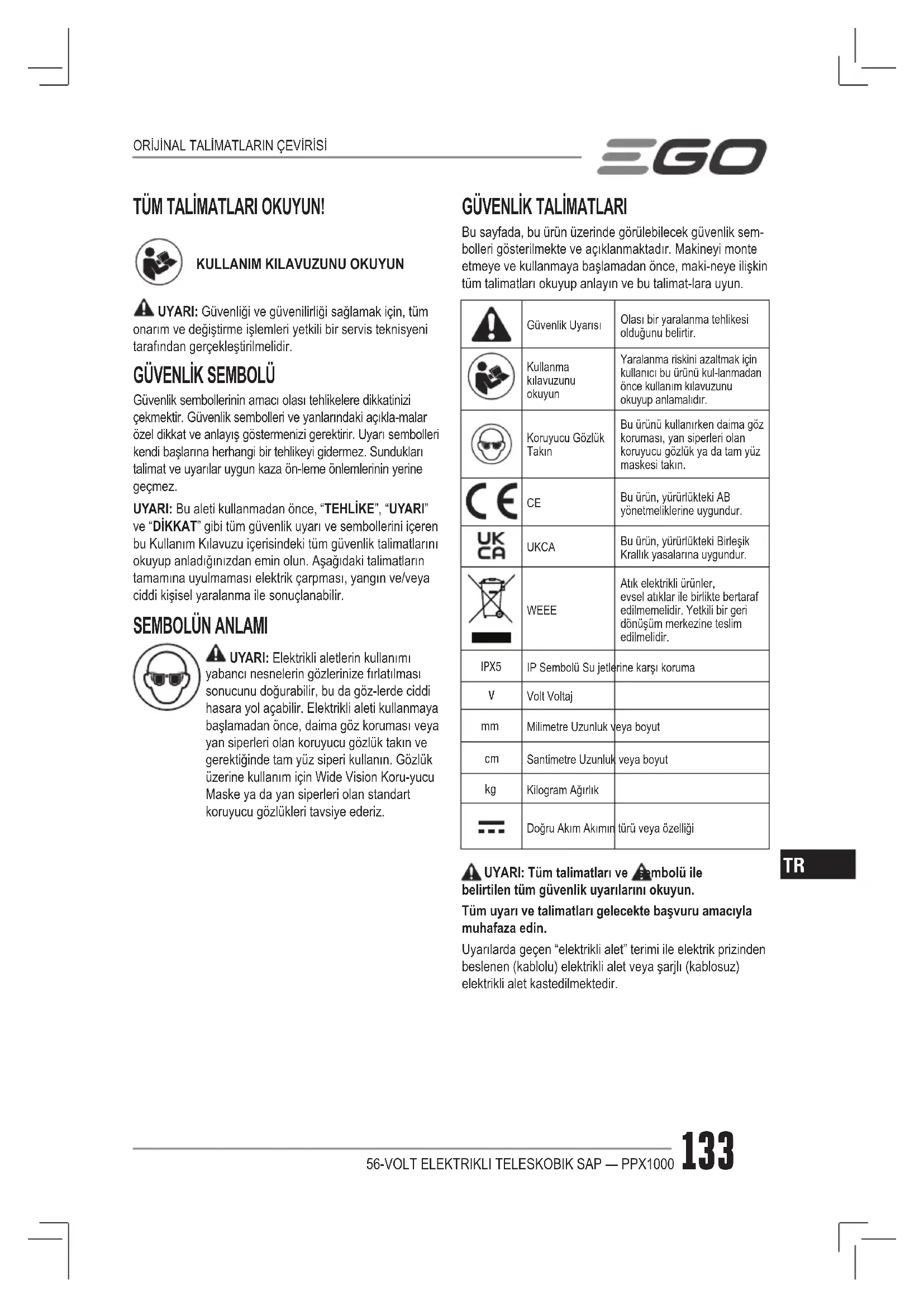 Bu sayfada, bu ürün üzerinde görülebilecek güvenlik sem- bolleri gösterilmekte ve açıklanmaktadır. Makineyi monte etmeye ve kullanmaya başlamadan önce, maki-neye ilişkin tüm talimatları okuyup anlayın ve bu talimat-lara uyun. Güvenlik UyarısıOlası bir yaralanma tehlikesi olduğunu belirtir.Kullanma kılavuzunu okuyunYaralanma riskini azaltmak için kullanıcı bu ürünü kul-lanmadan önce kullanım kılavuzunu okuyup anlamalıdır.Koruyucu Gözlük TakınBu ürünü kullanırken daima göz koruması, yan siperleri olan koruyucu gözlük ya da tam yüz maskesi takın. Bu ürün, yürürlükteki AB yönetmeliklerine uygundur. UKCA Bu ürün, yürürlükteki Birleşik Krallık yasalarına uygundur. WEEE Atık elektrikli ürünler, evsel atıklar ile birlikte bertaraf edilmemelidir. Yetkili bir geri dönüşüm merkezine teslim edilmelidir. IPX5 IP Sembolü Su jetlerine karşı koruma Volt Voltaj Milimetre Uzunluk veya boyut Santimetre Uzunluk veya boyut Kilogram AğırlıkDoğru Akım Akımın türü veya özelliği UYARI: Tüm talimatları ve sembolü ile belirtilen tüm güvenlik uyarılarını okuyun. Tüm uyarı ve talimatları gelecekte başvuru amacıyla muhafaza edin. Uyarılarda geçen “elektrikli alet” terimi ile elektrik prizinden beslenen (kablolu) elektrikli alet veya şarjlı (kablosuz) elektrikli alet kastedilmektedir. ORİJİNAL TALİMATLARIN ÇEVİRİSİ56-VOLT ELEKTRIKLI TELESKOBIK SAP — PPX1000 134