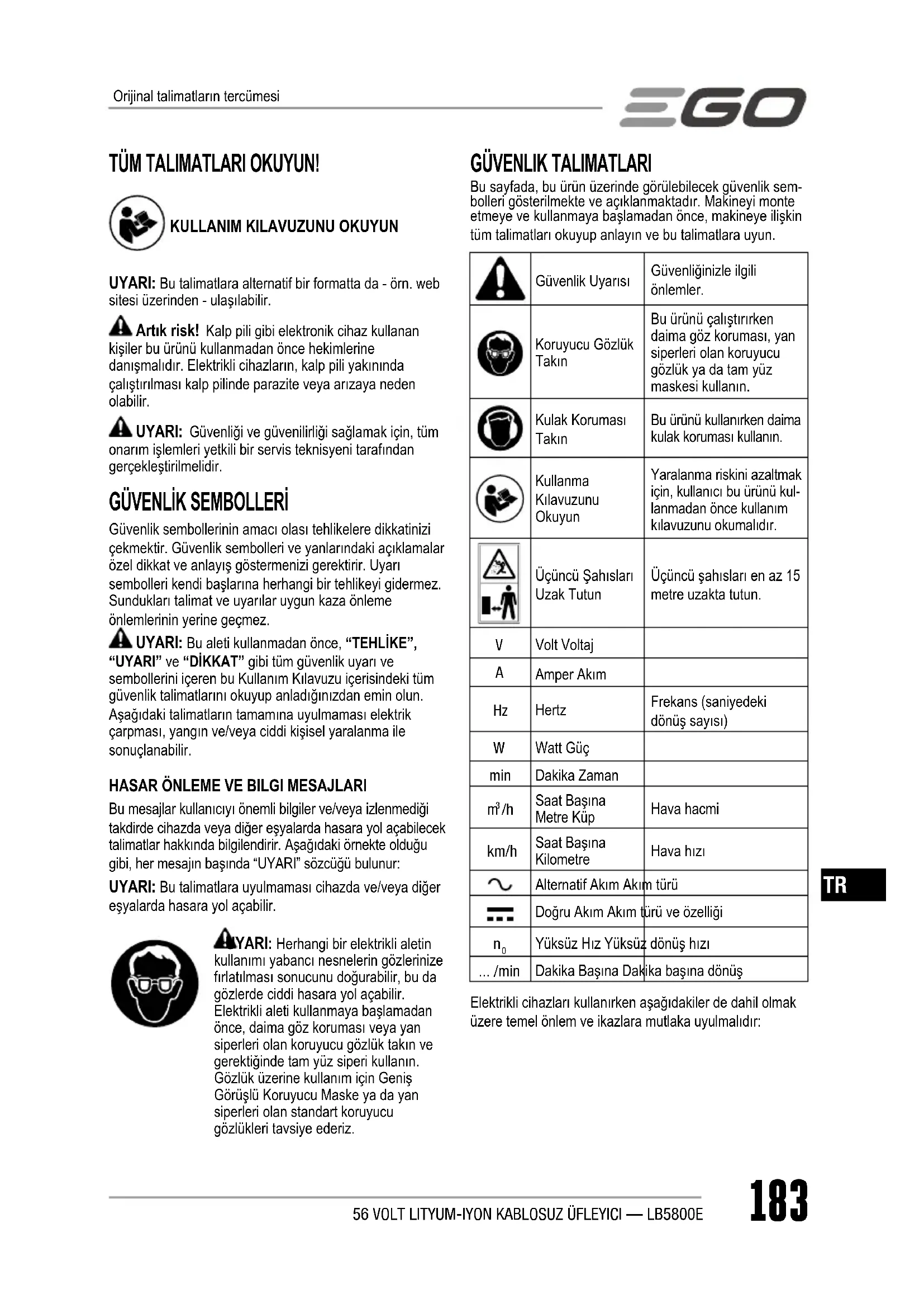 ◾ Bu talimatları saklayın. Talimatlara sık sık müracaat edin ve bu aleti kullanacak diğer kişileri bilgilendirmek için kullanın. Bu ürünü başka birine ödünç verirseniz, ürünün hatalı kullanılmasını ve olası yaralanmaları önlemek için bu talimatları da ürünle birlikte verin. BU TALİMATLARI SAKLAYIN!! ΠΡΟΔΙΑΓΡΑΦΕΣ Voltaj 56V Ağızda maksimum hava hacmi 986 m /saatTavsiye Edilen Çalışma Sıcaklığı -15°C-40°CTavsiye Edilen Depolama Sıcaklığı -20°C-70°CMaksimum Hava Hızı65m/s (yuvarlak nozul olmadan)75m/s (Yuvarlak ağız ile)Yaklaş. Çalışma Süresi (EGO 5.0Ah pil ile)18 dak (Yükseltme modu)30 dak (Yüksek hız)200 dak (Düşük hız)Maksimum üeme gücü 18NÜeyici Ağırlığı (pil paketi hariç) 2,18 kgÖlçülen ses güç düzeyi L 94,73 dB(A) K=2,83 dB(A)Operatörün duyduğu ses güç düzeyi L 78,4 dB(A) K=2,5 dB(A)Garanti edilen ses güç düzeyi L