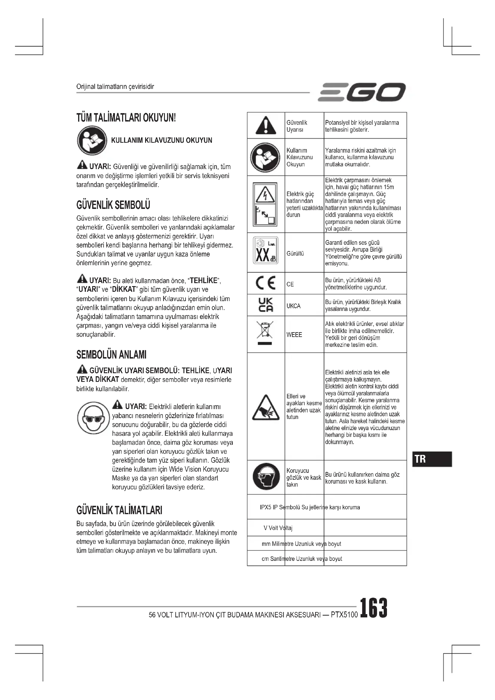 WEEE Atık elektrikli ürünler, evsel atıklar ile birlikte imha edilmemelidir. Yetkili bir geri dönüşüm merkezine teslim edin.Elleri ve ayakları kesme aletinden uzak tutunElektrikli aletinizi asla tek elle çalıştırmaya kalkışmayın. Elektrikli aletin kontrol kaybı ciddi veya ölümcül yaralanmalarla sonuçlanabilir. Kesme yaralanma riskini düşürmek için ellerinizi ve ayaklarınız kesme aletinden uzak tutun. Asla hareket halindeki kesme aletine elinizle veya vücudunuzun herhangi bir başka kısmı ile dokunmayın.Koruyucu gözlük ve kask takınBu ürünü kullanırken daima göz koruması ve kask kullanın.IPX5 IP Sembolü Su jetlerine karşı korumaV Volt Voltajmm Milimetre Uzunluk veya boyutcm Santimetre Uzunluk veya boyutOrijinal talimatların çevirisidir56 VOLT LITYUM-IYON ÇIT BUDAMA MAKINESI AKSESUARI — PTX5100164