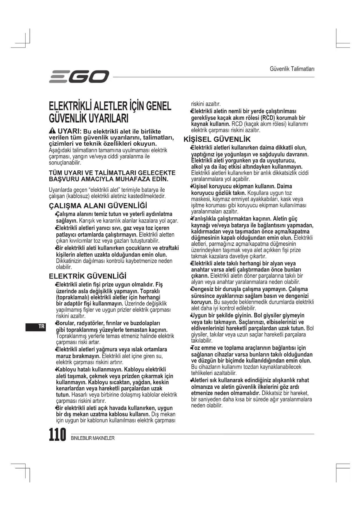 Aletleri sık kullanarak edindiğiniz alışkanlık rahat olmanıza ve aletin güvenlik ilkelerini göz ardı etmenize neden olmamalıdır. Dikkatsiz bir hareket, bir saniyeden daha kısa bir sürede ağır yaralanmalara neden olabilir. Güvenlik Talimatları111 BINILEBILIR MAKINELER