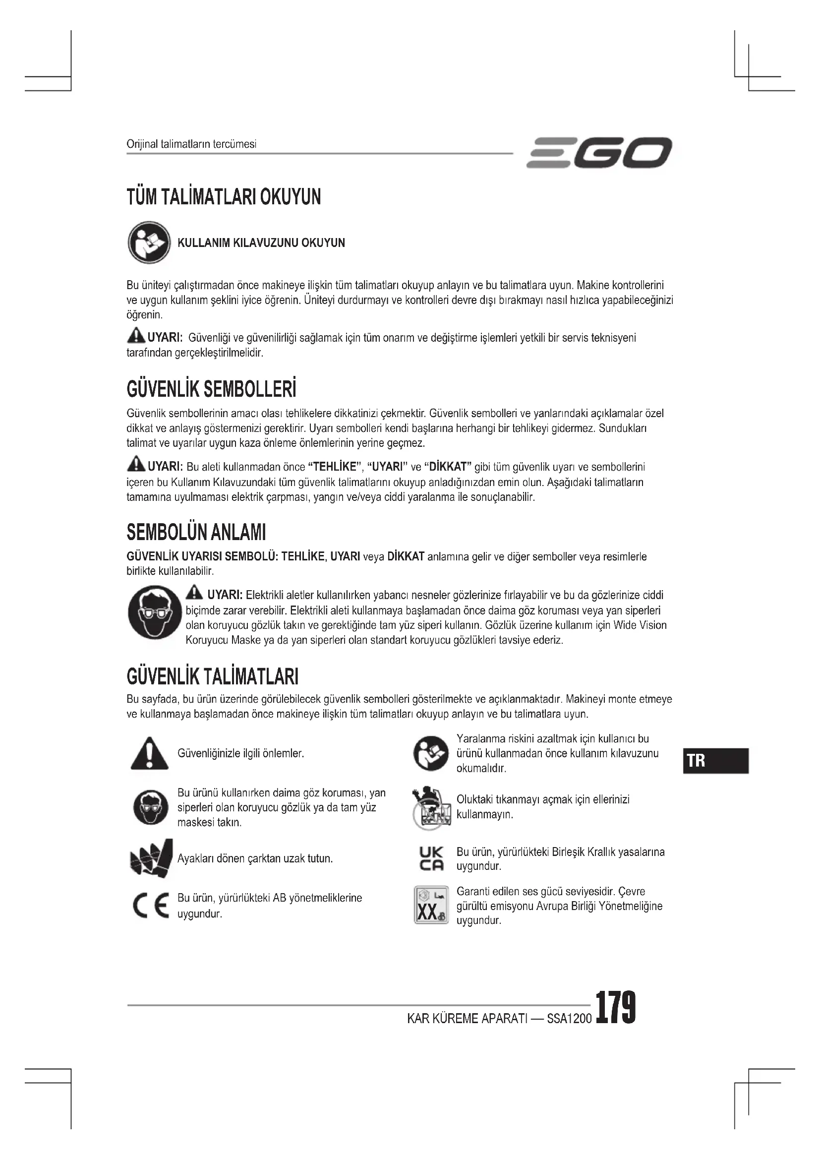 EGO Garanti Politikasına ilişkin tüm hükümler ve koşullar için lütfen egopowerplus.eu adresindeki web sitemizi ziyaret edin.LUMEPUHURI TARVIK — SSA1200 187