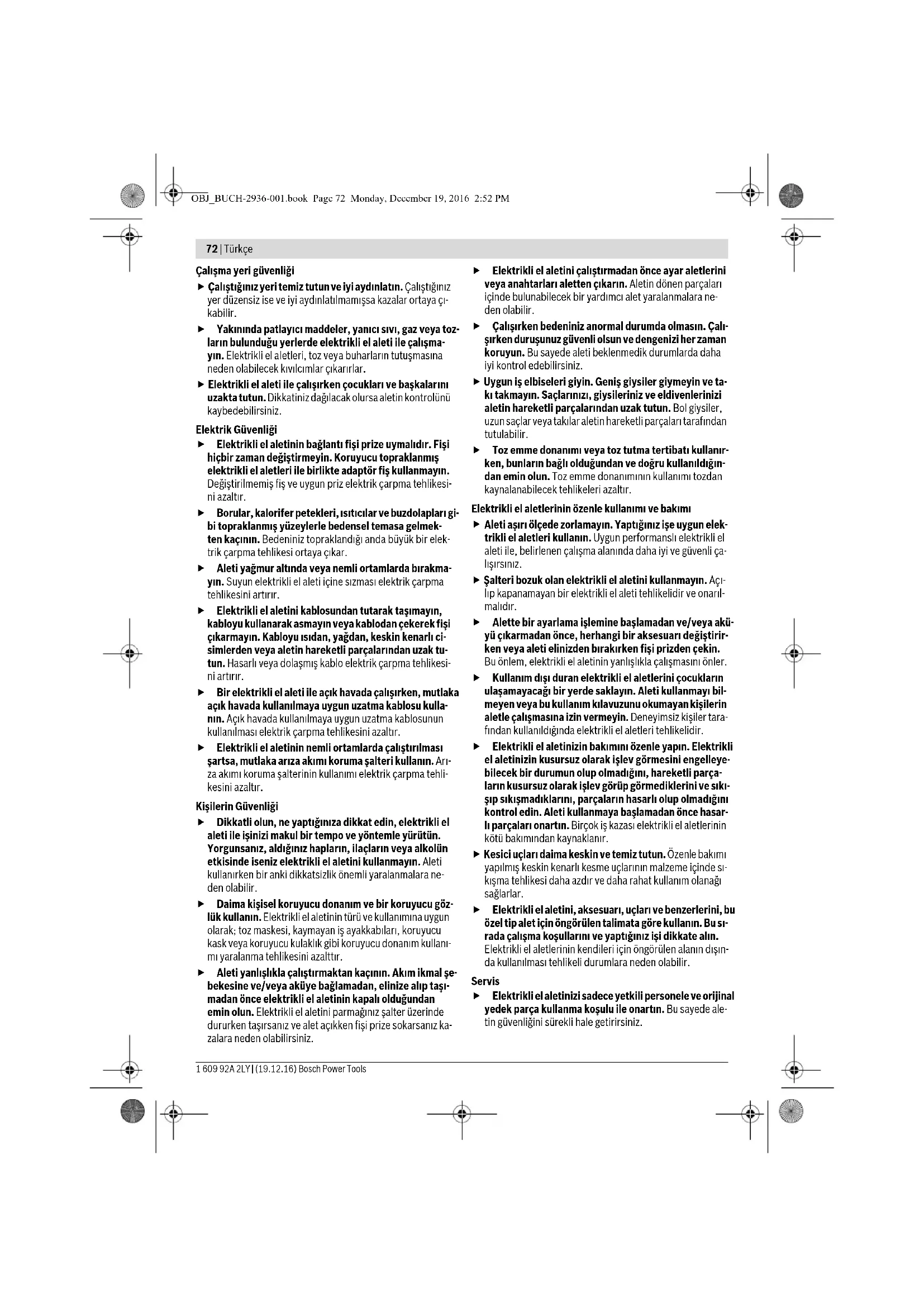 Τηρούμε το δικαίωμα αλλαγών. Türkçe Güvenlik Talimatı Elektrikli El Aletleri İçin Genel Uyarı Talimatı Bütün uyarıları ve talimat hükümlerini oku- yun. Açıklanan uyarılara ve talimat hükümle- rine uyulmadığı takdirde elektrik çarpmalarına, yangınlara ve/veya ağır yaralanmalara neden olunabilir. Bütün uyarıları ve talimat hükümlerini ileride kullanmak üzere saklayın. Uyarı ve talimat hükümlerinde kullanılan “Elektrikli El Aleti” kavramı, akım şebekesine bağlı (şebeke bağlantı kablosu ile) aletlerle akü ile çalışan aletleri (akım şebekesine bağlantısı olmayan aletler) kapsamaktadır. UYARI OBJ_BUCH-2936-001.book Page 71 Monday, December 19, 2016 2:52 PM72 | Türkçe 1 609 92A 2LY | (19.12.16) Bosch Power Tools Çalışma yeri güvenliği Çalıştığınız yeri temiz tutun ve iyi aydınlatın. Çalıştığınız yer düzensiz ise ve iyi aydınlatılmamışsa kazalar ortaya çı- kabilir. Yakınında patlayıcı maddeler, yanıcı sıvı, gaz veya toz- ların bulunduğu yerlerde elektrikli el aleti ile çalışma- yın. Elektrikli el aletleri, toz veya buharların tutuşmasına neden olabilecek kıvılcımlar çıkarırlar. Elektrikli el aleti ile çalışırken çocukları ve başkalarını uzakta tutun. Dikkatiniz dağılacak olursa aletin kontrolünü kaybedebilirsiniz. Elektrik Güvenliği Elektrikli el aletinin bağlantı fişi prize uymalıdır. Fişi hiçbir zaman değiştirmeyin. Koruyucu topraklanmış elektrikli el aletleri ile birlikte adaptör fiş kullanmayın. Değiştirilmemiş fiş ve uygun priz elektrik çarpma tehlikesi- ni azaltır. Borular, kalorifer petekleri, ısıtıcılar ve buzdolapları gi- bi topraklanmış yüzeylerle bedensel temasa gelmek- ten kaçının. Bedeniniz topraklandığı anda büyük bir elek- trik çarpma tehlikesi ortaya çıkar. Aleti yağmur altında veya nemli ortamlarda bırakma- yın. Suyun elektrikli el aleti içine sızması elektrik çarpma tehlikesini artırır. Elektrikli el aletini kablosundan tutarak taşımayın, kabloyu kullanarak asmayın veya kablodan çekerek fişi çıkarmayın. Kabloyu ısıdan, yağdan, keskin kenarlı ci- simlerden veya aletin hareketli parçalarından uzak tu- tun. Hasarlı veya dolaşmış kablo elektrik çarpma tehlikesi- ni artırır. Bir elektrikli el aleti ile açık havada çalışırken, mutlaka açık havada kullanılmaya uygun uzatma kablosu kulla- nın. Açık havada kullanılmaya uygun uzatma kablosunun kullanılması elektrik çarpma tehlikesini azaltır. Elektrikli el aletinin nemli ortamlarda çalıştırılması şartsa, mutlaka arıza akımı koruma şalteri kullanın. Arı- za akımı koruma şalterinin kullanımı elektrik çarpma tehli- kesini azaltır. Kişilerin Güvenliği Dikkatli olun, ne yaptığınıza dikkat edin, elektrikli el aleti ile işinizi makul bir tempo ve yöntemle yürütün. Yorgunsanız, aldığınız hapların, ilaçların veya alkolün etkisinde iseniz elektrikli el aletini kullanmayın. Aleti kullanırken bir anki dikkatsizlik önemli yaralanmalara ne- den olabilir. Daima kişisel koruyucu donanım ve bir koruyucu göz- lük kullanın. Elektrikli el aletinin türü ve kullanımına uygun olarak; toz maskesi, kaymayan iş ayakkabıları, koruyucu kask veya koruyucu kulaklık gibi koruyucu donanım kullanı- mı yaralanma tehlikesini azalttır. Aleti yanlışlıkla çalıştırmaktan kaçının. Akım ikmal şe- bekesine ve/veya aküye bağlamadan, elinize alıp taşı- madan önce elektrikli el aletinin kapalı olduğundan emin olun. Elektrikli el aletini parmağınız şalter üzerinde dururken taşırsanız ve alet açıkken fişi prize sokarsanız ka- zalara neden olabilirsiniz. Elektrikli el aletini çalıştırmadan önce ayar aletlerini veya anahtarları aletten çıkarın. Aletin dönen parçaları içinde bulunabilecek bir yardımcı alet yaralanmalara ne- den olabilir. Çalışırken bedeniniz anormal durumda olmasın. Çalı- şırken duruşunuz güvenli olsun ve dengenizi her zaman koruyun. Bu sayede aleti beklenmedik durumlarda daha iyi kontrol edebilirsiniz. Uygun iş elbiseleri giyin. Geniş giysiler giymeyin ve ta- kı takmayın. Saçlarınızı, giysileriniz ve eldivenlerinizi aletin hareketli parçalarından uzak tutun. Bol giysiler, uzun saçlar veya takılar aletin hareketli parçaları tarafından tutulabilir. Toz emme donanımı veya toz tutma tertibatı kullanır- ken, bunların bağlı olduğundan ve doğru kullanıldığın- dan emin olun. Toz emme donanımının kullanımı tozdan kaynalanabilecek tehlikeleri azaltır. Elektrikli el aletlerinin özenle kullanımı ve bakımı