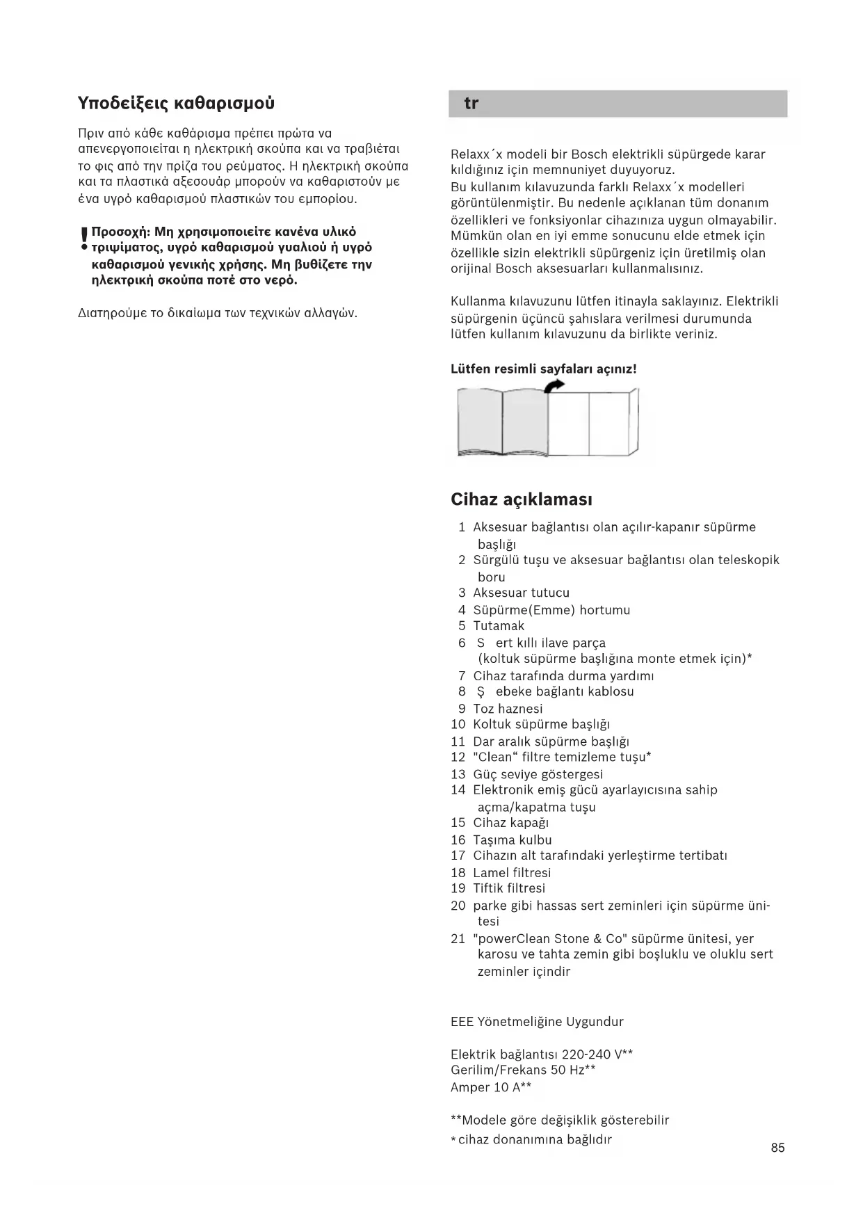 ütfen kullanım kılavuzunu da birlikte veriniz. Lütfen resimli sayfaları açınız! Cihaz açıklaması 1 Aksesuar bağlantısı olan açılır-kapanır süpürme başlığı 2 Sürgülü tuşu ve aksesuar bağlantısı olan teleskopik boru 3 Aksesuar tutucu 4 Süpürme(Emme) hortumu 5 Tutamak 6Sert kıllı ilave parça (koltuk süpürme başlığına monte etmek için)* 7 Cihaz tarafında durma yardımı 8Şebeke bağlantı kablosu 9 Toz haznesi 10 Koltuk süpürme başlığı 11 Dar aralık süpürme başlığı 12 "Clean“ filtre temizleme tuşu* 13 Güç seviye göstergesi 14 Elektronik emiş gücü ayarlayıcısına sahip açma/kapatma tuşu 15 Cihaz kapağı 16 Taşıma kulbu 17 Cihazın alt tarafındaki yerleştirme tertibatı 18 Lamel filtresi 19 Tiftik filtresi 20 parke gibi hassas sert zeminleri için süpürme üni- tesi 21 "powerClean Stone & Co" süpürme ünitesi, yer karosu ve tahta zemin gibi boşluklu ve oluklu sert zeminler içindir EEE Yönetmeliğine Uygundur Elektrik bağlantısı 220-240 V** Gerilim/Frekans 50 Hz** Amper 10 A** **Modele göre değişiklik gösterebilir