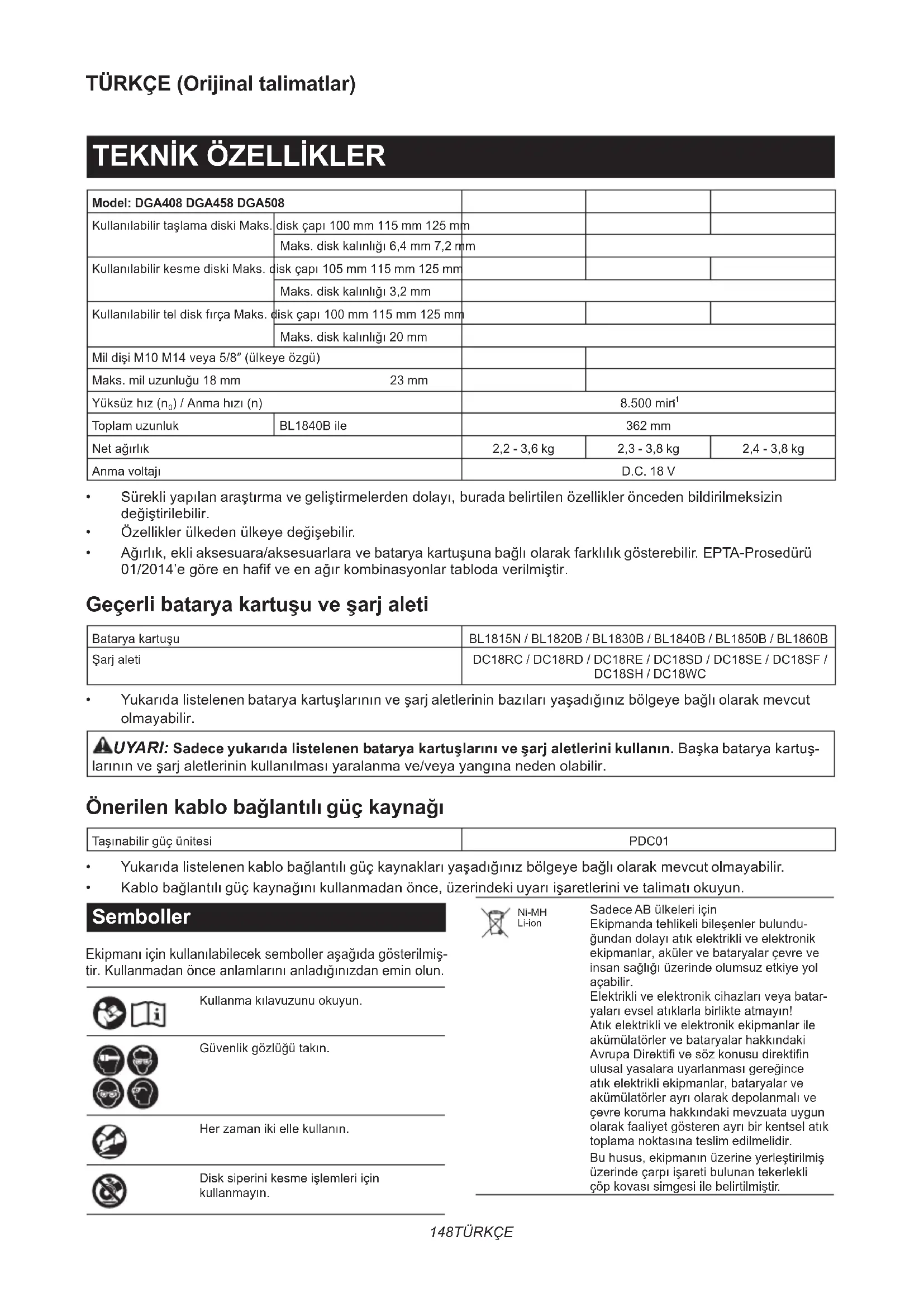 DGA408 2,5 m/s ’den az 1,5DGA458 2,5 m/s ’den az 1,5DGA508 2,5 m/s ’den az 1,5 NOT: Beyan edilen titreşim toplam değer(ler)i bir standart test yöntemine uygun şekilde ölçülmüştür ve bir aleti bir başkasıyla karşılaştırmak için kullanılabilir. NOT: Beyan edilen titreşim toplam değer(ler)i bir ön maruz kalma değerlendirmesi olarak da kullanılabilir. UYARI: Elektrikli aletin gerçek kullanımı sırasındaki titreşim emisyonu, aletin kullanım biçimlerine, özellikle işlenen iş parçasının türüne bağlı olarak beyan edilen değer(ler)den farklı olabilir. UYARI: Gerçek kullanım koşullarındaki tahmini maruziyeti baz alan, operatörü koruyacak güvenlik önlemlerini mutlaka belirleyin (çalışma döngüsü içerisinde aletin kapalı olduğu ve aktif durumda olmasının yanı sıra boşta çalıştığı zamanlar gibi, bütün zaman dilimleri göz önünde bulundurarak). UYARI: Beyan edilen titreşim emisyon değeri bu elektrikli aletin başlıca uygulamaları için kullanılır. Ancak, bu elektrikli alet başka uygulamalar için kullanılırsa titreşim emisyon değeri farklı olabilir. EC Uygunluk Beyanı Sadece Avrupa ülkeleri için EC uygunluk beyanı bu kullanım kılavuzuna Ek A olarak eklenmiştir.