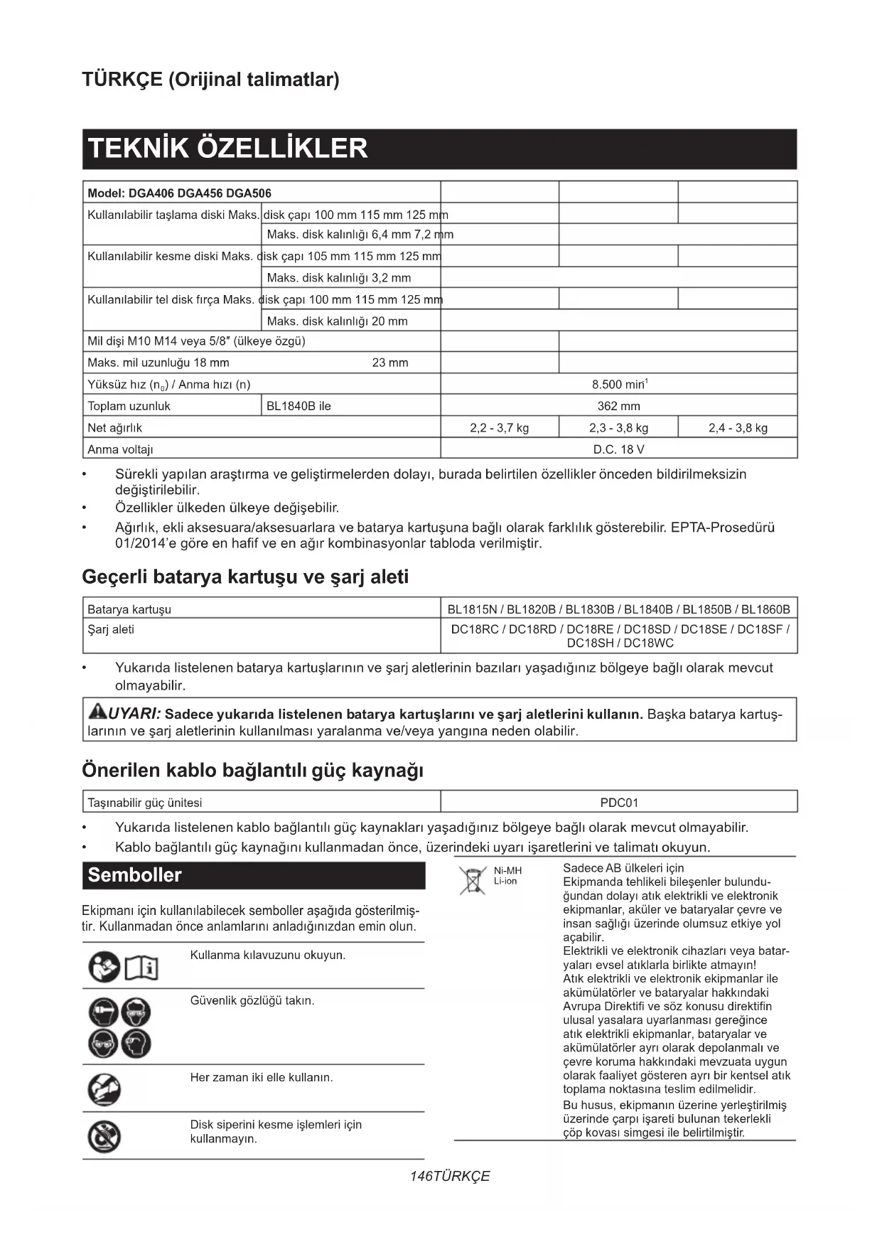 - Kablo bağlantılı güç kaynağını kullanmadan önce, üzerindeki uyarı işaretlerini ve talimatı okuyun. Semboller Ekipmanı için kullanılabilecek semboller aşağıda gösterilmiş- tir. Kullanmadan önce anlamlarını anladığınızdan emin olun. Kullanma kılavuzunu okuyun. Güvenlik gözlüğü takın. Her zaman iki elle kullanın. Disk siperini kesme işlemleri için kullanmayın. Ni-MH Li-ion Sadece AB ülkeleri için Ekipmanda tehlikeli bileşenler bulundu- ğundan dolayı atık elektrikli ve elektronik ekipmanlar, aküler ve bataryalar çevre ve insan sağlığı üzerinde olumsuz etkiye yol açabilir. Elektrikli ve elektronik cihazları veya batar- yaları evsel atıklarla birlikte atmayın! Atık elektrikli ve elektronik ekipmanlar ile akümülatörler ve bataryalar hakkındaki Avrupa Direktifi ve söz konusu direktifin ulusal yasalara uyarlanması gereğince atık elektrikli ekipmanlar, bataryalar ve akümülatörler ayrı olarak depolanmalı ve çevre koruma hakkındaki mevzuata uygun olarak faaliyet gösteren ayrı bir kentsel atık toplama noktasına teslim edilmelidir. Bu husus, ekipmanın üzerine yerleştirilmiş üzerinde çarpı işareti bulunan tekerlekli çöp kovası simgesi ile belirtilmiştir.147 TÜRKÇE Kullanım amacı Bu alet, metal ve taş malzemelerin su kullanmadan taşlanması, zımparalanması, telle fırçalanması, delik açılması ve kesilmesi amacıyla tasarlanmıştır. Gürültü Tipik A-ağırlıklı gürültü düzeyi (EN62841-2-3 standardına göre belirlenen): Model Ses basıncı sevi- yesi (L