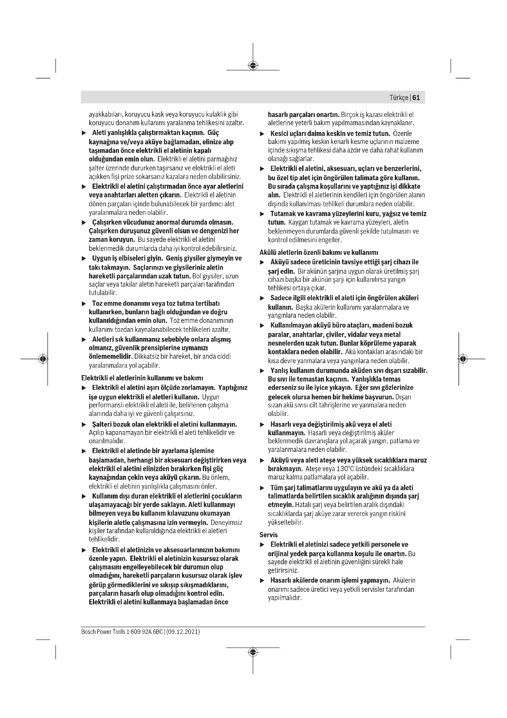 Οι αντλίες αέρα, οι μπαταρίες, τα εξαρτήματα και οι συσκευασίες πρέπει να παραδίδονται σε μια ανακύκλωση σύμφωνα με τους κανόνες προστασίας του περιβάλλοντος. Μην πετάτε τις αντλίες αέρα και τις επαναφορτιζόμενες μπαταρίες/μπαταρίες στα οικιακά απορρίμματα! Μόνο για χώρες τηςΕΕ: Σύμφωνα με την Ευρωπαϊκή οδηγία 2012/19/ΕΕ οι άχρηστες αντλίες αέρα και σύμφωνα με την Ευρωπαϊκή οδηγία 2006/66/ΕΚ οι χαλασμένες ή χρησιμοποιημένες επαναφορτιζόμενες μπαταρίες/μπαταρίες πρέπει να συλλέγονται ξεχωριστά για να ανακυκλωθούν με τρόπο φιλικό προς το περιβάλλον. Μπαταρίες/Επαναφορτιζόμενες μπαταρίες: Li-Ion: Προσέξτε παρακαλώ τις υποδείξεις στην ενότητα Μεταφορά (βλέπε «Μεταφορά», Σελίδα60). Türkçe Güvenlik talimatı Elektrikli el aletleri için genel güvenlik uyarıları UYARI Bu elektrikli el aletiyle birlikte gelen tüm güvenlik uyarılarını, talimatları, resim ve açıklamaları okuyun. Aşağıda bulunan talimatlara uyulmaması halinde elektrik çarpmalarına, yangınlara ve/veya ağır yaralanmalara neden olabilir. Bütün uyarıları ve talimat hükümlerini ileride kullanmak üzere saklayın. Uyarı ve talimat hükümlerinde kullanılan "elektrikli el aleti" terimi, akım şebekesine bağlı (elektrikli) aletlerle akü ile çalışan aletleri (akülü) kapsamaktadır. Çalışma yeri güvenliği u Çalıştığınız yeri temiz tutun ve iyi aydınlatın. Dağınık veya karanlık alanlar kazalara davetiye çıkarır. u Yakınında patlayıcı maddeler, yanıcı sıvı, gaz veya tozların bulunduğu yerlerde elektrikli el aleti ile çalışmayın. Elektrikli el aletleri, toz veya buharların tutuşmasına neden olabilecek kıvılcımlar çıkarırlar. u Elektrikli el aleti ile çalışırken çocukları ve etraftaki kişileri uzakta tutun. Dikkatiniz dağılacak olursa aletin kontrolünü kaybedebilirsiniz. Elektrik güvenliği u Elektrikli el aletinin fişi prize uymalıdır. Fişi hiçbir zaman değiştirmeyin. Korumalı (topraklanmış) elektrikli el aletleri ile birlikte adaptör fiş kullanmayın. Değiştirilmemiş fiş ve uygun priz elektrik çarpma tehlikesini azaltır. u Borular, kalorifer petekleri, ısıtıcılar ve buzdolapları gibi topraklanmış yüzeylerle vücudunuzun temas etmesinden kaçının. Vücudunuz topraklandığı anda büyük bir elektrik çarpma tehlikesi ortaya çıkar. u Elektrikli el aletlerini yağmur altında veya nemli ortamlarda bırakmayın. Suyun elektrikli el aleti içine sızması elektrik çarpma tehlikesini artırır. u Kabloya zarar vermeyin. Elektrikli el aletini kablosundan tutarak taşımayın, kabloyu kullanarak çekmeyin veya kablodan çekerek fişi çıkarmayın. Kabloyu ateş, yanıcı ve/veya keskin ve hareket eden maddelerden uzak tutun. Hasarlı veya dolaşmış kablo elektrik çarpma tehlikesini artırır. u Bir elektrikli el aleti ile açık havada çalışırken mutlaka açık havada kullanılmaya uygun uzatma kablosu kullanın. Açık havada kullanılmaya uygun uzatma kablosunun kullanılması elektrik çarpma tehlikesini azaltır. u Elektrikli el aletinin nemli ortamlarda çalıştırılması şartsa mutlaka kaçak akım koruma rölesi kullanın. Kaçak akım koruma rölesi şalterinin kullanımı elektrik çarpma tehlikesini azaltır. Kişilerin Güvenliği u Dikkatli olun, ne yaptığınıza dikkat edin, elektrikli el aleti ile işinizi makul bir tempo ve yöntemle yürütün. Yorgunsanız, kullandığınız hapların, ilaçların veya alkolün etkisinde iseniz elektrikli el aletini kullanmayın. Elektrikli el aletini kullanırken bir anki dikkatsizlik önemli yaralanmalara neden olabilir. u Daima kişisel koruyucu donanım kullanın. Daima koruyucu gözlük kullanın. Elektrikli el aletinin türü ve kullanımına uygun olarak; toz maskesi, kaymayan iş 1 609 92A 6BC | (09.12.2021) Bosch Power ToolsTürkçe | 61 ayakkabıları, koruyucu kask veya koruyucu kulaklık gibi koruyucu donanım kullanımı yaralanma tehlikesini azaltır. u Aleti yanlışlıkla çalıştırmaktan kaçının. Güç kaynağına ve/veya aküye bağlamadan, elinize alıp taşımadan önce elektrikli el aletinin kapalı olduğundan emin olun. Elektrikli el aletini parmağınız şalter üzerinde dururken taşırsanız ve elektrikli el aleti açıkken fişi prize sokarsanız kazalara neden olabilirsiniz. u Elektrikli el aletini çalıştırmadan önce ayar aletlerini veya anahtarları aletten çıkarın. Elektrikli el aletinin dönen parçaları içinde bulunabilecek bir yardımcı alet yaralanmalara neden olabilir. u Çalışırken vücudunuz anormal durumda olmasın. Çalışırken duruşunuz güvenli olsun ve dengenizi her zaman koruyun. Bu sayede elektrikli el aletini beklenmedik durumlarda daha iyi kontrol edebilirsiniz. u Uygun iş elbiseleri giyin. Geniş giysiler giymeyin ve takı takmayın. Saçlarınızı ve giysileriniz aletin hareketli parçalarından uzak tutun. Bol giysiler, uzun saçlar veya takılar aletin hareketli parçaları tarafından tutulabilir. u Toz emme donanımı veya toz tutma tertibatı kullanırken, bunların bağlı olduğundan ve doğru kullanıldığından emin olun. Toz emme donanımının kullanımı tozdan kaynalanabilecek tehlikeleri azaltır. u Aletleri sık kullanmanız sebebiyle onlara alışmış olmanız, güvenlik prensiplerine uymanızı önlememelidir. Dikkatsiz bir hareket, bir anda ciddi yaralanmalara yol açabilir. Elektrikli el aletlerinin kullanımı ve bakım