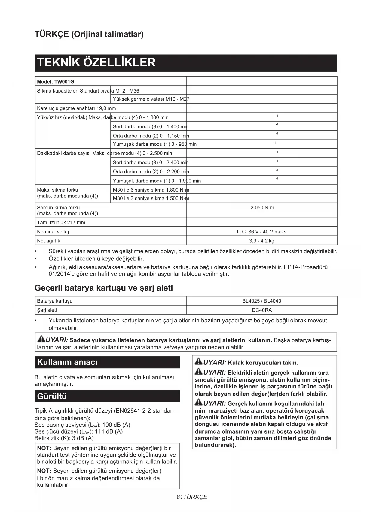 - Yukarıda listelenen batarya kartuşlarının ve şarj aletlerinin bazıları yaşadığınız bölgeye bağlı olarak mevcut olmayabilir. UYARI: Sadece yukarıda listelenen batarya kartuşlarını ve şarj aletlerini kullanın. Başka batarya kartuş- larının ve şarj aletlerinin kullanılması yaralanma ve/veya yangına neden olabilir. Kullanım amacı Bu aletin cıvata ve somunları sıkmak için kullanılması amaçlanmıştır. Gürültü Tipik A-ağırlıklı gürültü düzeyi (EN62841-2-2 standar- dına göre belirlenen): Ses basınç seviyesi (L