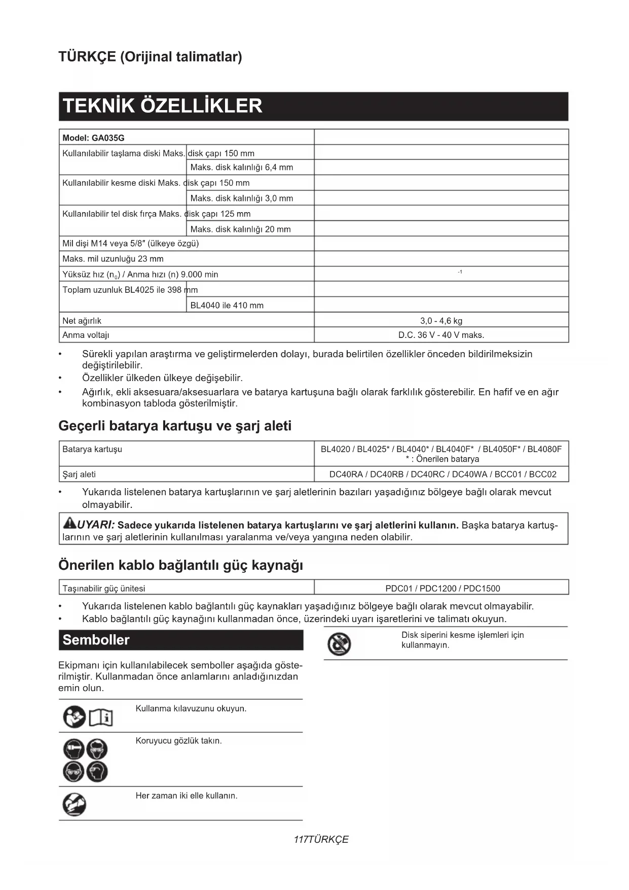- Kablo bağlantılı güç kaynağını kullanmadan önce, üzerindeki uyarı işaretlerini ve talimatı okuyun. Semboller Ekipmanı için kullanılabilecek semboller aşağıda göste- rilmiştir. Kullanmadan önce anlamlarını anladığınızdan emin olun. Kullanma kılavuzunu okuyun. Koruyucu gözlük takın. Her zaman iki elle kullanın. Disk siperini kesme işlemleri için kullanmayın.118 TÜRKÇE Ni-MH Li-ion Sadece AB ülkeleri için Ekipmanda tehlikeli bileşenler bulundu- ğundan dolayı atık elektrikli ve elektronik ekipmanlar, aküler ve bataryalar çevre ve insan sağlığı üzerinde olumsuz etkiye yol açabilir. Elektrikli ve elektronik cihazları veya batar- yaları evsel atıklarla birlikte atmayın! Atık elektrikli ve elektronik ekipmanlar ile akümülatörler ve bataryalar hakkındaki Avrupa Direktifi ve söz konusu direktifin ulusal yasalara uyarlanması gereğince atık elektrikli ekipmanlar, bataryalar ve akümülatörler ayrı olarak depolanmalı ve çevre koruma hakkındaki mevzuata uygun olarak faaliyet gösteren ayrı bir kentsel atık toplama noktasına teslim edilmelidir. Bu husus, ekipmanın üzerine yerleştirilmiş üzerinde çarpı işareti bulunan tekerlekli çöp kovası simgesi ile belirtilmiştir. Kullanım amacı Bu alet, metal ve taş malzemelerin su kullanmadan taşlanması, zımparalanması, telle fırçalanması, delik açılması ve kesilmesi amacıyla tasarlanmıştır. Gürültü Tipik A-ağırlıklı gürültü düzeyi (EN62841-2-3 standardına göre belirlenen): Model Ses basıncı seviyesi (L