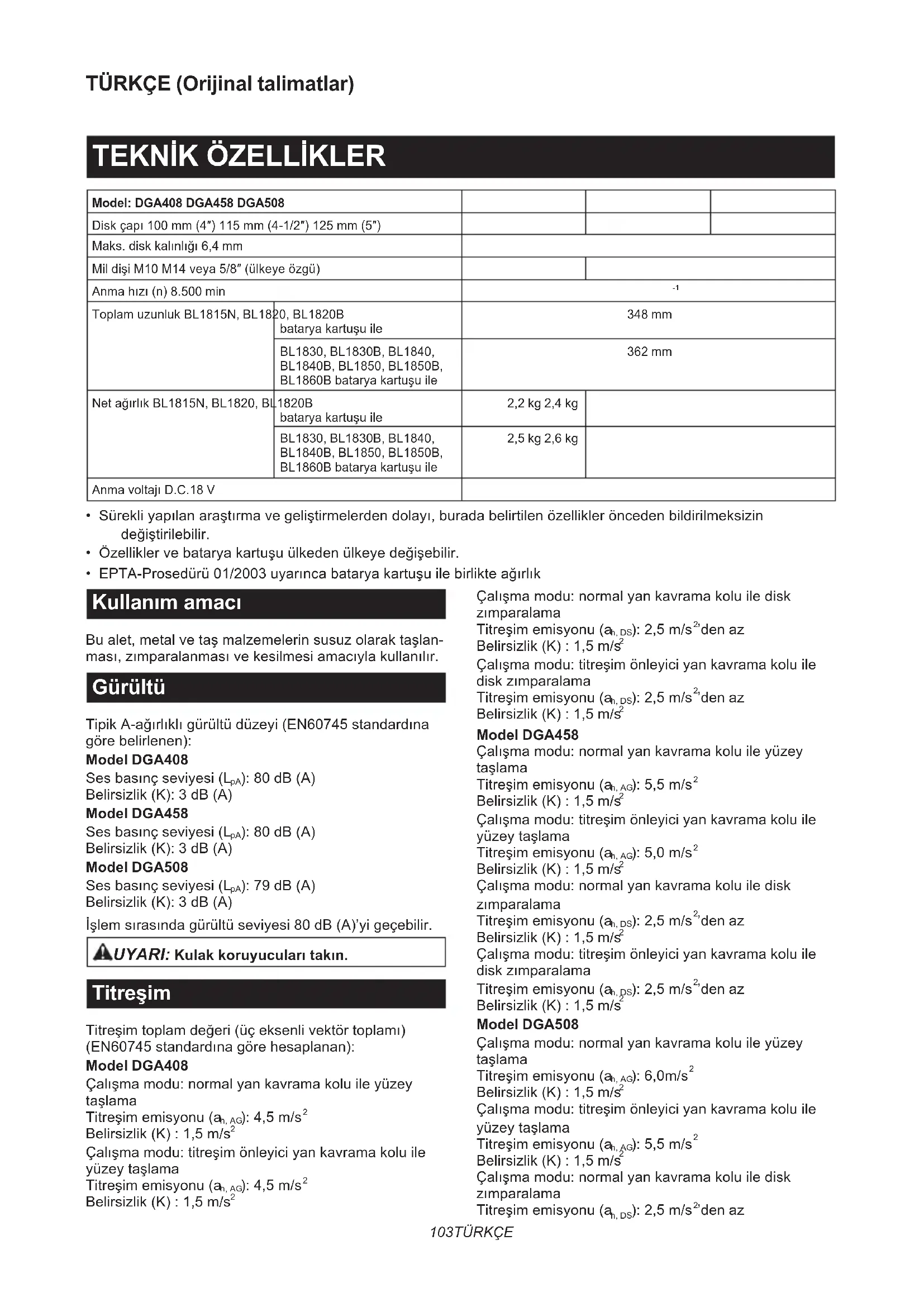 - EPTA-Prosedürü 01/2003 uyarınca batarya kartuşu ile birlikte ağırlık Kullanım amacı Bu alet, metal ve taş malzemelerin susuz olarak taşlan- ması, zımparalanması ve kesilmesi amacıyla kullanılır. Gürültü Tipik A-ağırlıklı gürültü düzeyi (EN60745 standardına göre belirlenen): Model DGA408 Ses basınç seviyesi (L