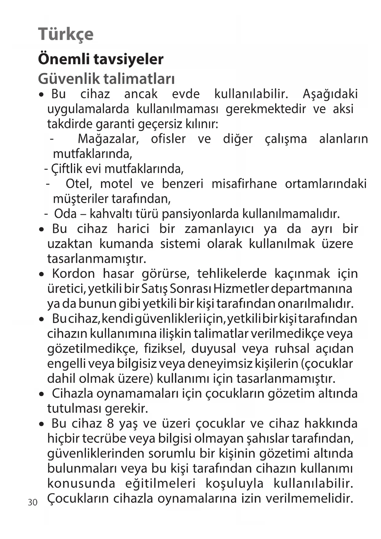 - Bu cihaz 8 yaş ve üzeri çocuklar ve cihaz hakkında hiçbir tecrübe veya bilgisi olmayan şahıslar tarafından, güvenliklerinden sorumlu bir kişinin gözetimi altında bulunmaları veya bu kişi tarafından cihazın kullanımı konusunda eğitilmeleri koşuluyla kullanılabilir. Çocukların cihazla oynamalarına izin verilmemelidir. Türkçe31 Kullanıcı tarafından gerçekleştirilen temizlik ve bakım işlemlerinin, 8 yaş veya üzeri olmaması ve bir yetişkin gözetiminde bulunmaması halinde, çocuklar tarafından gerçekleştirilmesine izin verilmemelidir. Cihazı ve kablosunu 8 yaş altındaki çocuklardan uzak tutun.