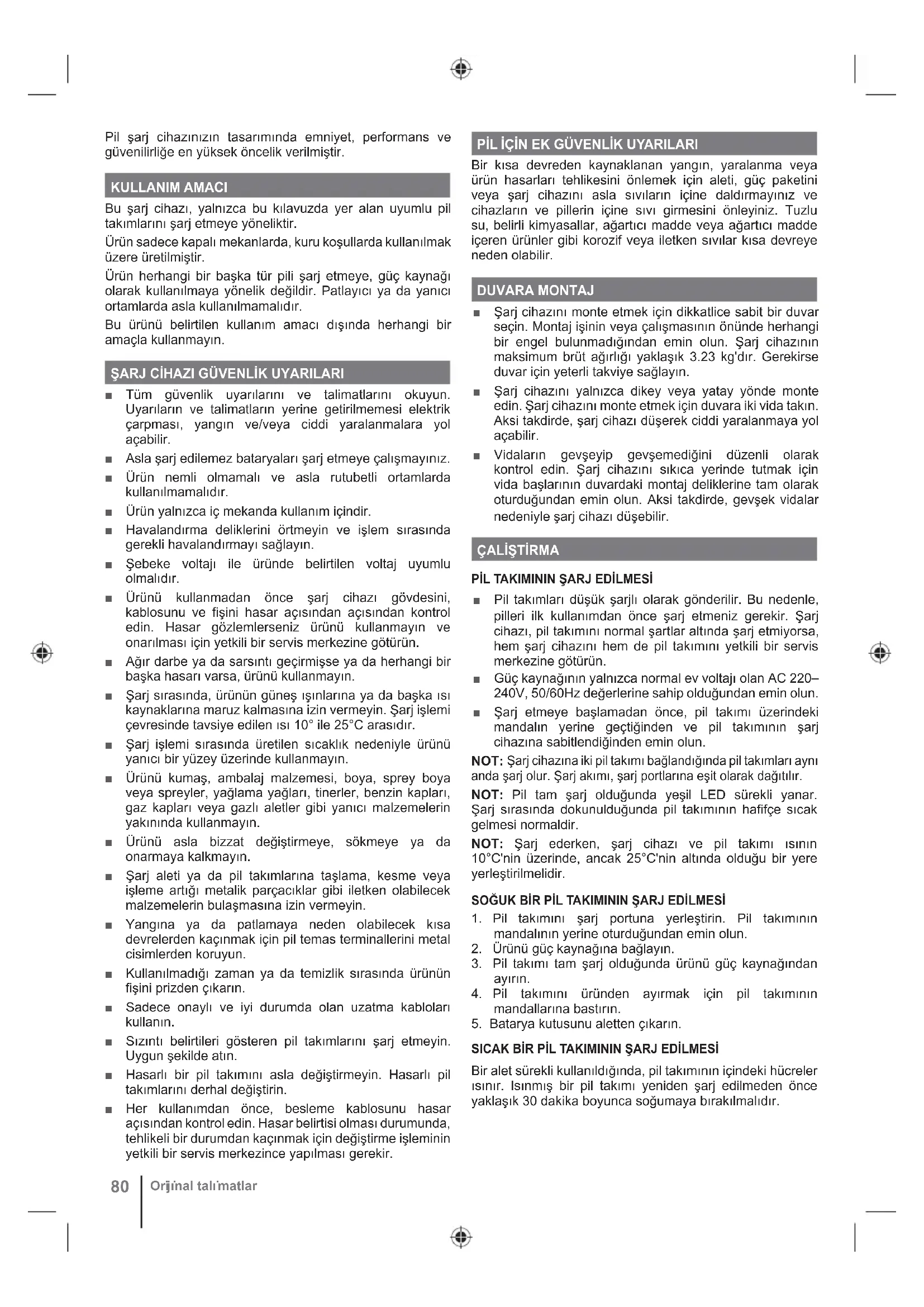 ELPil şarj cihazınızın tasarımında emniyet, performans ve güvenilirliğe en yüksek öncelik verilmiştir. KULLANIM AMACI Bu şarj cihazı, yalnızca bu kılavuzda yer alan uyumlu pil takımlarını şarj etmeye yöneliktir. Ürün sadece kapalı mekanlarda, kuru koşullarda kullanılmak üzere üretilmiştir. Ürün herhangi bir başka tür pili şarj etmeye, güç kaynağı olarak kullanılmaya yönelik değildir. Patlayıcı ya da yanıcı ortamlarda asla kullanılmamalıdır. Bu ürünü belirtilen kullanım amacı dışında herhangi bir amaçla kullanmayın. ŞARJ CİHAZI GÜVENLİK UYARILARI ■ Tüm güvenlik uyarılarını ve talimatlarını okuyun. Uyarıların ve talimatların yerine getirilmemesi elektrik çarpması, yangın ve/veya ciddi yaralanmalara yol açabilir. ■ Asla şarj edilemez bataryaları şarj etmeye çalışmayınız. ■ Ürün nemli olmamalı ve asla rutubetli ortamlarda kullanılmamalıdır. ■ Ürün yalnızca iç mekanda kullanım içindir. ■ Havalandırma deliklerini örtmeyin ve işlem sırasında gerekli havalandırmayı sağlayın. ■ Şebeke voltajı ile üründe belirtilen voltaj uyumlu olmalıdır. ■ Ürünü kullanmadan önce şarj cihazı gövdesini, kablosunu ve fişini hasar açısından açısından kontrol edin. Hasar gözlemlerseniz ürünü kullanmayın ve onarılması için yetkili bir servis merkezine götürün. ■ Ağır darbe ya da sarsıntı geçirmişse ya da herhangi bir başka hasarı varsa, ürünü kullanmayın. ■ Şarj sırasında, ürünün güneş ışınlarına ya da başka ısı kaynaklarına maruz kalmasına izin vermeyin. Şarj işlemi çevresinde tavsiye edilen ısı 10° ile 25°C arasıdır. ■ Şarj işlemi sırasında üretilen sıcaklık nedeniyle ürünü yanıcı bir yüzey üzerinde kullanmayın. ■ Ürünü kumaş, ambalaj malzemesi, boya, sprey boya veya spreyler, yağlama yağları, tinerler, benzin kapları, gaz kapları veya gazlı aletler gibi yanıcı malzemelerin yakınında kullanmayın. ■ Ürünü asla bizzat değiştirmeye, sökmeye ya da onarmaya kalkmayın. ■ Şarj aleti ya da pil takımlarına taşlama, kesme veya işleme artığı metalik parçacıklar gibi iletken olabilecek malzemelerin bulaşmasına izin vermeyin. ■ Yangına ya da patlamaya neden olabilecek kısa devrelerden kaçınmak için pil temas terminallerini metal cisimlerden koruyun. ■ Kullanılmadığı zaman ya da temizlik sırasında ürünün fişini prizden çıkarın. ■ Sadece onaylı ve iyi durumda olan uzatma kabloları kullanın. ■ Sızıntı belirtileri gösteren pil takımlarını şarj etmeyin. Uygun şekilde atın. ■ Hasarlı bir pil takımını asla değiştirmeyin. Hasarlı pil takımlarını derhal değiştirin. ■ Her kullanımdan önce, besleme kablosunu hasar açısından kontrol edin. Hasar belirtisi olması durumunda, tehlikeli bir durumdan kaçınmak için değiştirme işleminin yetkili bir servis merkezince yapılması gerekir. PİL İÇİN EK GÜVENLİK UYARILARI Bir kısa devreden kaynaklanan yangın, yaralanma veya ürün hasarları tehlikesini önlemek için aleti, güç paketini veya şarj cihazını asla sıvıların içine daldırmayınız ve cihazların ve pillerin içine sıvı girmesini önleyiniz. Tuzlu su, belirli kimyasallar, ağartıcı madde veya ağartıcı madde içeren ürünler gibi korozif veya iletken sıvılar kısa devreye neden olabilir. DUVARA MONTAJ ■ Şarj cihazını monte etmek için dikkatlice sabit bir duvar seçin. Montaj işinin veya çalışmasının önünde herhangi bir engel bulunmadığından emin olun. Şarj cihazının maksimum brüt ağırlığı yaklaşık 3.23 kg'dır. Gerekirse duvar için yeterli takviye sağlayın. ■ Şarj cihazını yalnızca dikey veya yatay yönde monte edin. Şarj cihazını monte etmek için duvara iki vida takın. Aksi takdirde, şarj cihazı düşerek ciddi yaralanmaya yol açabilir. ■ Vidaların gevşeyip gevşemediğini düzenli olarak kontrol edin. Şarj cihazını sıkıca yerinde tutmak için vida başlarının duvardaki montaj deliklerine tam olarak oturduğundan emin olun. Aksi takdirde, gevşek vidalar nedeniyle şarj cihazı düşebilir.