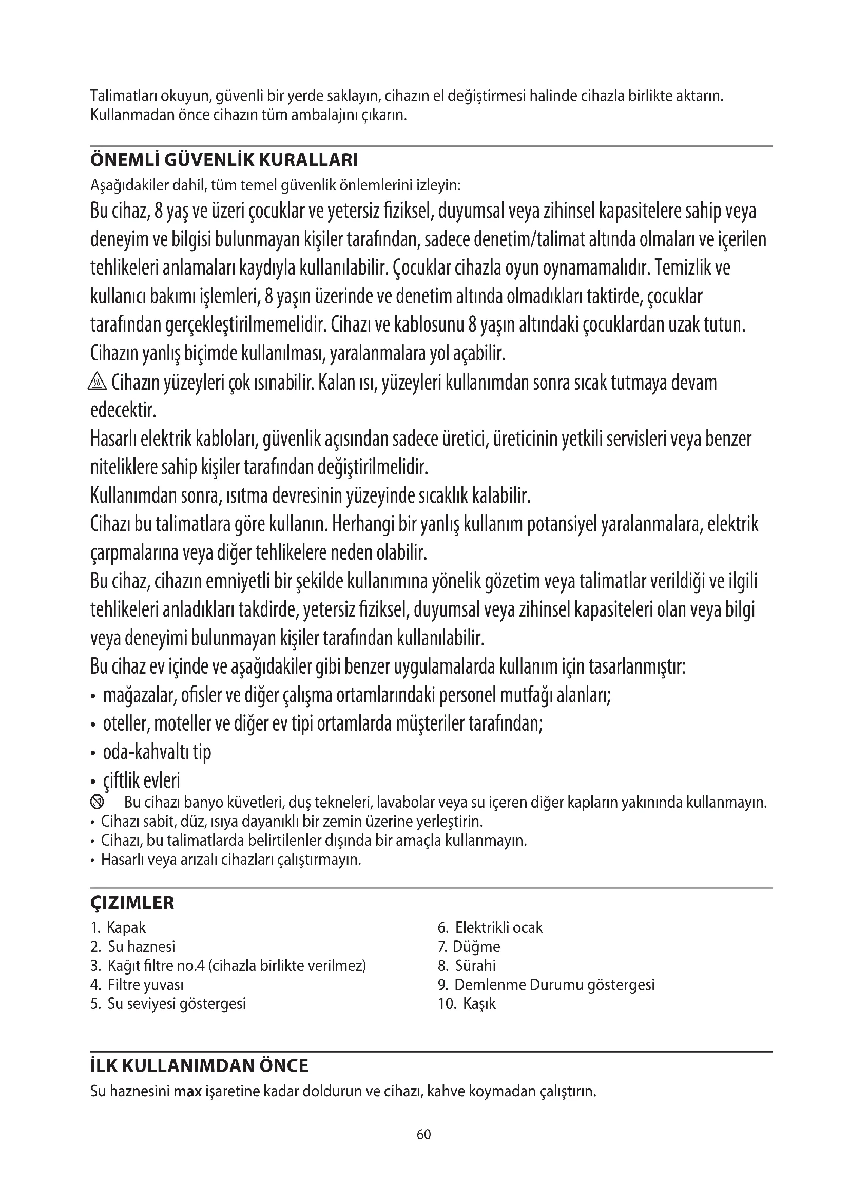 Aşağıdakiler dahil, tüm temel güvenlik önlemlerini izleyin: Bu cihaz, 8 yaş ve üzeri çocuklar ve yetersiz fiziksel, duyumsal veya zihinsel kapasitelere sahip veya deneyim ve bilgisi bulunmayan kişiler tarafından, sadece denetim/talimat altında olmaları ve içerilen tehlikeleri anlamaları kaydıyla kullanılabilir. Çocuklar cihazla oyun oynamamalıdır. Temizlik ve kullanıcı bakımı işlemleri, 8 yaşın üzerinde ve denetim altında olmadıkları taktirde, çocuklar tarafından gerçekleştirilmemelidir. Cihazı ve kablosunu 8 yaşın altındaki çocuklardan uzak tutun. Cihazın yanlış biçimde kullanılması, yaralanmalara yol açabilir. h Cihazın yüzeyleri çok ısınabilir. Kalan ısı, yüzeyleri kullanımdan sonra sıcak tutmaya devam edecektir. Hasarlı elektrik kabloları, güvenlik açısından sadece üretici, üreticinin yetkili servisleri veya benzer niteliklere sahip kişiler tarafından değiştirilmelidir. Kullanımdan sonra, ısıtma devresinin yüzeyinde sıcaklık kalabilir. Cihazı bu talimatlara göre kullanın. Herhangi bir yanlış kullanım potansiyel yaralanmalara, elektrik çarpmalarına veya diğer tehlikelere neden olabilir. Bu cihaz, cihazın emniyetli bir şekilde kullanımına yönelik gözetim veya talimatlar verildiği ve ilgili tehlikeleri anladıkları takdirde, yetersiz fiziksel, duyumsal veya zihinsel kapasiteleri olan veya bilgi veya deneyimi bulunmayan kişiler tarafından kullanılabilir. Bu cihaz ev içinde ve aşağıdakiler gibi benzer uygulamalarda kullanım için tasarlanmıştır: