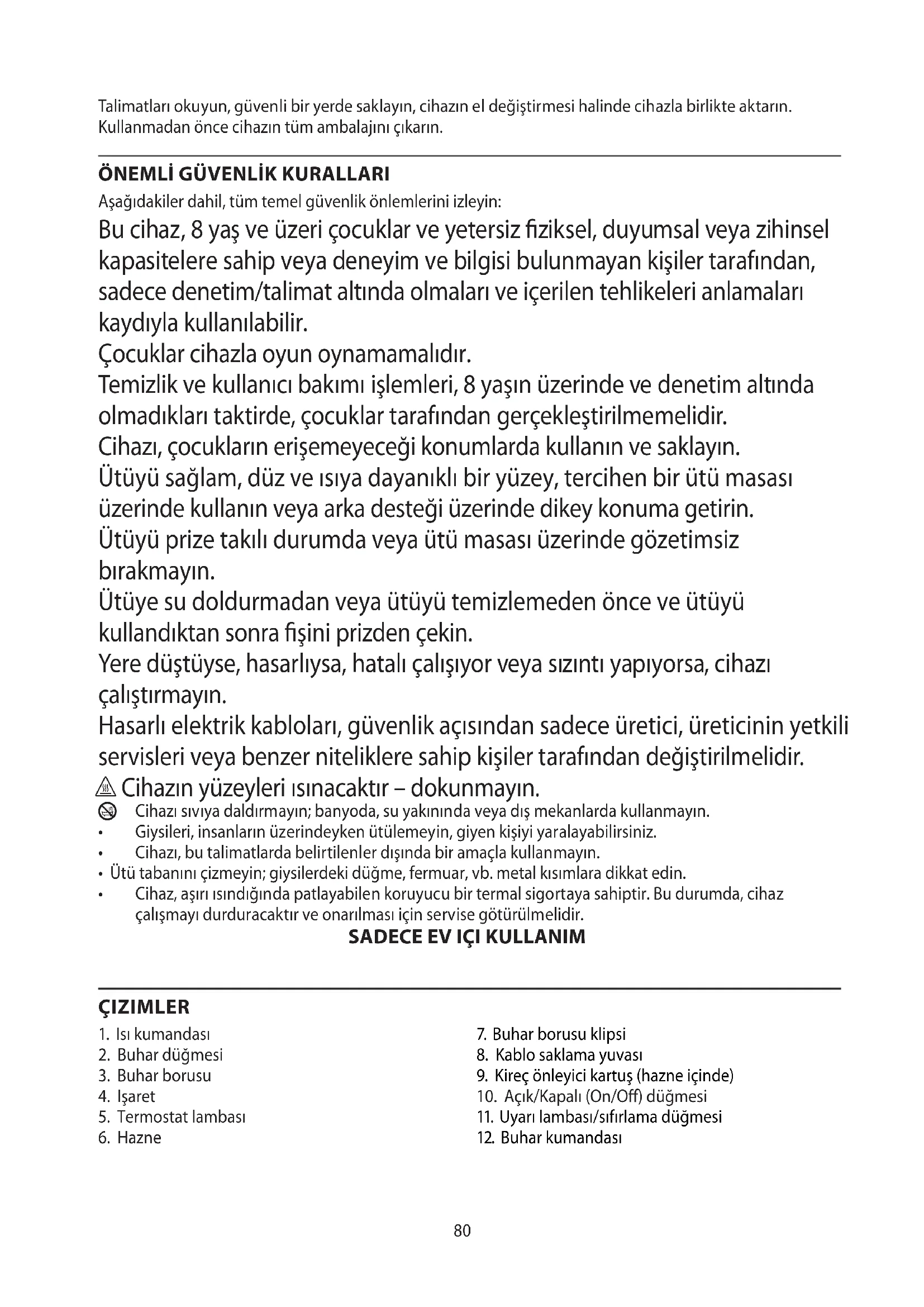 Aşağıdakiler dahil, tüm temel güvenlik önlemlerini izleyin: Bu cihaz, 8 yaş ve üzeri çocuklar ve yetersiz ziksel, duyumsal veya zihinsel kapasitelere sahip veya deneyim ve bilgisi bulunmayan kişiler tarafından, sadece denetim/talimat altında olmaları ve içerilen tehlikeleri anlamaları kaydıyla kullanılabilir. Çocuklar cihazla oyun oynamamalıdır. Temizlik ve kullanıcı bakımı işlemleri, 8 yaşın üzerinde ve denetim altında olmadıkları taktirde, çocuklar tarafından gerçekleştirilmemelidir. Cihazı, çocukların erişemeyeceği konumlarda kullanın ve saklayın. Ütüyü sağlam, düz ve ısıya dayanıklı bir yüzey, tercihen bir ütü masası üzerinde kullanın veya arka desteği üzerinde dikey konuma getirin. Ütüyü prize takılı durumda veya ütü masası üzerinde gözetimsiz bırakmayın. Ütüye su doldurmadan veya ütüyü temizlemeden önce ve ütüyü kullandıktan sonra şini prizden çekin. Yere düştüyse, hasarlıysa, hatalı çalışıyor veya sızıntı yapıyorsa, cihazı çalıştırmayın. Hasarlı elektrik kabloları, güvenlik açısından sadece üretici, üreticinin yetkili servisleri veya benzer niteliklere sahip kişiler tarafından değiştirilmelidir. h Cihazın yüzeyleri ısınacaktır – dokunmayın.