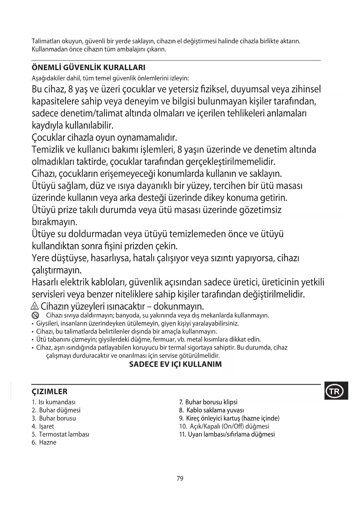 Aşağıdakiler dahil, tüm temel güvenlik önlemlerini izleyin: Bu cihaz, 8 yaş ve üzeri çocuklar ve yetersiz ziksel, duyumsal veya zihinsel kapasitelere sahip veya deneyim ve bilgisi bulunmayan kişiler tarafından, sadece denetim/talimat altında olmaları ve içerilen tehlikeleri anlamaları kaydıyla kullanılabilir. Çocuklar cihazla oyun oynamamalıdır. Temizlik ve kullanıcı bakımı işlemleri, 8 yaşın üzerinde ve denetim altında olmadıkları taktirde, çocuklar tarafından gerçekleştirilmemelidir. Cihazı, çocukların erişemeyeceği konumlarda kullanın ve saklayın. Ütüyü sağlam, düz ve ısıya dayanıklı bir yüzey, tercihen bir ütü masası üzerinde kullanın veya arka desteği üzerinde dikey konuma getirin. Ütüyü prize takılı durumda veya ütü masası üzerinde gözetimsiz bırakmayın. Ütüye su doldurmadan veya ütüyü temizlemeden önce ve ütüyü kullandıktan sonra şini prizden çekin. Yere düştüyse, hasarlıysa, hatalı çalışıyor veya sızıntı yapıyorsa, cihazı çalıştırmayın. Hasarlı elektrik kabloları, güvenlik açısından sadece üretici, üreticinin yetkili servisleri veya benzer niteliklere sahip kişiler tarafından değiştirilmelidir. h Cihazın yüzeyleri ısınacaktır – dokunmayın.