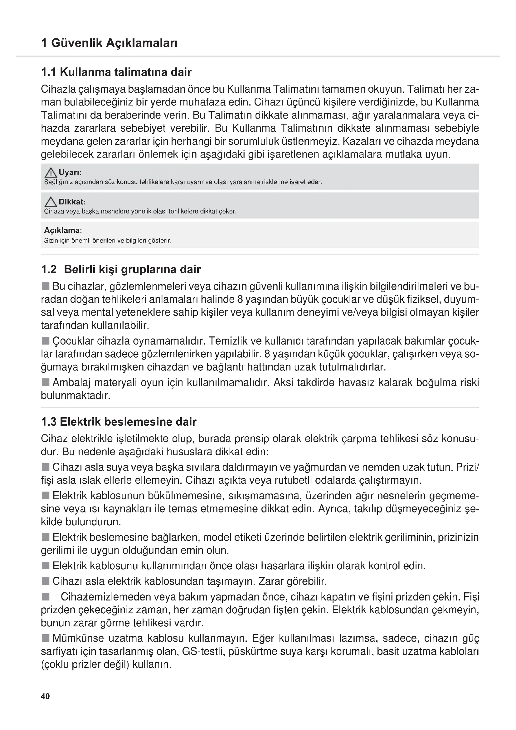 Cihaz elektrikle iúletilmekte olup, burada prensip olarak elektrik çarpma tehlikesi söz konusu- dur. Bu nedenle aúa÷Õdaki hususlara dikkat edin: CihazÕ asla suya veya baúka sÕvÕlara daldÕrmayÕn ve ya÷murdan ve nemden uzak tutun. Prizi/ fiúi asla Õslak ellerle ellemeyin. CihazÕ açÕkta veya rutubetli odalarda çalÕútÕrmayÕn. Elektrik kablosunun bükülmemesine, sÕkÕúmamasÕna, üzerinden a÷Õr nesnelerin geçmeme- sine veya ÕsÕ kaynaklarÕ ile temas etmemesine dikkat edin. AyrÕca, takÕlÕp düúmeyece÷iniz úe- kilde bulundurun. Elektrik beslemesine ba÷larken, model etiketi üzerinde belirtilen elektrik geriliminin, prizinizin gerilimi ile uygun oldu÷undan emin olun. Elektrik kablosunu kullanÕmÕndan önce olasÕ hasarlara iliúkin olarak kontrol edin. CihazÕ asla elektrik kablosundan taúÕmayÕn. Zarar görebilir. Cihaz Õ temizlemeden veya bakÕm yapmadan önce, cihazÕ kapatÕn ve fiúini prizden çekin. Fiúi prizden çekece÷iniz zaman, her zaman do÷rudan fiúten çekin. Elektrik kablosundan çekmeyin, bunun zarar görme tehlikesi vardÕr. Mümkünse uzatma kablosu kullanmayÕn. E÷er kullanÕlmasÕ lazÕmsa, sadece, cihazÕn güç sarfiyatÕ için tasarlanmÕú olan, GS-testli, püskürtme suya karúÕ korumalÕ, basit uzatma kablolarÕ (çoklu prizler de÷il) kullanÕn. UyarÕ: Sa÷lÕ÷ÕnÕz açÕsÕndan söz konusu tehlikelere karúÕ uyarÕr ve olasÕ yaralanma risklerine iúaret eder. Dikkat: Cihaza veya baúka nesnelere yönelik olasÕ tehlikelere dikkat çeker. AçÕklama: Sizin için önemli önerileri ve bilgileri gösterir. DD 7374.book Seite 40 Mittwoch, 25. Februar 2015 9:48 0941 1 Güvenlik AçÕklamalarÕ