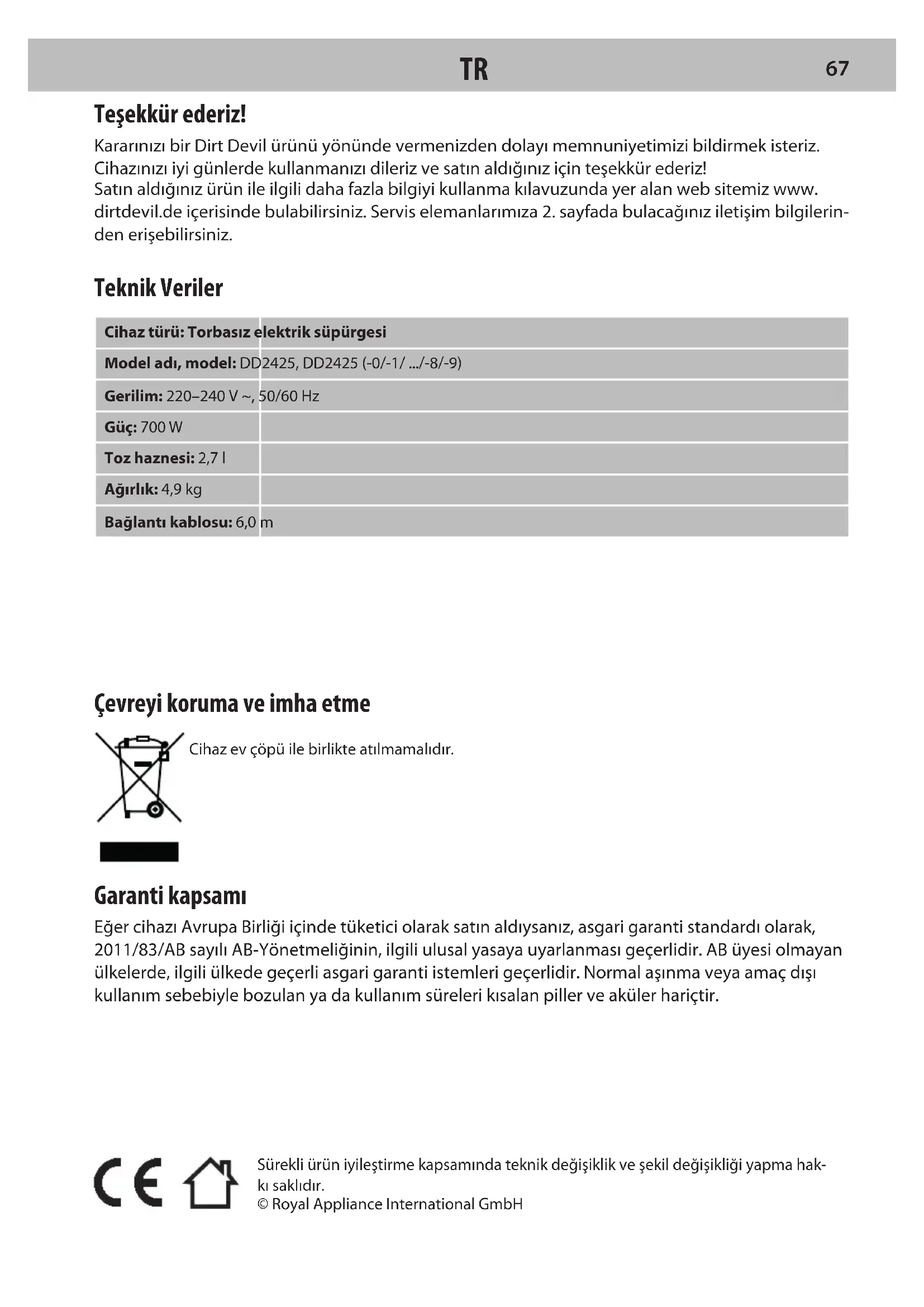 66Çevreyi koruma ve imha etme Cihaz ev çöpü ile birlikte atılmamalıdır. Garanti kapsamı Eğer cihazı Avrupa Birliği içinde tüketici olarak satın aldıysanız, asgari garanti standardı olarak, 2011/83/AB sayılı AB-Yönetmeliğinin, ilgili ulusal yasaya uyarlanması geçerlidir. AB üyesi olmayan ülkelerde, ilgili ülkede geçerli asgari garanti istemleri geçerlidir. Normal aşınma veya amaç dışı kullanım sebebiyle bozulan ya da kullanım süreleri kısalan piller ve aküler hariçtir. Sürekli ürün iyileştirme kapsamında teknik değişiklik ve şekil değişikliği yapma hak- kı saklıdır. © Royal Appliance International GmbH Teşekkür ederiz! Kararınızı bir Dirt Devil ürünü yönünde vermenizden dolayı memnuniyetimizi bildirmek isteriz. Cihazınızı iyi günlerde kullanmanızı dileriz ve satın aldığınız için teşekkür ederiz! Satın aldığınız ürün ile ilgili daha fazla bilgiyi kullanma kılavuzunda yer alan web sitemiz www. dirtdevil.de içerisinde bulabilirsiniz. Servis elemanlarımıza 2. sayfada bulacağınız iletişim bilgilerin- den erişebilirsiniz. Teknk Verler Cihaz türü: Torbasız elektrik süpürgesi Model adı, model: DD2425, DD2425 (-0/-1/ .../-8/-9) Gerilim: 220–240 V ~, 50/60 Hz Güç: 700 W Toz haznesi: 2,7 l Ağırlık: 4,9 kg Bağlantı kablosu: 6,0 m