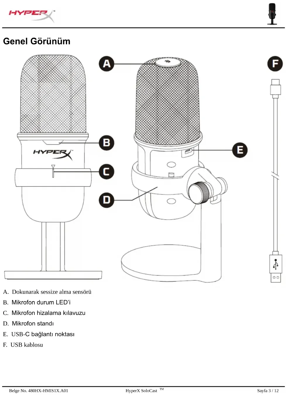 Genel Görünüm A. Dokunarak sessize alma sensörü B. Mikrofon durum LED’i C. Mikrofon hizalama kılavuzu D. Mikrofon standı E. USB-C bağlantı noktası F. USB kablosuBelge No. 480HX-HMIS1X.A01 HyperX SoloCast