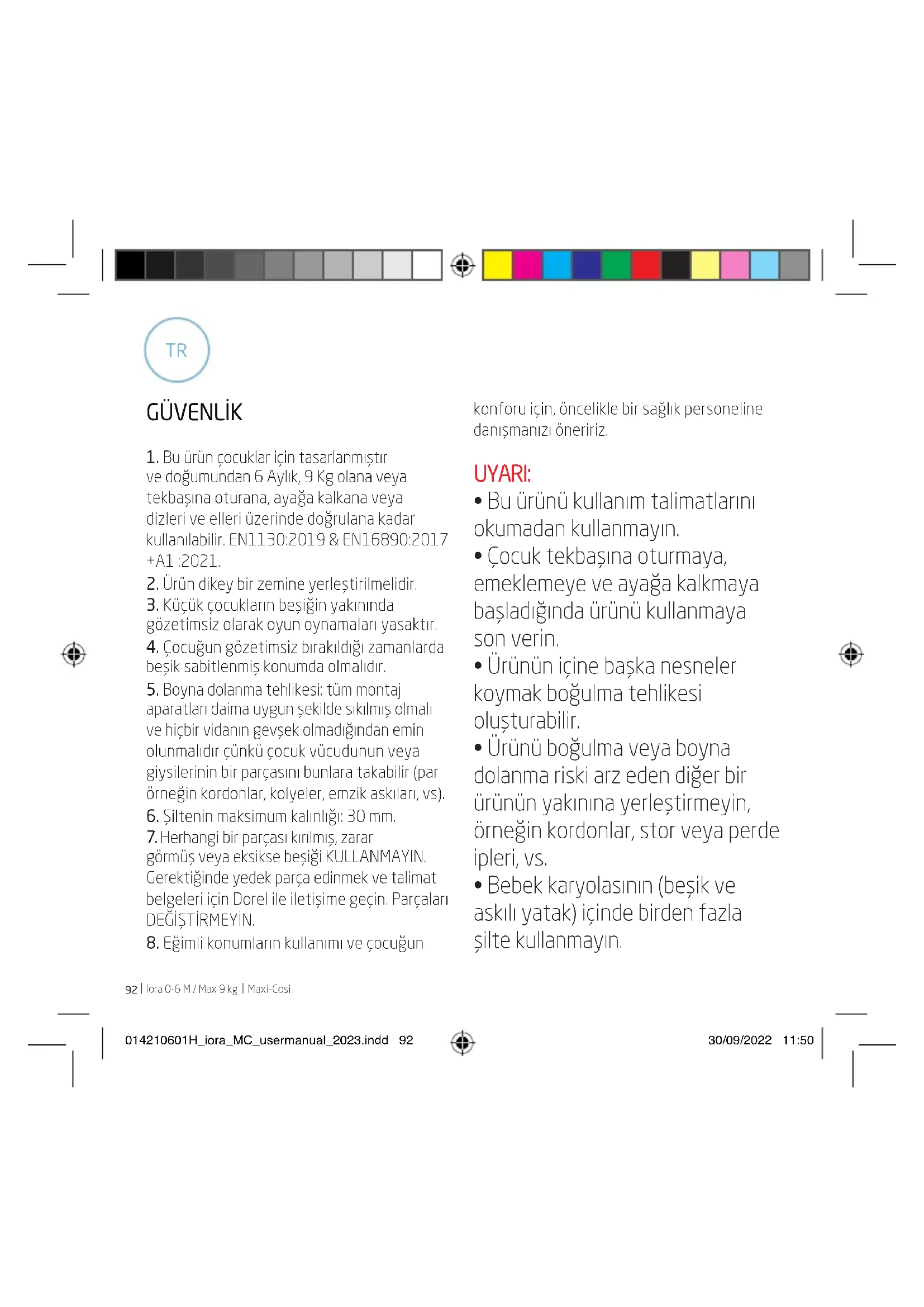 ve doğumundan 6 Aylık, 9 Kg olana veya tekbaşına oturana, ayağa kalkana veya dizleri ve elleri üzerinde doğrulana kadar kullanılabilir. EN1130:2019 & EN16890:2017 +A1 :2021.