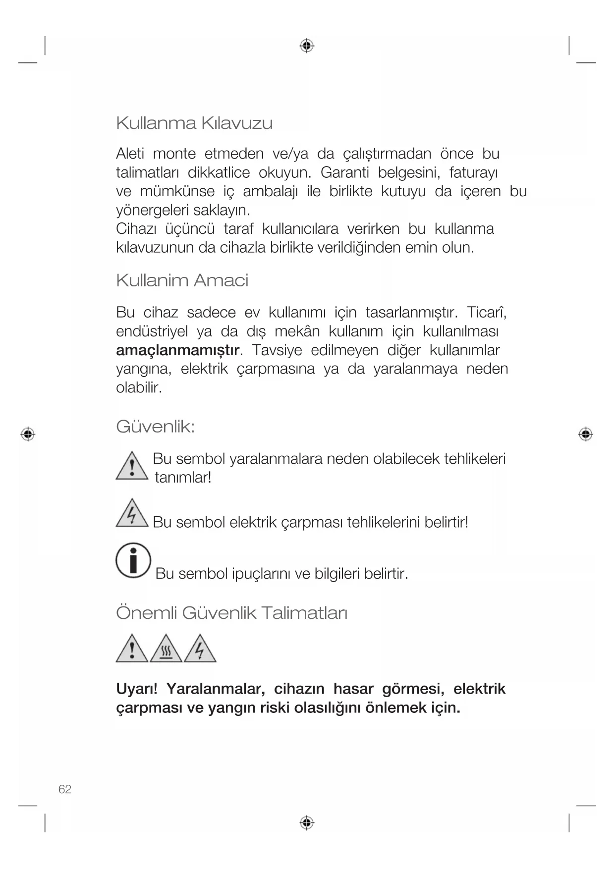 - pordañoscausadosporelpropietario. Esta garantía no afecta su derecho estatutario, ni ningún derecho legal que pueda tener como cliente bajo la legislación nacional aplicable que rija la compra de bienes. Para hacer valer su derecho de garantía durante el periodo garantizado, el cliente debe proporcionar una evidencia de la fecha de compra (recibo). La garantía debe presentarse contra KORONA electric GmbH, Sundern/Alemania. Línea telefónica directa: +49 2933 90284-80 Correo electrónico: service@korona-electric.de Página web: www.korona-electric.de dentro de los 2 años posteriores a la fecha de compra. En caso de hacer valer la garantía, el cliente tiene derecho a tener su aparato reparado en nuestra tienda o en una tienda autorizada. No se otorgan más derechos (por la garantía) al consumidor.62 Kullanma Kılavuzu Aleti monte etmeden ve/ya da çalıștırmadan önce bu talimatları dikkatlice okuyun. Garanti belgesini, faturayı ve mümkünse iç ambalajı ile birlikte kutuyu da içeren bu yönergeleri saklayın. Cihazı üçüncü taraf kullanıcılara verirken bu kullanma kılavuzunun da cihazla birlikte verildiğinden emin olun. Kullanim Amaci Bu cihaz sadece ev kullanımı için tasarlanmıștır. Ticarî, endüstriyel ya da dıș mekân kullanım için kullanılması amaçlanmamıştır. Tavsiye edilmeyen diğer kullanımlar yangına, elektrik çarpmasına ya da yaralanmaya neden olabilir. Güvenlik: Bu sembol yaralanmalara neden olabilecek tehlikeleri tanımlar! Bu sembol elektrik çarpması tehlikelerini belirtir! Bu sembol ipuçlarını ve bilgileri belirtir. Önemli Güvenlik Talimatları Uyarı! Yaralanmalar, cihazın hasar görmesi, elektrik çarpması ve yangın riski olasılığını önlemek için.TÜRKÇE Kullanma Kılavuzu