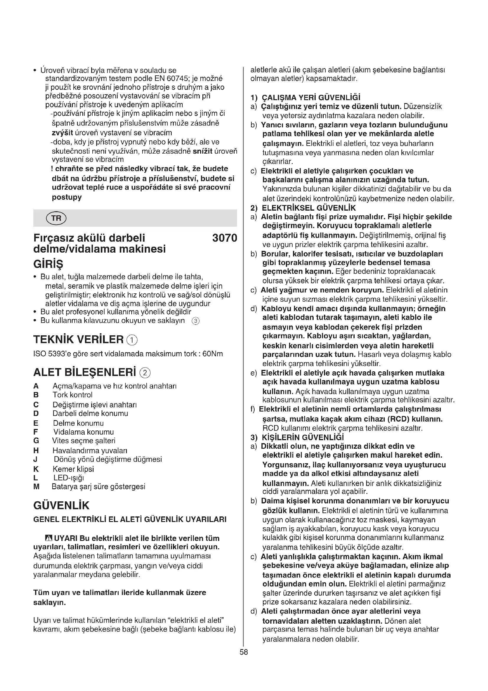 A Açma/kapama ve hız kontrol anahtarı B Tork kontrol C Değiştirme işlevi anahtarı D Darbeli delme konumu E Delme konumu F Vidalama konumu G Vites seçme şalteri H Havalandırma yuvaları J Dönüş yönü değiştirme düğmesi K Kemer klipsi L LED-ışığı M Batarya şarj süre göstergesi