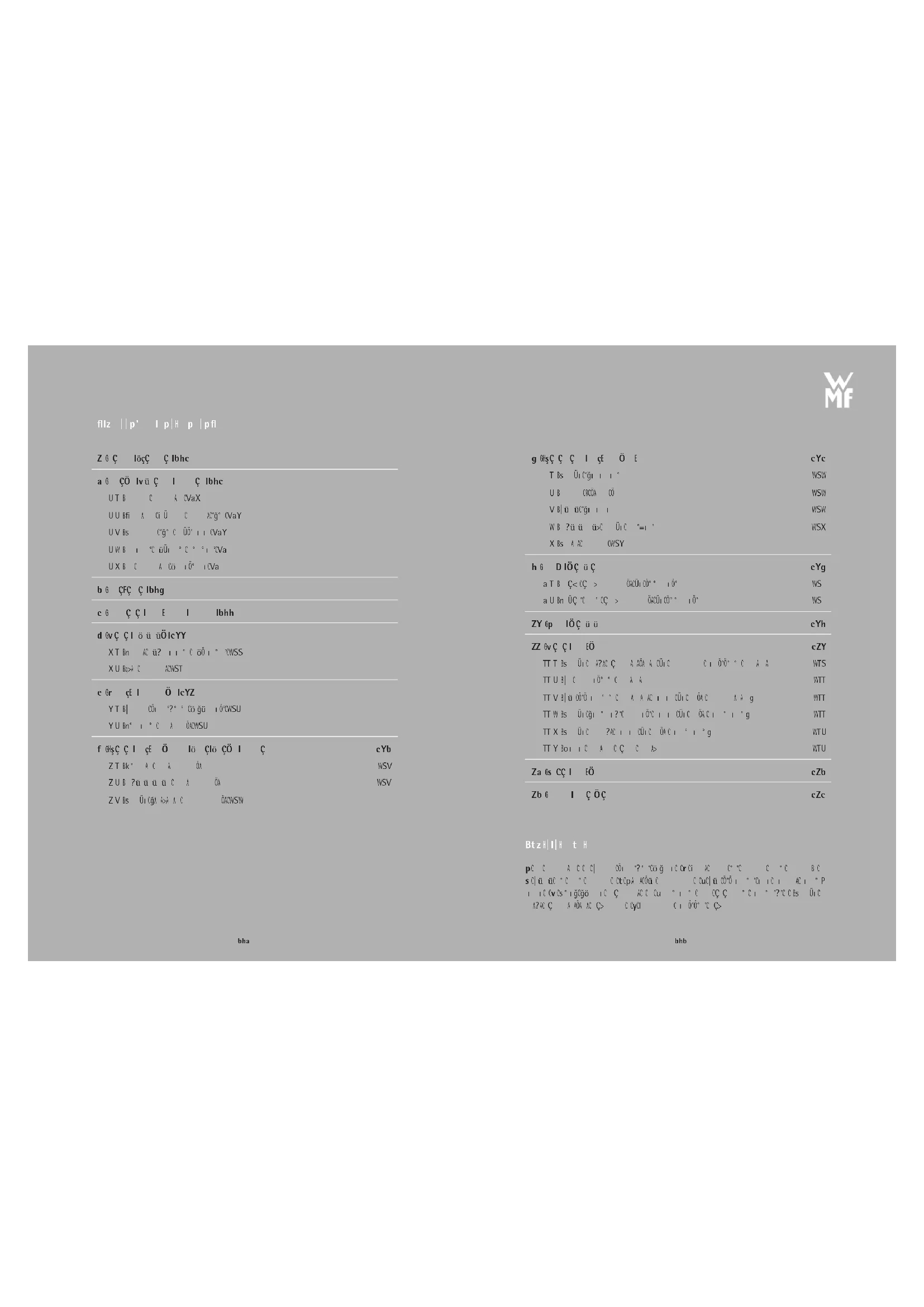 UYARI Elektrik tesisatındaki onarımlar ve elektrik şebekesindeki çalışmalar yalnızca kalifiye bir tek- nisyen tarafından yapılabilir. Bu talimatlara uyulmaması, elektrik çarpması sonucu ölüm riski doğurur. Gözle görülür şekilde hasar görmüş bir cihazı kullanmayın! FONKSİYON PROBLEM DÜZELTİCİ EYLEM Genel işlem Makine bir arıza gösteriyor, yazılım kilitleniyor veya makinenizde bir arıza var. Cihazı kapatın ve fişini çekin, filtreyi çıkarın, bir dakika bekleyin ve cihazı tekrar çalıştırın. Çalıştırmak için Aç/Kapat düğmesini basılı tutun. Aç/Kapat düğmesine basıldığında cihaz açılmıyor. Sigortalarınızı ve prizlerinizi kontrol edin. Elektrik fişinin prize doğru takılıp takılmadığını kontrol edin. Bir döngü sırasında güç kesintisi meydana geliyor. Güç tekrar açıldığında cihaz otomatik olarak yeniden başlayacaktır. Ardından, gerekirse ekran talimatlarını izleyin. Cihazın fişinin çekilmesi ve tekrar takılması isteniyor. Cihazın fişini 20 saniye boyunca çekili bırakın, Claris Aqua Filtre Sistemini çıkarın ve ardından tekrar takın. Hata devam ederse WMF Müşteri Hizmetleri ekibiyle iletişime geçin. Kullanım Kahve öğütücü garip bir ses çıkarıyor. Büyük olasılıkla öğütücüde yabancı cisimler var. Elektrikli süpürge ile temizlemeye çalışın, aksi takdirde WMF Müşteri Hizmetleri ekibi ile iletişime geçin. Kahve inceliği imleci zor hareket ettiriliyor. Öğütücü ayarını yalnızca çalışırken değiştirin. Cihaz kahve yapmıyor veya istenen başka bir tarifi gerçekleştirmiyor. İçeceğin hazırlanması sırasında bir sorun tespit edildi. Cihaz otomatik olarak yeniden başlatıldı ve yeni bir döngü için hazır. Kahve çekirdeği haznesinde kahve çekirdeği yerine öğütülmüş kahve kullandınız. Öğütülmüş kahveyi kahve çekirdeği haznesinden çıkarmak için elektrikli süpürgenizi kullanın. Kahve çekirdeği haznesine yalnızca kahve çekirdeği koyun, diğer ürünlerden (baharat gibi) kaçının Haznede kahve çekirdeği varken bile kahve çekirdeği uyarısı açık durumda Kapağı açabilir ve çekirdekleri elinizle karıştırabilirsiniz. Öğütücüye kolayca girmeyen yağlı, karamelli veya aromalı kahve çekirdekleri kullanmaktan kaçının. Cihazın altında su var. Su haznesini çıkarmadan önce, kahve akışı bittikten sonra cihazın döngüsünü düzgün bir şekilde tamamlaması için 15 saniye bekleyin. Damlama tepsisinin makineye doğru yerleştirilip yerleştirilmediğini kontrol edin; cihaz kullanılmıyorken bile her zaman yerinde olmalıdır. Damlama tepsisi bir döngü sırasında çıkarılmamalıdır.