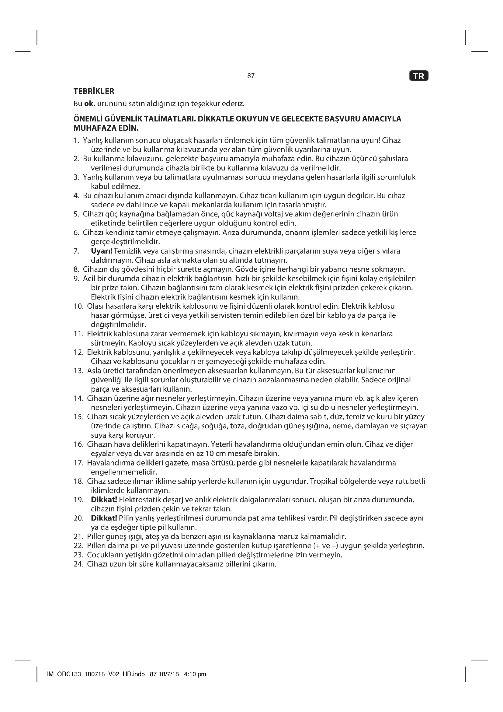 TEBRİKLER Bu ok. ürününü satın aldığınız için teşekkür ederiz. ÖNEMLİ GÜVENLİK TALİMATLARI. DİKKATLE OKUYUN VE GELECEKTE BAŞVURU AMACIYLA MUHAFAZA EDİN.