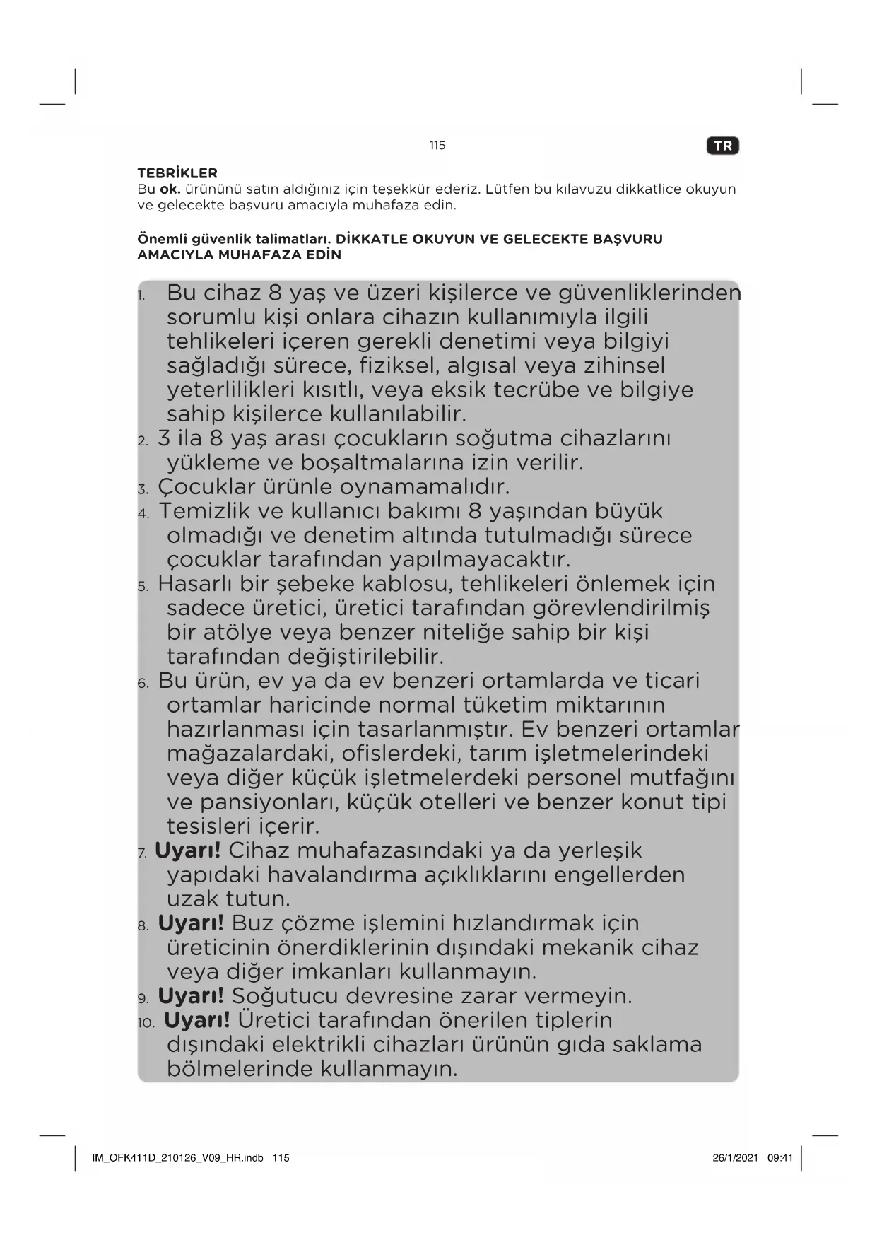 - Sebzeler, meyveler, kümes hayvanları, sığır eti: 6-12 ay. İMHA ETME Bu aygıtı çeşitlerine ayrılmamış belediye çöpüne atmayın. Aygıtı atık elektrikli ve elektronik ekipmanların geri dönüşümü için belirlenen toplama merkezine bırakın. Bu şekilde kaynakların ve çevrenin korunmasına katkıda bulunacaksınız. Daha fazla bilgi için perakende satış mağazasına veya yerel idareye başvurun. Soğutma gazları cihaz hurdaya ayrılmadan önce ulusal ve yerel yönetmeliklere uygun olarak yetkin bir uzman tarafından boşaltılıp bertaraf edilmelidir. IM_OFK411D_210126_V09_HR.indb 123IM_OFK411D_210126_V09_HR.indb 123 26/1/2021 09:4126/1/2021 09:41