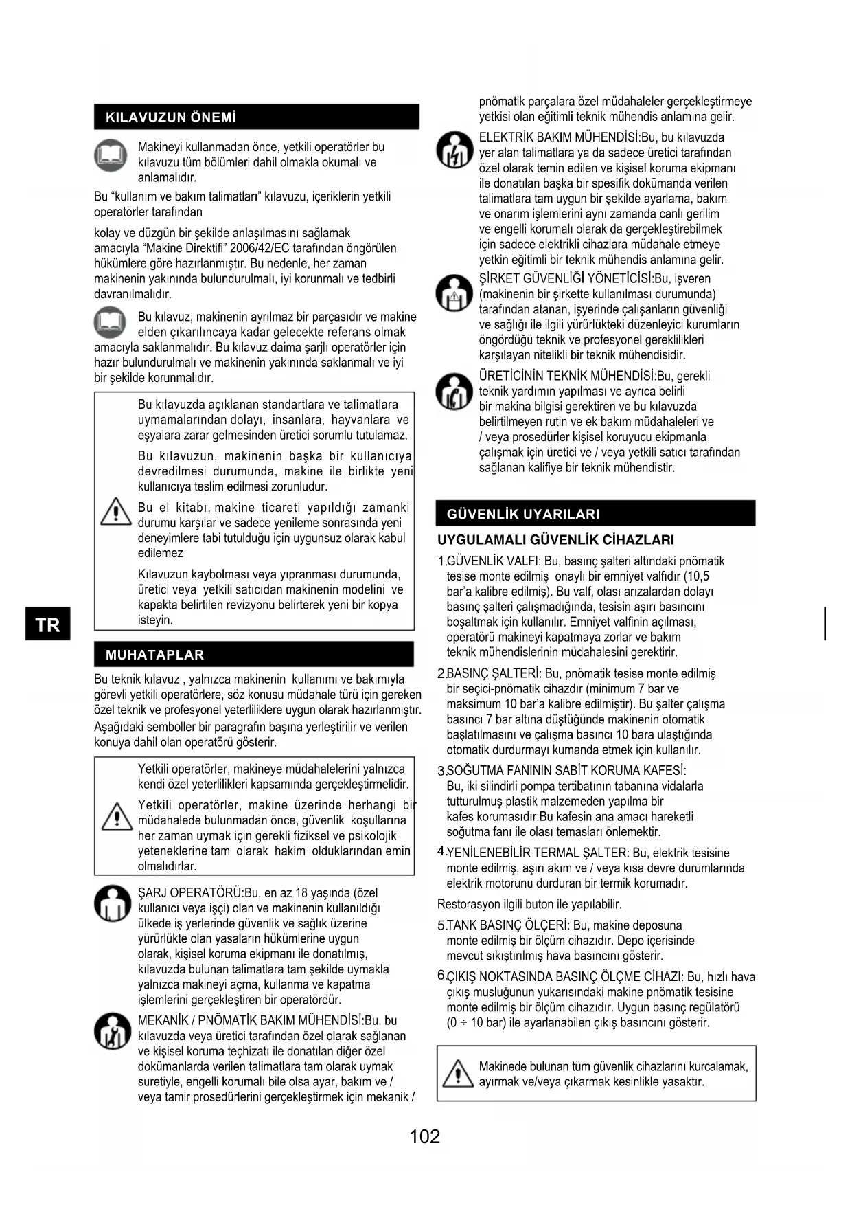İÇİNDEKİLERBu kılavuzda açıklanan standartlara ve talimatlara uymamalarından dolayı, insanlara, hayvanlara ve eşyalara zarar gelmesinden üretici sorumlu tutulamaz. Bu kılavuzun, makinenin başka bir kullanıcıya devredilmesi durumunda, makine ile birlikte yeni kullanıcıya teslim edilmesi zorunludur. Bu el kitabı, makine ticareti yapıldığı zamanki durumu karşılar ve sadece yenileme sonrasında yeni deneyimlere tabi tutulduğu için uygunsuz olarak kabul edilemez Kılavuzun kaybolması veya yıpranması durumunda, üretici veya yetkili satıcıdan makinenin modelini ve kapakta belirtilen revizyonu belirterek yeni bir kopya isteyin. pnömatik parçalara özel müdahaleler gerçekleştirmeye yetkisi olan eğitimli teknik mühendis anlamına gelir. ELEKTRİK BAKIM MÜHENDİSİ:Bu, bu kılavuzda yer alan talimatlara ya da sadece üretici tarafından özel olarak temin edilen ve kişisel koruma ekipmanı ile donatılan başka bir spesik dokümanda verilen talimatlara tam uygun bir şekilde ayarlama, bakım ve onarım işlemlerini aynı zamanda canlı gerilim ve engelli korumalı olarak da gerçekleştirebilmek için sadece elektrikli cihazlara müdahale etmeye yetkin eğitimli bir teknik mühendis anlamına gelir. ŞİRKET GÜVENLİĞİ YÖNETİCİSİ:Bu, işveren (makinenin bir şirkette kullanılması durumunda) tarafından atanan, işyerinde çalışanların güvenliği ve sağlığı ile ilgili yürürlükteki düzenleyici kurumların öngördüğü teknik ve profesyonel gereklilikleri karşılayan nitelikli bir teknik mühendisidir. ÜRETİCİNİN TEKNİK MÜHENDİSİ:Bu, gerekli teknik yardımın yapılması ve ayrıca belirli bir makina bilgisi gerektiren ve bu kılavuzda belirtilmeyen rutin ve ek bakım müdahaleleri ve / veya prosedürler kişisel koruyucu ekipmanla çalışmak için üretici ve / veya yetkili satıcı tarafından sağlanan kaliye bir teknik mühendistir. ŞARJ OPERATÖRÜ:Bu, en az 18 yaşında (özel kullanıcı veya işçi) olan ve makinenin kullanıldığı ülkede iş yerlerinde güvenlik ve sağlık üzerine yürürlükte olan yasaların hükümlerine uygun olarak, kişisel koruma ekipmanı ile donatılmış, kılavuzda bulunan talimatlara tam şekilde uymakla yalnızca makineyi açma, kullanma ve kapatma işlemlerini gerçekleştiren bir operatördür. MEKANİK / PNÖMATİK BAKIM MÜHENDİSİ:Bu, bu kılavuzda veya üretici tarafından özel olarak sağlanan ve kişisel koruma teçhizatı ile donatılan diğer özel dokümanlarda verilen talimatlara tam olarak uymak suretiyle, engelli korumalı bile olsa ayar, bakım ve / veya tamir prosedürlerini gerçekleştirmek için mekanik / Bu teknik kılavuz , yalnızca makinenin kullanımı ve bakımıyla görevli yetkili operatörlere, söz konusu müdahale türü için gereken özel teknik ve profesyonel yeterliliklere uygun olarak hazırlanmıştır. Aşağıdaki semboller bir paragrafın başına yerleştirilir ve verilen konuya dahil olan operatörü gösterir. Bu kılavuz, makinenin ayrılmaz bir parçasıdır ve makine elden çıkarılıncaya kadar gelecekte referans olmak amacıyla saklanmalıdır. Bu kılavuz daima şarjlı operatörler için hazır bulundurulmalı ve makinenin yakınında saklanmalı ve iyi bir şekilde korunmalıdır. Makineyi kullanmadan önce, yetkili operatörler bu kılavuzu tüm bölümleri dahil olmakla okumalı ve anlamalıdır. Bu “kullanım ve bakım talimatları” kılavuzu, içeriklerin yetkili operatörler tarafından kolay ve düzgün bir şekilde anlaşılmasını sağlamak amacıyla “Makine Direkti” 2006/42/EC tarafından öngörülen hükümlere göre hazırlanmıştır. Bu nedenle, her zaman makinenin yakınında bulundurulmalı, iyi korunmalı ve tedbirli davranılmalıdır. KILAVUZUN ÖNEMİ MUHATAPLAR