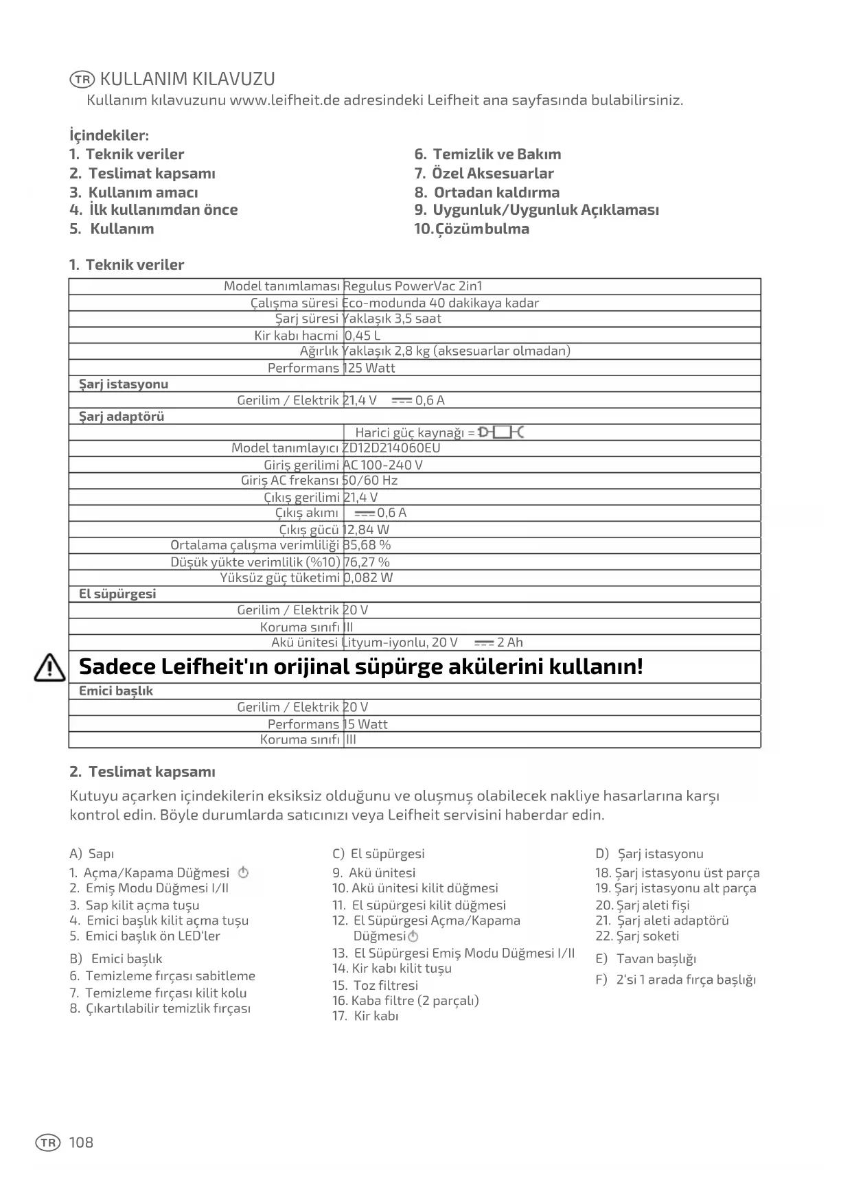 Kutuyu açarken içindekilerin eksiksiz olduğunu ve oluşmuş olabilecek nakliye hasarlarına karşı kontrol edin. Böyle durumlarda satıcınızı veya Leifheit servisini haberdar edin. A) Sapı1. Açma/Kapama Düğmesi 2. Emiş Modu Düğmesi I/II3. Sap kilit açma tuşu4. Emici başlık kilit açma tuşu5. Emici başlık ön LED‘ler B) Emici başlık 6. Temizleme fırçası sabitleme7. Temizleme fırçası kilit kolu8. Çıkartılabilir temizlik fırçasıC) El süpürgesi9. Akü ünitesi10. Akü ünitesi kilit düğmesi11. El süpürgesi kilit düğmesi12. El Süpürgesi Açma/Kapama Düğmesi 13. El Süpürgesi Emiş Modu Düğmesi I/II14. Kir kabı kilit tuşu 15. Toz filtresi16. Kaba filtre (2 parçalı)17. Kir kabıD) Şarj istasyonu18. Şarj istasyonu üst parça19. Şarj istasyonu alt parça 20. Şarj aleti fişi21. Şarj aleti adaptörü22. Şarj soketi E) Tavan başlığı F) 2‘si 1 arada fırça başlığı Z109
