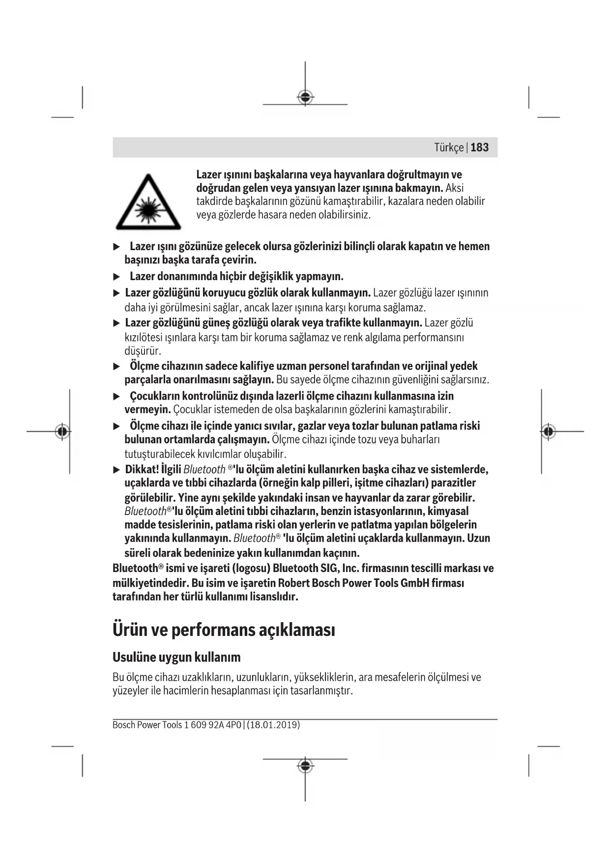 Τα όργανα μέτρησης, οι επαναφορτιζόμενες μπαταρίες/μπαταρίες, τα εξαρτήματα και οι συσκευασίες πρέπει να ανακυκλώνονται με τρόπο φιλικό προς το περιβάλλον. Bosch Power Tools 1 609 92A 4P0 | (18.01.2019)182 | Türkçe Μη ρίχνετε τα όργανα μέτρησης και τις επαναφορτιζόμενες μπαταρίες/ μπαταρίες στα οικιακά απορρίμματα! Μόνο για χώρες τηςΕΕ: Σύμφωνα με την Ευρωπαϊκή οδηγία 2012/19/ΕΕ τα άχρηστα όργανα μέτρησης και σύμφωνα με την Ευρωπαϊκή οδηγία 2006/66/ΕΚ οι χαλασμένες ή χρησιμοποιημένες μπαταρίες δεν είναι πλέον υποχρεωτικό να συλλέγονται ξεχωριστά για να ανακυκλωθούν με τρόπο φιλικό προς το περιβάλλον. Türkçe Güvenlik talimatı Ölçme cihazı ile tehlikesiz ve güvenli biçimde çalışabilmek için bütün güvenlik talimatı ve uyarılar okunmalıdır. Ölçme cihazı bu güvenlik talimatına uygun olarak kullanılmazsa, ölçme cihazına entegre koruyucu donanımların işlevi kısıtlanabilir. Ölçme cihazı üzerindeki uyarı etiketlerini hiçbir zaman görünmez duruma getirmeyin. BU TALİMATLARI İYİ VE GÜVENLİ BİR YERDE SAKLAYIN VE ÖLÇME CİHAZINI BAŞKASINA VERDİĞİNİZDE BUNLARI DA BİRLİKTE VERİN. u Dikkat – Burada anılan kullanım ve ayar donanımlarından farklı donanımlar veya farklı yöntemler kullanıldığı takdirde, tehlikeli ışın yayılımına neden olunabilir. Bu ölçüm aleti bir uyarı etiketi ile teslim edilir (ölçüm aletinin resminin bulunduğu grafik sayfasında (14) numarası ile gösterilmiştir). u Uyarı etiketi üzerindeki metin kendi dilinizde değilse, ilk kullanımdan önce bu etiketin üzerine aletle birlikte teslim edilen kendi dilinizdeki etiketi yapıştırın. 1 609 92A 4P0 | (18.01.2019) Bosch Power ToolsTürkçe | 183 Lazer ışınını başkalarına veya hayvanlara doğrultmayın ve doğrudan gelen veya yansıyan lazer ışınına bakmayın. Aksi takdirde başkalarının gözünü kamaştırabilir, kazalara neden olabilir veya gözlerde hasara neden olabilirsiniz. u Lazer ışını gözünüze gelecek olursa gözlerinizi bilinçli olarak kapatın ve hemen başınızı başka tarafa çevirin. u Lazer donanımında hiçbir değişiklik yapmayın. u Lazer gözlüğünü koruyucu gözlük olarak kullanmayın. Lazer gözlüğü lazer ışınının daha iyi görülmesini sağlar, ancak lazer ışınına karşı koruma sağlamaz. u Lazer gözlüğünü güneş gözlüğü olarak veya trafikte kullanmayın. Lazer gözlü kızılötesi ışınlara karşı tam bir koruma sağlamaz ve renk algılama performansını düşürür. u Ölçme cihazının sadece kalifiye uzman personel tarafından ve orijinal yedek parçalarla onarılmasını sağlayın. Bu sayede ölçme cihazının güvenliğini sağlarsınız. u Çocukların kontrolünüz dışında lazerli ölçme cihazını kullanmasına izin vermeyin. Çocuklar istemeden de olsa başkalarının gözlerini kamaştırabilir. u Ölçme cihazı ile içinde yanıcı sıvılar, gazlar veya tozlar bulunan patlama riski bulunan ortamlarda çalışmayın. Ölçme cihazı içinde tozu veya buharları tutuşturabilecek kıvılcımlar oluşabilir. u Dikkat! İlgili Bluetooth ®'lu ölçüm aletini kullanırken başka cihaz ve sistemlerde, uçaklarda ve tıbbi cihazlarda (örneğin kalp pilleri, işitme cihazları) parazitler görülebilir. Yine aynı şekilde yakındaki insan ve hayvanlar da zarar görebilir. Bluetooth®'lu ölçüm aletini tıbbi cihazların, benzin istasyonlarının, kimyasal madde tesislerinin, patlama riski olan yerlerin ve patlatma yapılan bölgelerin yakınında kullanmayın. Bluetooth® 'lu ölçüm aletini uçaklarda kullanmayın. Uzun süreli olarak bedeninize yakın kullanımdan kaçının. Bluetooth® ismi ve işareti (logosu) Bluetooth SIG, Inc. firmasının tescilli markası ve mülkiyetindedir. Bu isim ve işaretin Robert Bosch Power Tools GmbH firması tarafından her türlü kullanımı lisanslıdır. Ürün ve performans açıklaması Usulüne uygun kullanım Bu ölçme cihazı uzaklıkların, uzunlukların, yüksekliklerin, ara mesafelerin ölçülmesi ve yüzeyler ile hacimlerin hesaplanması için tasarlanmıştır. Bosch Power Tools 1 609 92A 4P0 | (18.01.2019)184 | Türkçe Bu ölçüm aleti, iç mekanlardaki kullanımlara uygundur. Ölçme sonuçları Bluetooth® üzerinden diğer cihazlara aktarılabilir. Şekli gösterilen elemanlar Şekli gösterilen elemanların numaraları ile grafik sayfasındaki ölçme cihazı resmindeki numaralar aynıdır. (1) Artı tuşu [+] (2) Fonksiyon tuşu (3) Bluetooth® tuşu (4) Ölçüm tuşu [ ] (5) Renkli ekran (6) Referans düzlemi seçme tuşu (7) Eksi tuşu [–] (8) Açma/kapama tuşu [ ] (9) Pil haznesi kapağı (10) Pil haznesi kapağı kilidi (11) Seri numarası (12) Algılama merceği (13) Lazer ışını çıkış deliği (14) Lazer uyarı etiketi (15) Lazer gözlüğü