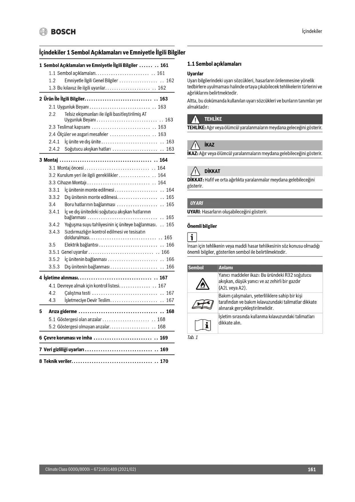 6 Çevre koruması ve imha . . . . . . . . . . . . . . . . . . . . . . . . . . . . 169 7 Veri gizliliği uyarları . . . . . . . . . . . . . . . . . . . . . . . . . . . . . . . . 169 8 Teknik veriler. . . . . . . . . . . . . . . . . . . . . . . . . . . . . . . . . . . . . . 170 Sembol Anlamı Yanıcı maddeler ikazı: Bu üründeki R32 soğutucu akışkan, düşük yanıcı ve az zehirli bir gazdır (A2L veya A2). Bakım çalışmaları, yeterliliklere sahip bir kişi tarafından ve bakım kılavuzundaki talimatlar dikkate alınarak gerçekleştirilmelidir. İşletim sırasında kullanma kılavuzundaki talimatları dikkate alın. OBJ_DCL-6721831489-001.fm Page 161 Wednesday, April 21, 2021 2:52 PMSembol Açıklamaları ve Emniyetle İlgili Bilgiler Climate Class 6000i/8000i – 6721831489 (2021/02)