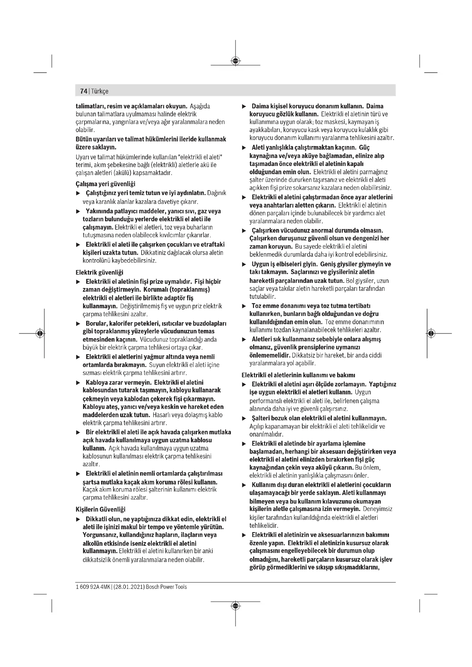 Για την αφαίρεση της μπαταρίας από το ηλεκτρικό εργαλείο, ενεργοποιήστε το ηλεκτρικό εργαλείο τόσο, μέχρι να αδειάσει εντελώς η μπαταρία. Ξεβιδώστε τις βίδες στο περίβλημα και αφαιρέστε το κέλυφος του περιβλήματος, για να αφαιρέσετε την μπαταρία. Για την αποφυγή βραχυκυκλώματος, αποσυνδέστε τις συνδέσεις στην μπαταρία ξεχωριστά τη μια μετά την άλλη και μονώστε στη συνέχεια τους πόλους. Επίσης, ακόμη και σε πλήρη αποφόρτιση υπάρχει μια υπόλοιπη χωρητικότητα (φορτίο) στην μπαταρία, που σε περίπτωση βραχυκυκλώματος μπορεί να ελευθερωθεί. Türkçe Güvenlik talimatı Elektrikli el aletleri için genel güvenlik uyarıları UYARI Bu elektrikli el aletiyle birlikte gelen tüm güvenlik uyarılarını, Bosch Power Tools 1 609 92A 4MK | (28.01.2021)74 | Türkçe talimatları, resim ve açıklamaları okuyun. Aşağıda bulunan talimatlara uyulmaması halinde elektrik çarpmalarına, yangınlara ve/veya ağır yaralanmalara neden olabilir. Bütün uyarıları ve talimat hükümlerini ileride kullanmak üzere saklayın. Uyarı ve talimat hükümlerinde kullanılan "elektrikli el aleti" terimi, akım şebekesine bağlı (elektrikli) aletlerle akü ile çalışan aletleri (akülü) kapsamaktadır. Çalışma yeri güvenliği u Çalıştığınız yeri temiz tutun ve iyi aydınlatın. Dağınık veya karanlık alanlar kazalara davetiye çıkarır. u Yakınında patlayıcı maddeler, yanıcı sıvı, gaz veya tozların bulunduğu yerlerde elektrikli el aleti ile çalışmayın. Elektrikli el aletleri, toz veya buharların tutuşmasına neden olabilecek kıvılcımlar çıkarırlar. u Elektrikli el aleti ile çalışırken çocukları ve etraftaki kişileri uzakta tutun. Dikkatiniz dağılacak olursa aletin kontrolünü kaybedebilirsiniz. Elektrik güvenliği u Elektrikli el aletinin fişi prize uymalıdır. Fişi hiçbir zaman değiştirmeyin. Korumalı (topraklanmış) elektrikli el aletleri ile birlikte adaptör fiş kullanmayın. Değiştirilmemiş fiş ve uygun priz elektrik çarpma tehlikesini azaltır. u Borular, kalorifer petekleri, ısıtıcılar ve buzdolapları gibi topraklanmış yüzeylerle vücudunuzun temas etmesinden kaçının. Vücudunuz topraklandığı anda büyük bir elektrik çarpma tehlikesi ortaya çıkar. u Elektrikli el aletlerini yağmur altında veya nemli ortamlarda bırakmayın. Suyun elektrikli el aleti içine sızması elektrik çarpma tehlikesini artırır. u Kabloya zarar vermeyin. Elektrikli el aletini kablosundan tutarak taşımayın, kabloyu kullanarak çekmeyin veya kablodan çekerek fişi çıkarmayın. Kabloyu ateş, yanıcı ve/veya keskin ve hareket eden maddelerden uzak tutun. Hasarlı veya dolaşmış kablo elektrik çarpma tehlikesini artırır. u Bir elektrikli el aleti ile açık havada çalışırken mutlaka açık havada kullanılmaya uygun uzatma kablosu kullanın. Açık havada kullanılmaya uygun uzatma kablosunun kullanılması elektrik çarpma tehlikesini azaltır. u Elektrikli el aletinin nemli ortamlarda çalıştırılması şartsa mutlaka kaçak akım koruma rölesi kullanın. Kaçak akım koruma rölesi şalterinin kullanımı elektrik çarpma tehlikesini azaltır. Kişilerin Güvenliği u Dikkatli olun, ne yaptığınıza dikkat edin, elektrikli el aleti ile işinizi makul bir tempo ve yöntemle yürütün. Yorgunsanız, kullandığınız hapların, ilaçların veya alkolün etkisinde iseniz elektrikli el aletini kullanmayın. Elektrikli el aletini kullanırken bir anki dikkatsizlik önemli yaralanmalara neden olabilir. u Daima kişisel koruyucu donanım kullanın. Daima koruyucu gözlük kullanın. Elektrikli el aletinin türü ve kullanımına uygun olarak; toz maskesi, kaymayan iş ayakkabıları, koruyucu kask veya koruyucu kulaklık gibi koruyucu donanım kullanımı yaralanma tehlikesini azaltır. u Aleti yanlışlıkla çalıştırmaktan kaçının. Güç kaynağına ve/veya aküye bağlamadan, elinize alıp taşımadan önce elektrikli el aletinin kapalı olduğundan emin olun. Elektrikli el aletini parmağınız şalter üzerinde dururken taşırsanız ve elektrikli el aleti açıkken fişi prize sokarsanız kazalara neden olabilirsiniz. u Elektrikli el aletini çalıştırmadan önce ayar aletlerini veya anahtarları aletten çıkarın. Elektrikli el aletinin dönen parçaları içinde bulunabilecek bir yardımcı alet yaralanmalara neden olabilir. u Çalışırken vücudunuz anormal durumda olmasın. Çalışırken duruşunuz güvenli olsun ve dengenizi her zaman koruyun. Bu sayede elektrikli el aletini beklenmedik durumlarda daha iyi kontrol edebilirsiniz. u Uygun iş elbiseleri giyin. Geniş giysiler giymeyin ve takı takmayın. Saçlarınızı ve giysileriniz aletin hareketli parçalarından uzak tutun. Bol giysiler, uzun saçlar veya takılar aletin hareketli parçaları tarafından tutulabilir. u Toz emme donanımı veya toz tutma tertibatı kullanırken, bunların bağlı olduğundan ve doğru kullanıldığından emin olun. Toz emme donanımının kullanımı tozdan kaynalanabilecek tehlikeleri azaltır. u Aletleri sık kullanmanız sebebiyle onlara alışmış olmanız, güvenlik prensiplerine uymanızı önlememelidir. Dikkatsiz bir hareket, bir anda ciddi yaralanmalara yol açabilir. Elektrikli el aletlerinin kullanımı ve bakımı u Elektrikli el aletini aşırı ölçüde zorlamayın. Yaptığınız işe uygun elektrikli el aletleri kullanın. Uygun performanslı elektrikli el aleti ile, belirlenen çalışma alanında daha iyi ve güvenli çalışırsınız. u Şalteri bozuk