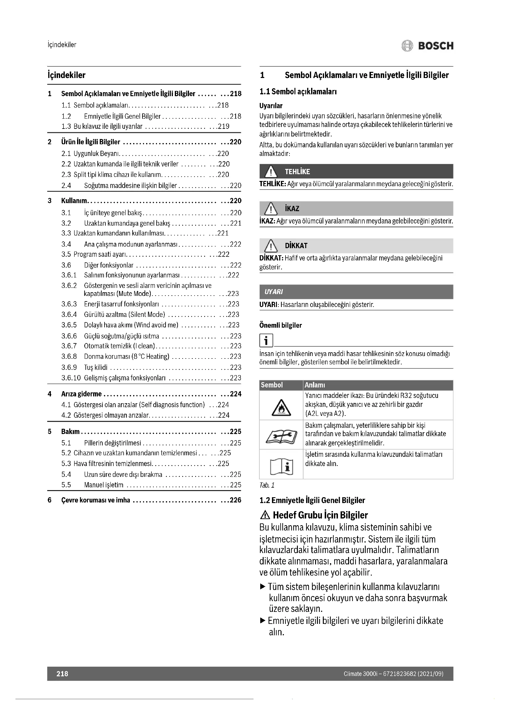 H Hedef Grubu İçin Bilgiler Bu kullanma kılavuzu, klima sisteminin sahibi ve işletmecisi için hazırlanmıştır. Sistem ile ilgili tüm kılavuzlardaki talimatlara uyulmalıdır. Talimatların dikkate alınmaması, maddi hasarlara, yaralanmalara ve ölüm tehlikesine yol açabilir. ▶ Tüm sistem bileşenlerinin kullanma kılavuzlarını kullanım öncesi okuyun ve daha sonra başvurmak üzere saklayın. ▶ Emniyetle ilgili bilgileri ve uyarı bilgilerini dikkate alın. 1 Sembol Açıklamaları ve Emniyetle İlgili Bilgiler . . . . . . . . .218