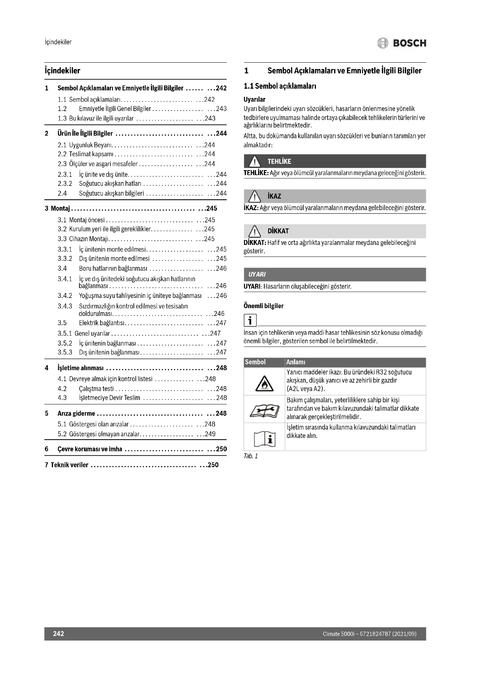 6 Çevre koruması ve imha . . . . . . . . . . . . . . . . . . . . . . . . . . . . .250 7 Teknik veriler . . . . . . . . . . . . . . . . . . . . . . . . . . . . . . . . . . . . . .250 Sembol Anlamı Yanıcı maddeler ikazı: Bu üründeki R32 soğutucu akışkan, düşük yanıcı ve az zehirli bir gazdır (A2L veya A2). Bakım çalışmaları, yeterliliklere sahip bir kişi tarafından ve bakım kılavuzundaki talimatlar dikkate alınarak gerçekleştirilmelidir. İşletim sırasında kullanma kılavuzundaki talimatları dikkate alın.Sembol Açıklamaları ve Emniyetle İlgili Bilgiler