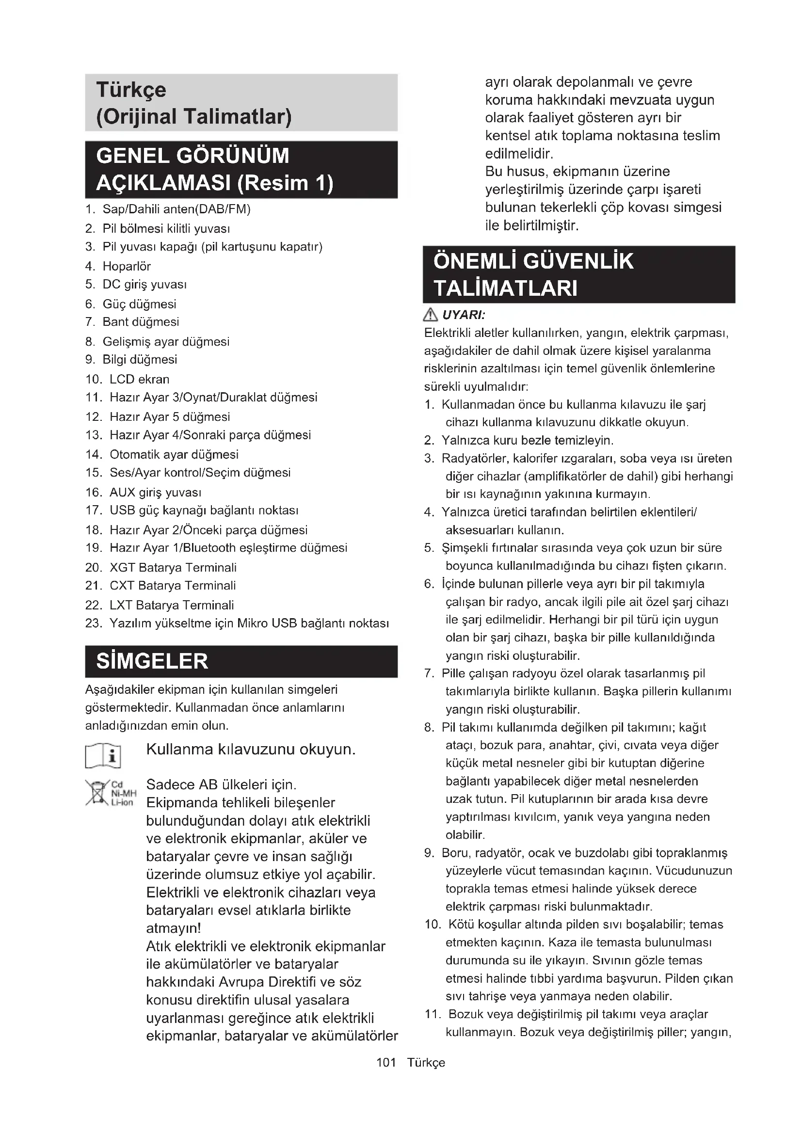 1. Kullanmadan önce bu kullanma kılavuzu ile şarj