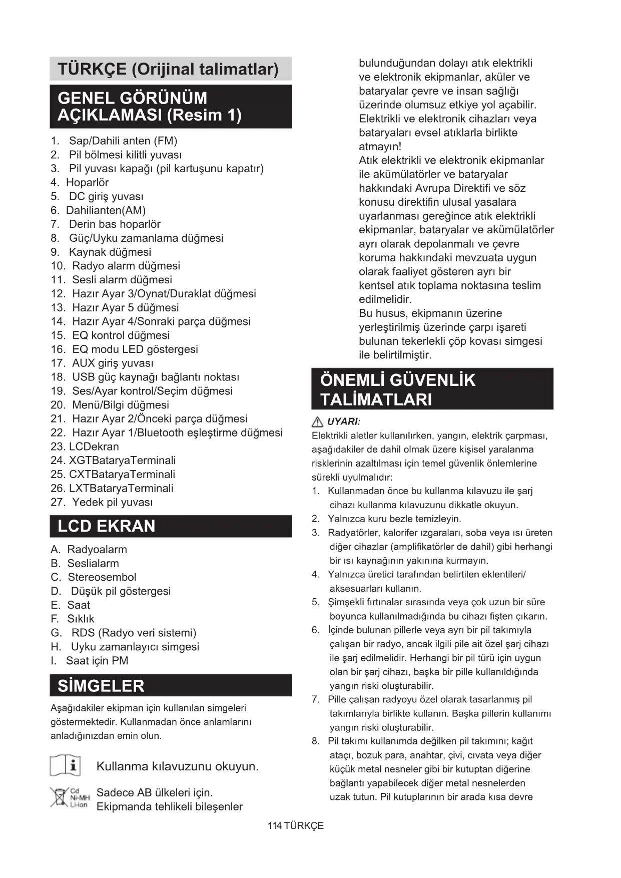 çalışanbirradyo,ancakilgilipileaitözelşarjcihazı ileşarjedilmelidir.Herhangibirpiltürüiçinuygun olanbirşarjcihazı,başkabirpillekullanıldığında yangınriskioluşturabilir.
